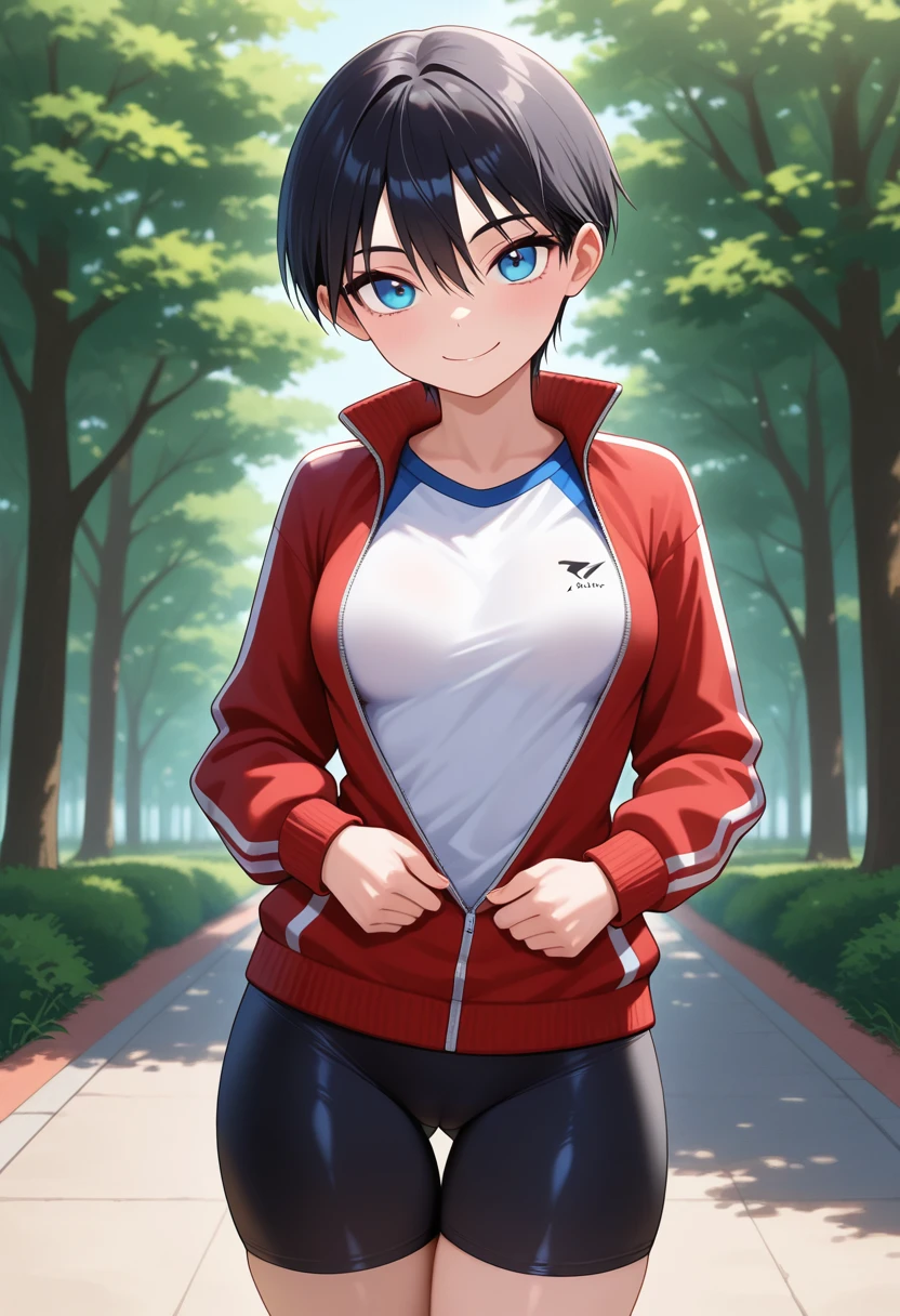 track jacket, partially unzipped, shirt, long sleeves, bike shorts, no socks, sneakers,