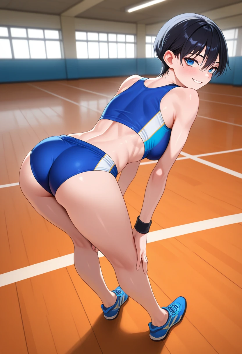 track uniform, two-tone sports bra, blue sports bra, wristband, blue buruma, no socks, sneakers,