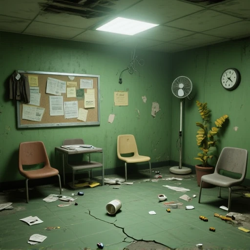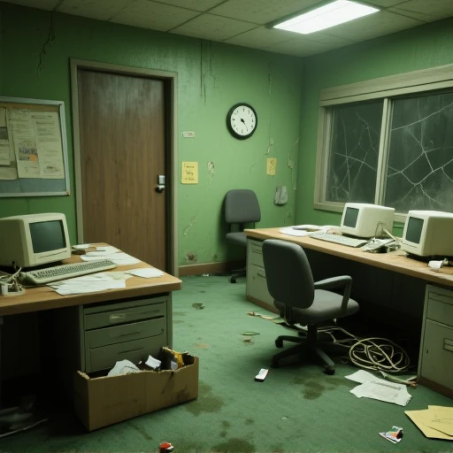 photorealistic, abandoned interior, 1970s architecture, olive green walls, peeling paint, water stains, cracked surfaces, dusty environment, office decay, institutional setting, warm dirty lighting, flickering fluorescent lights, stained tiles, scratched furniture, outdated technology, cobwebs in corners, analog atmosphere, realistic textures, cluttered space, environmental storytelling, no modern objects, grimy walls, broken equipment, low saturation colors, atmospheric shadows, neglected building, retro setting, worn materials, cinematic decay, immersive background
