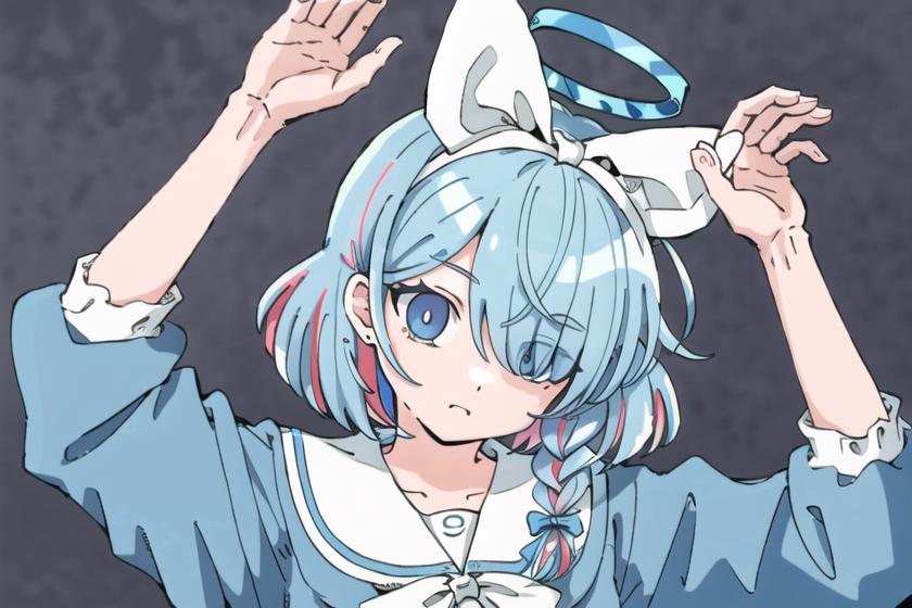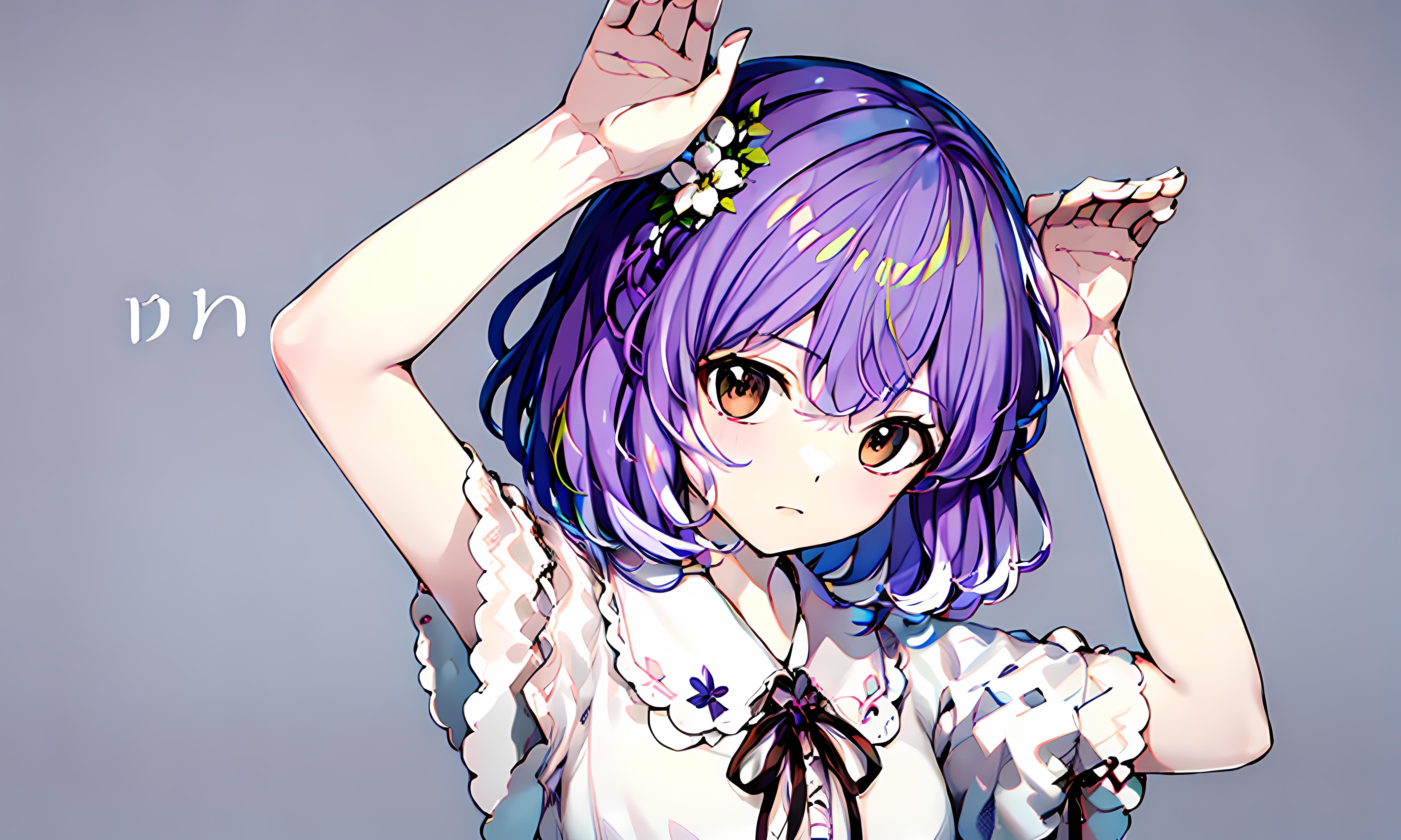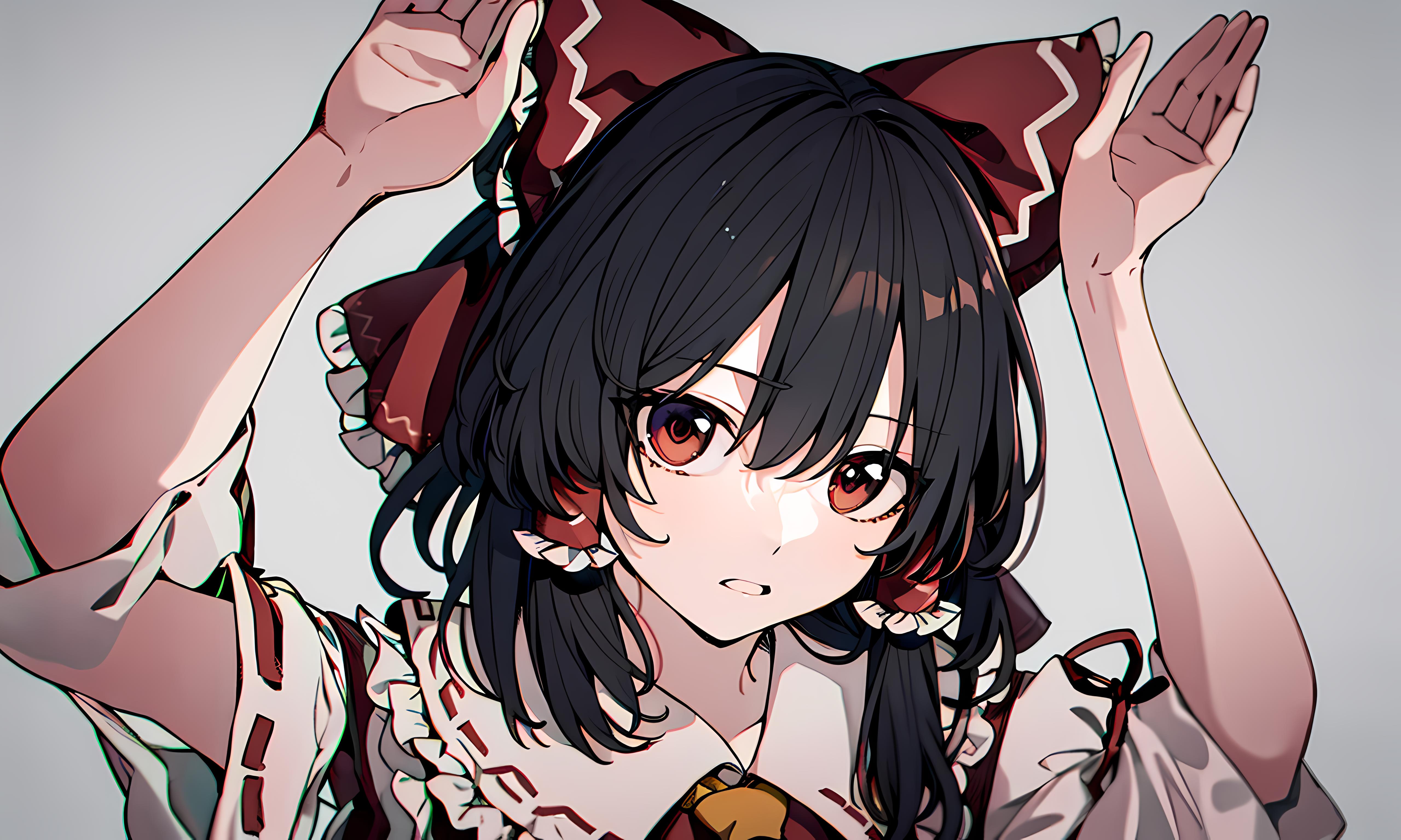 recommended prompt(Unmasked): phony, 1girl, solo, looking at viewer, simple background, upper body, grey background, arms up, bunny pose