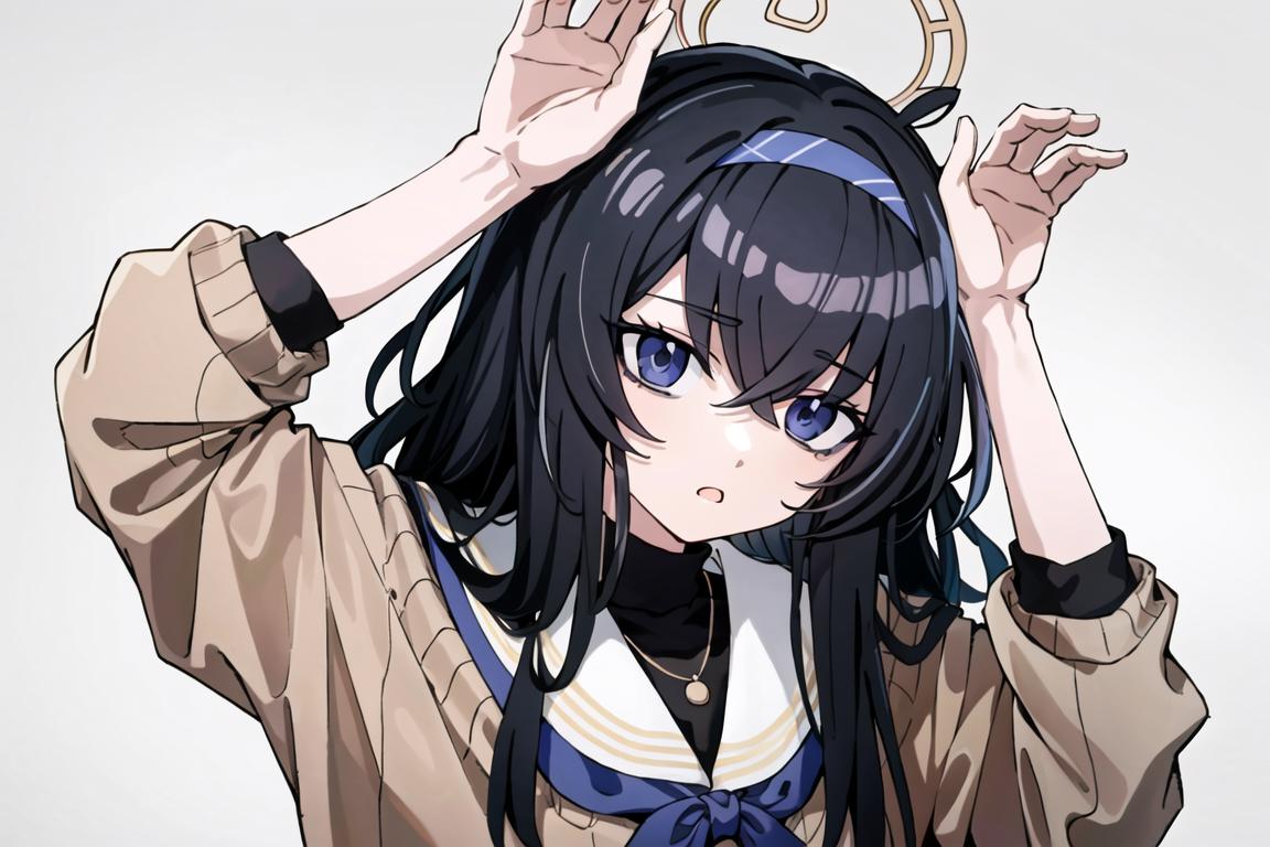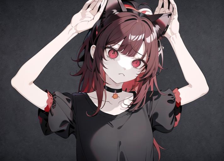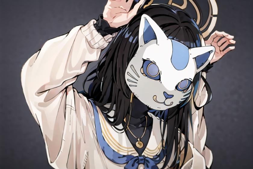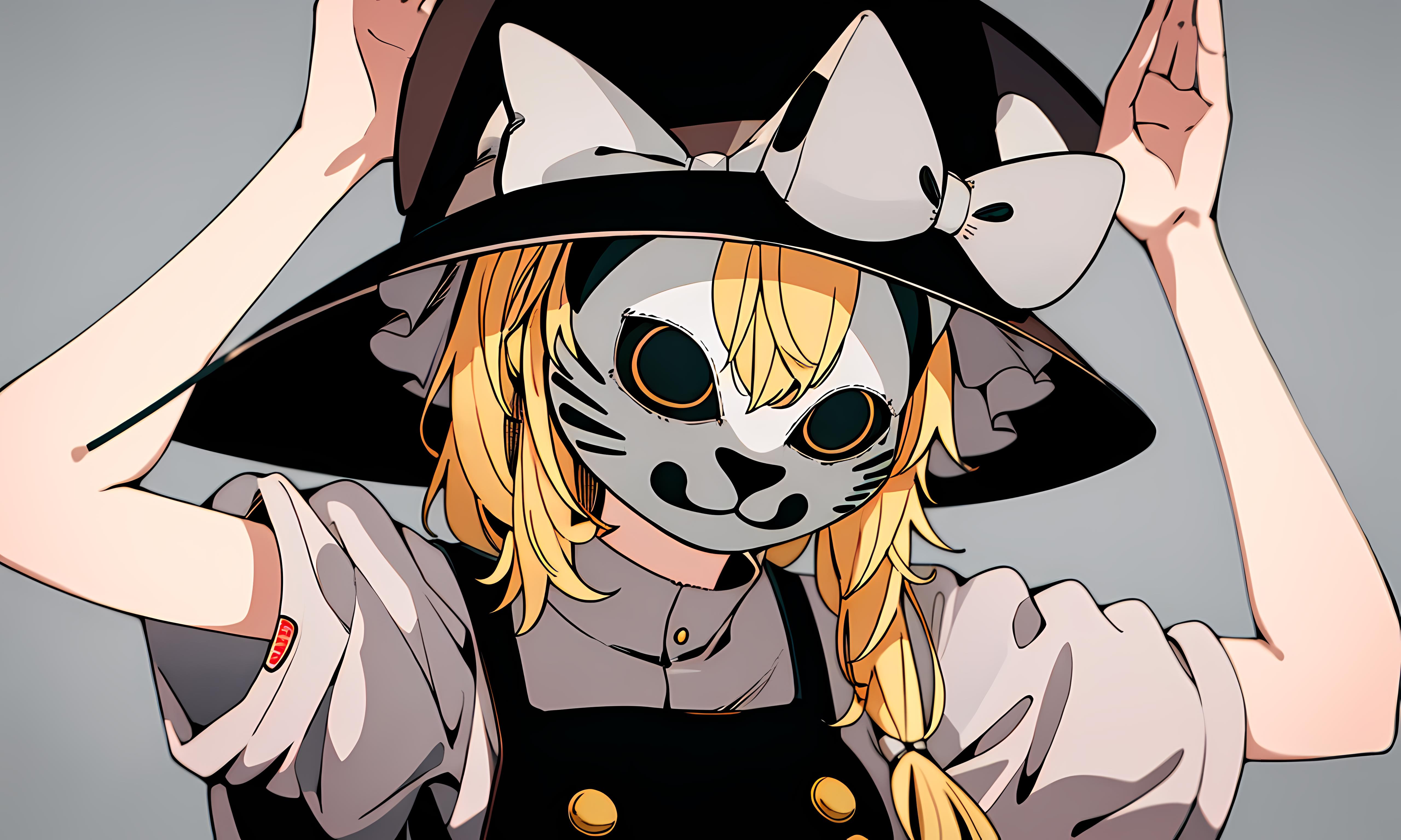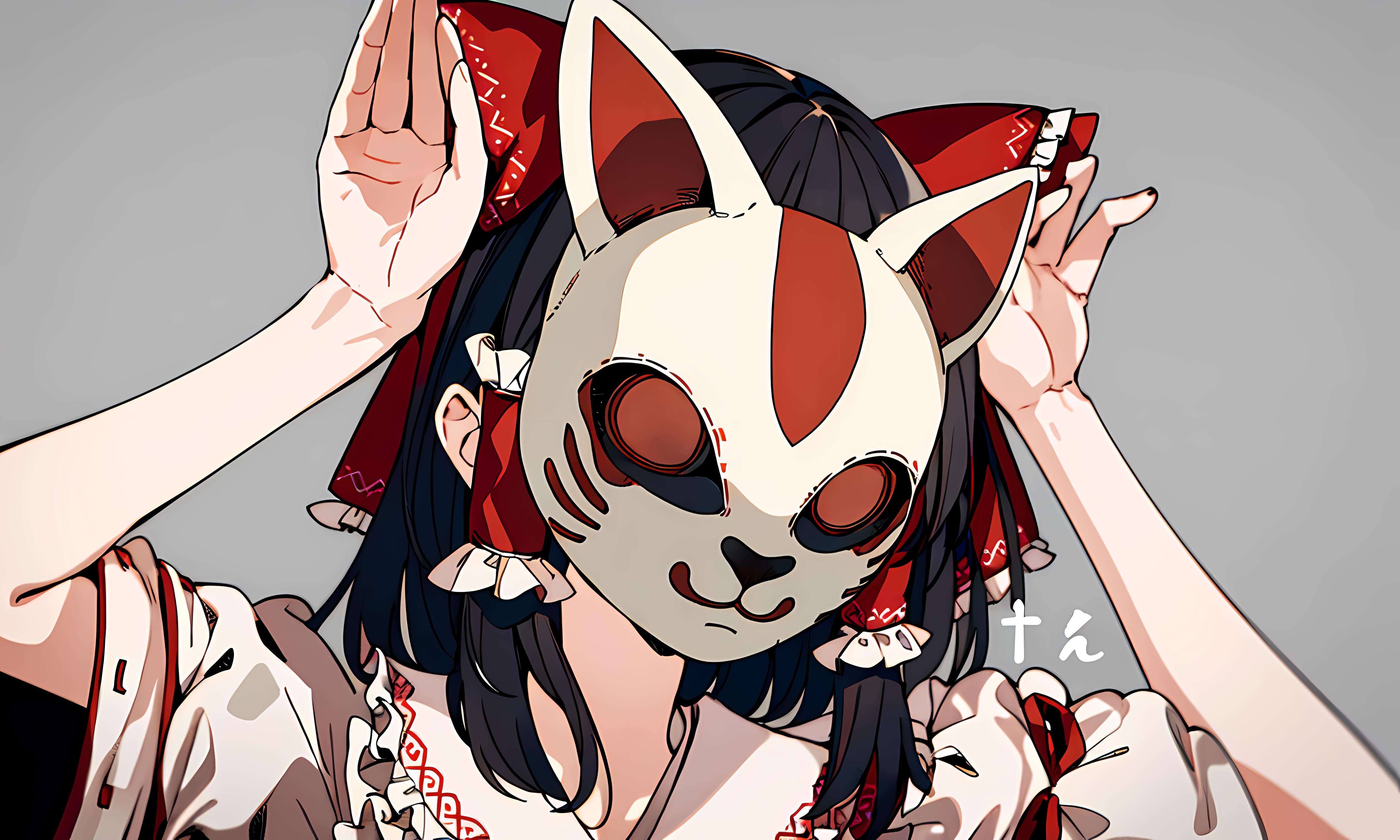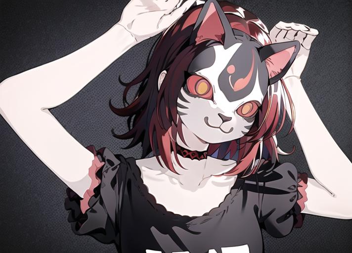 recommended prompt(masked): phony, 1girl, solo, looking at viewer, simple background, upper body, grey background, mask, cat mask, arms up, bunny pose