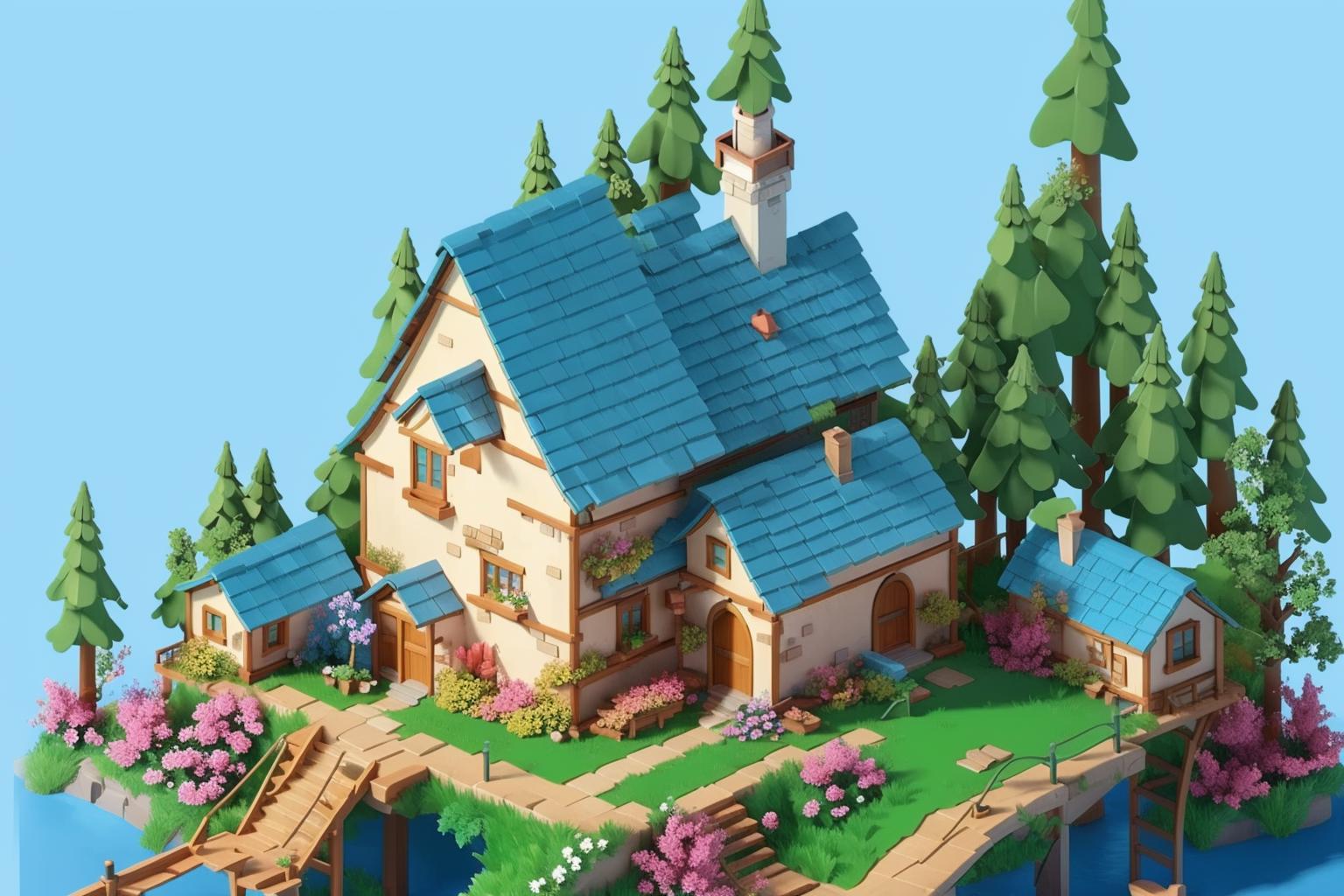 用了一百张训练图;尺寸是768x512,描述词简单描述就好了,例如无人,楼梯,蓝色背景,风景,绿色屋顶,房子,窗户,烟囱,简单的背景,梯子,台阶,门,房子,建筑,砖,从上面看,屋顶,灯光,高空视角,chibi,从上到下看。