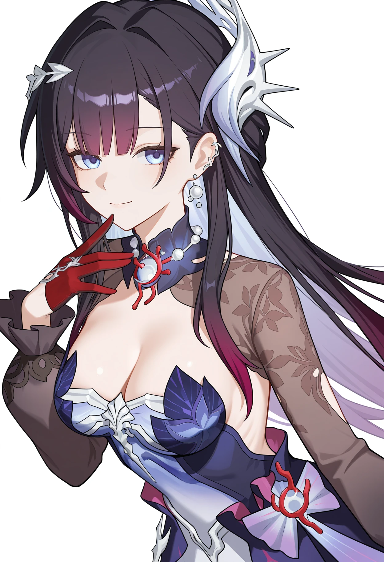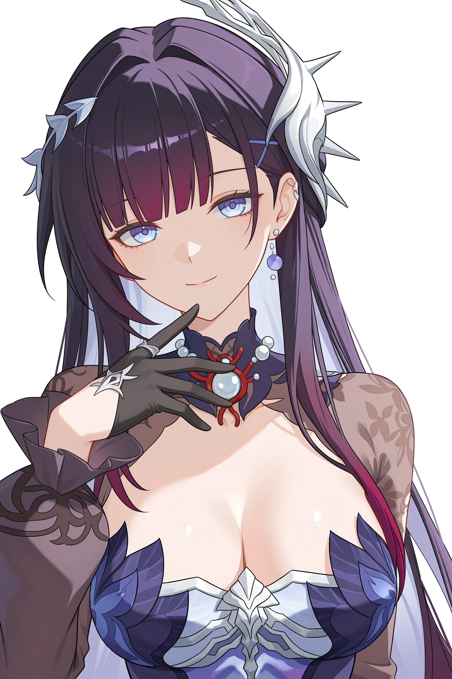 red glove,see-through,black thighhighs,torn thighhighs,single earring,ribs,strapless dress,purple dress,long sleeves,hair ornament,blue dress,black gloves,half gloves,