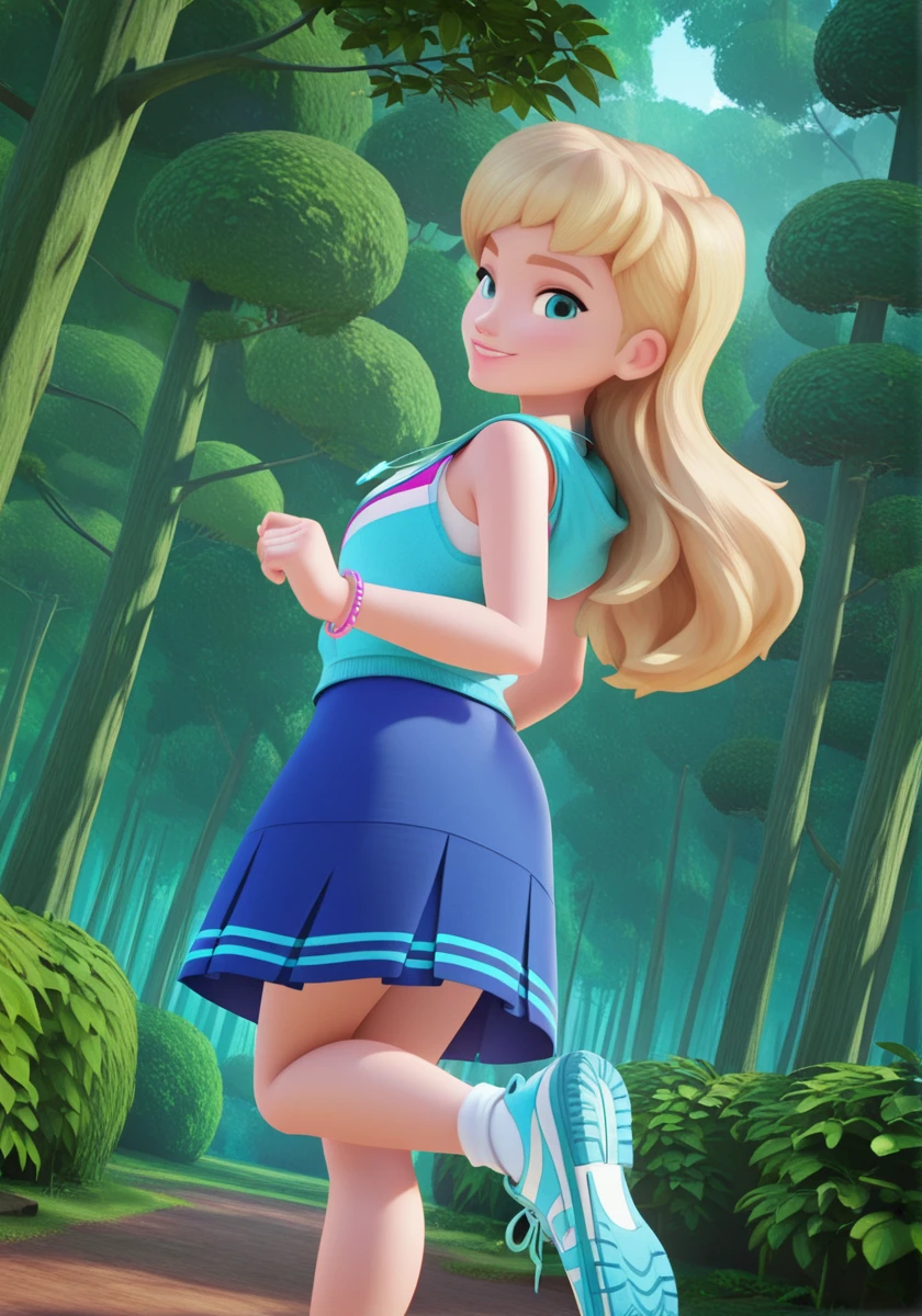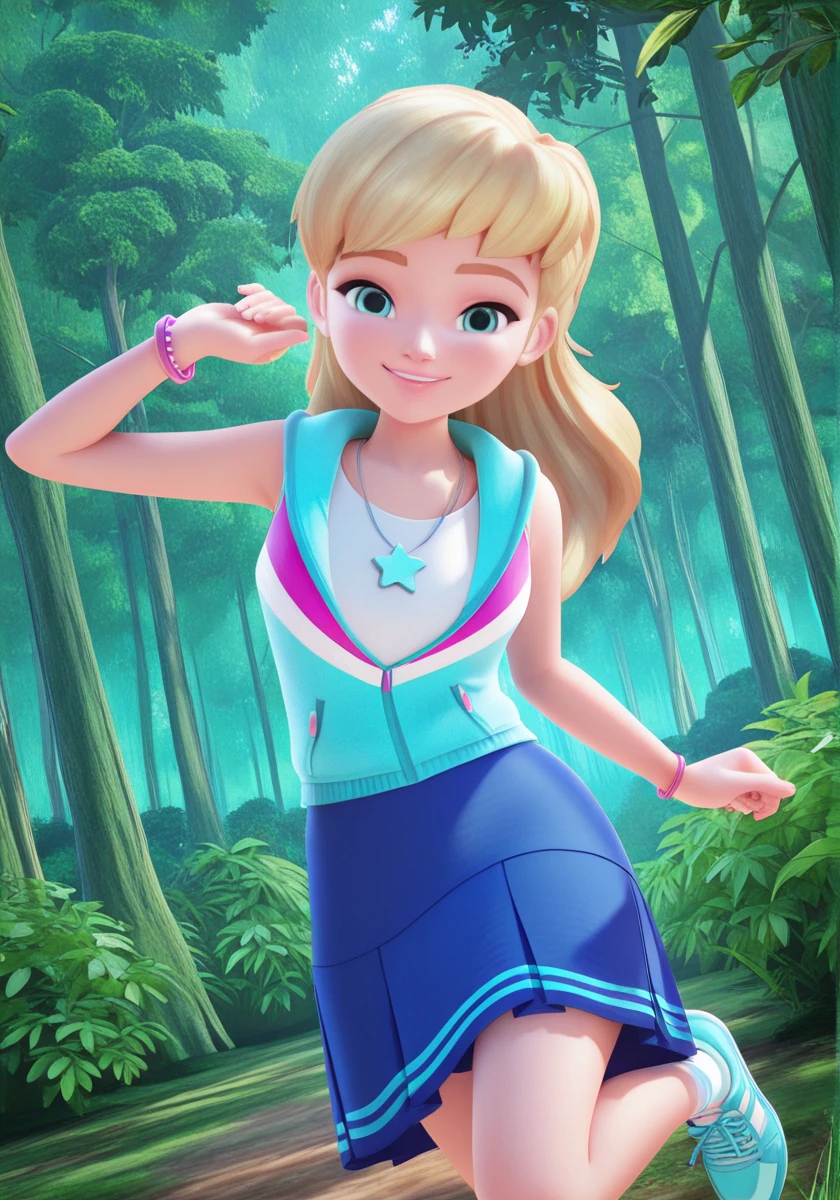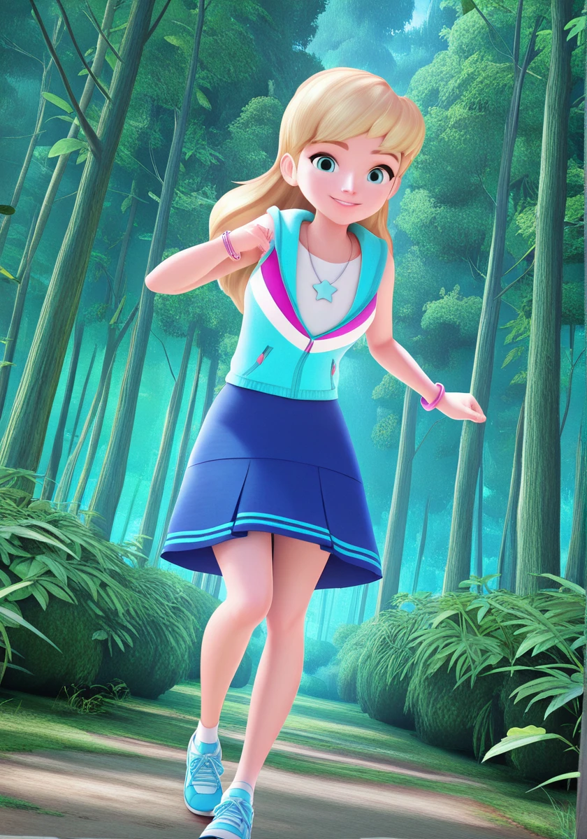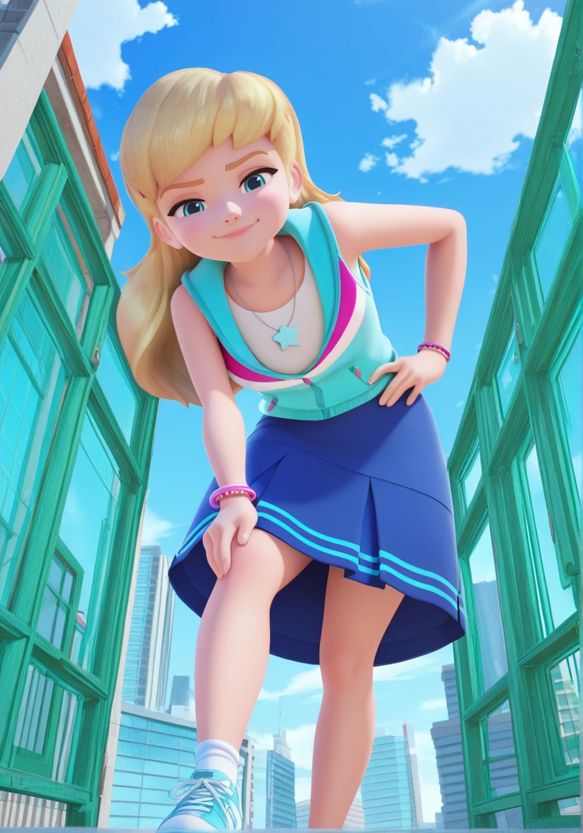 stephanie_illus, blue eyes, long hair, blonde hair, blue skirt, shirt, sleeveless hoodie, necklace, bracelet, socks, blue shoes, sneakers,