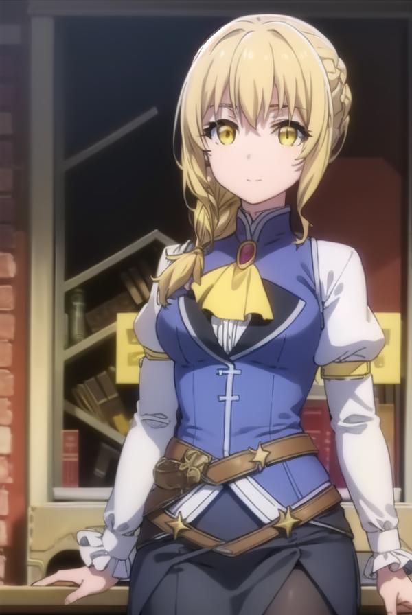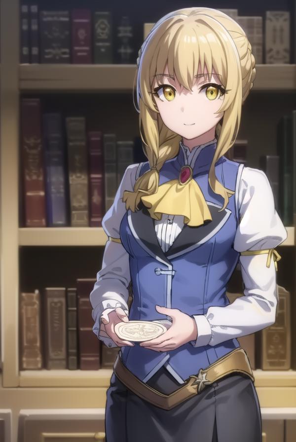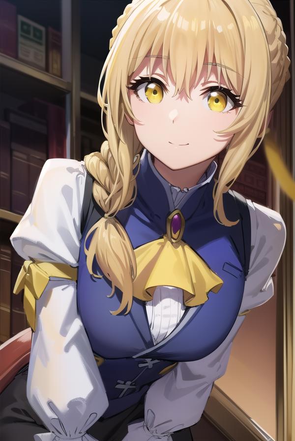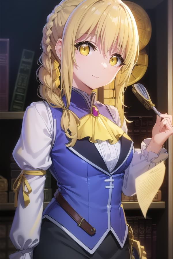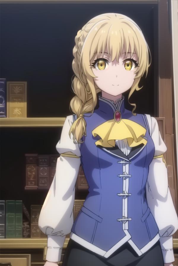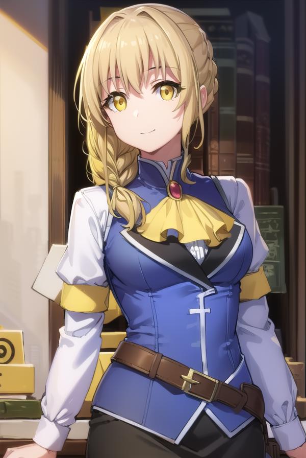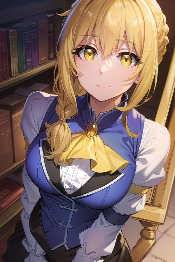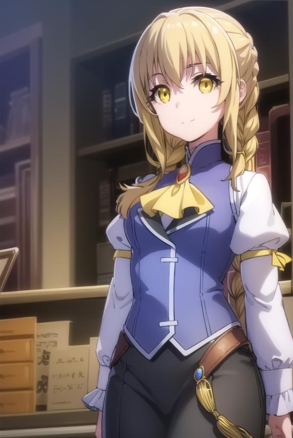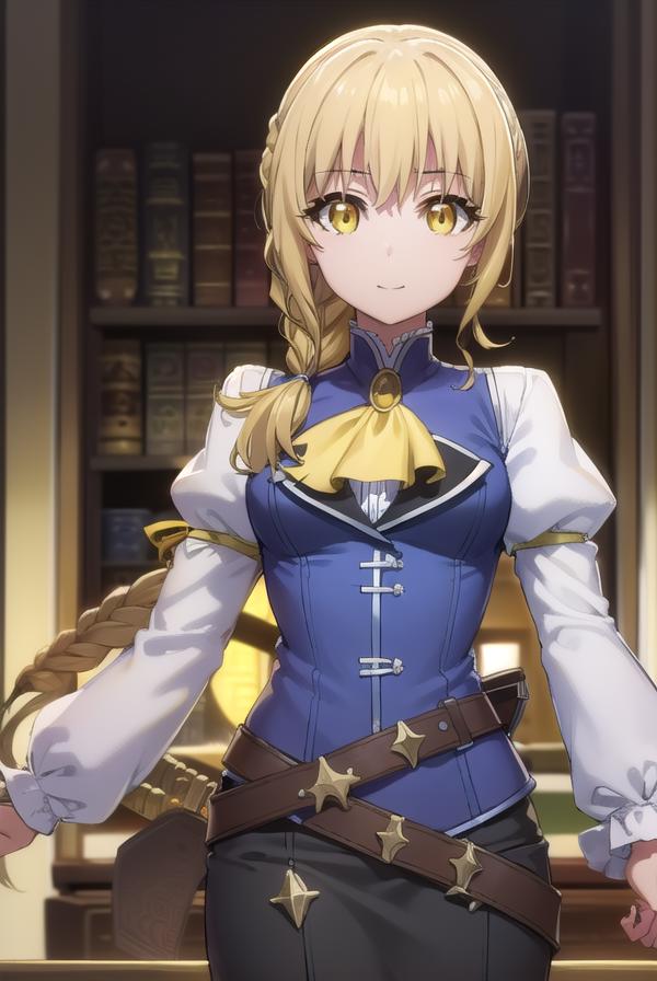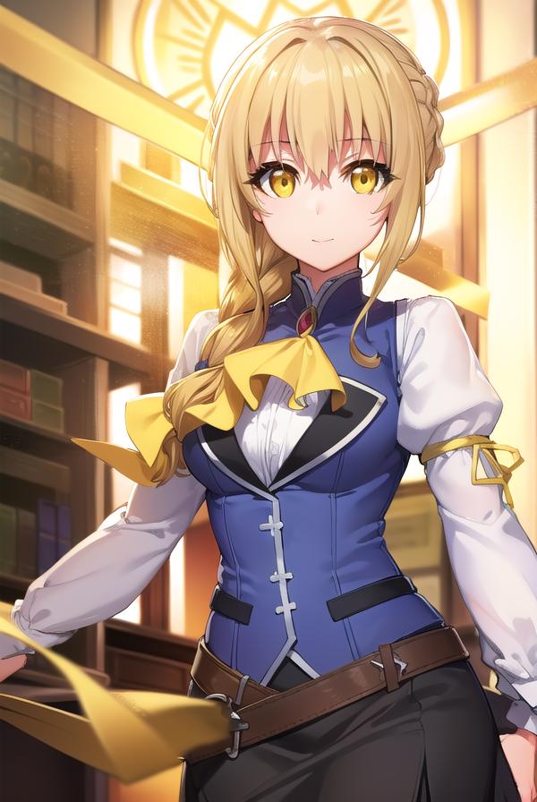 guild girl, long hair, blonde hair, (yellow eyes:1.5), braid, single braid,