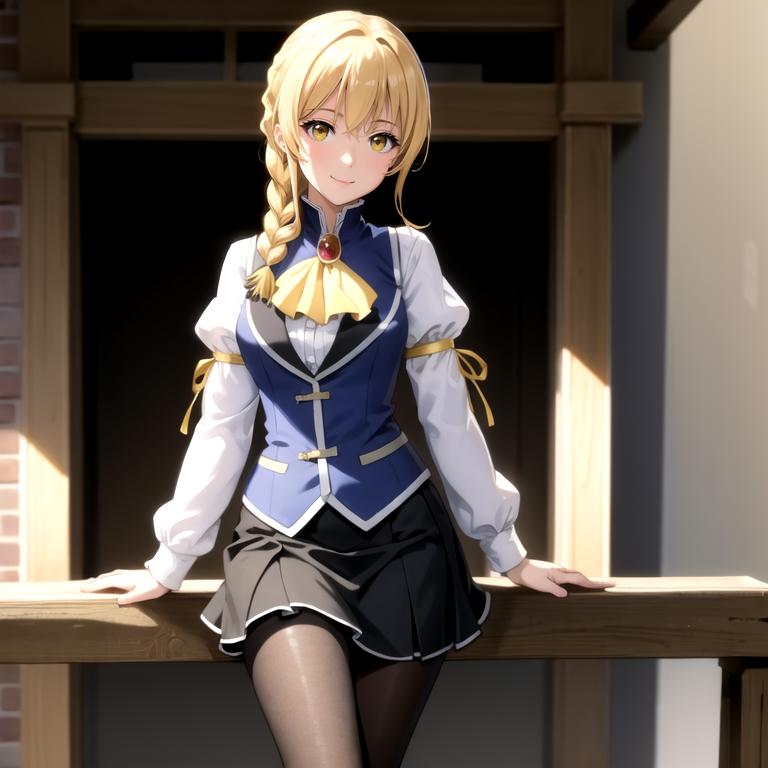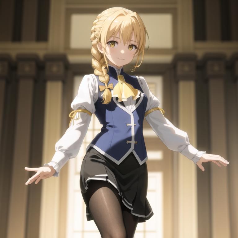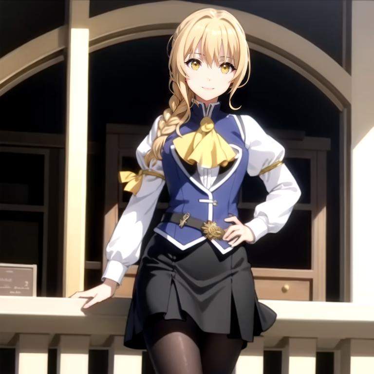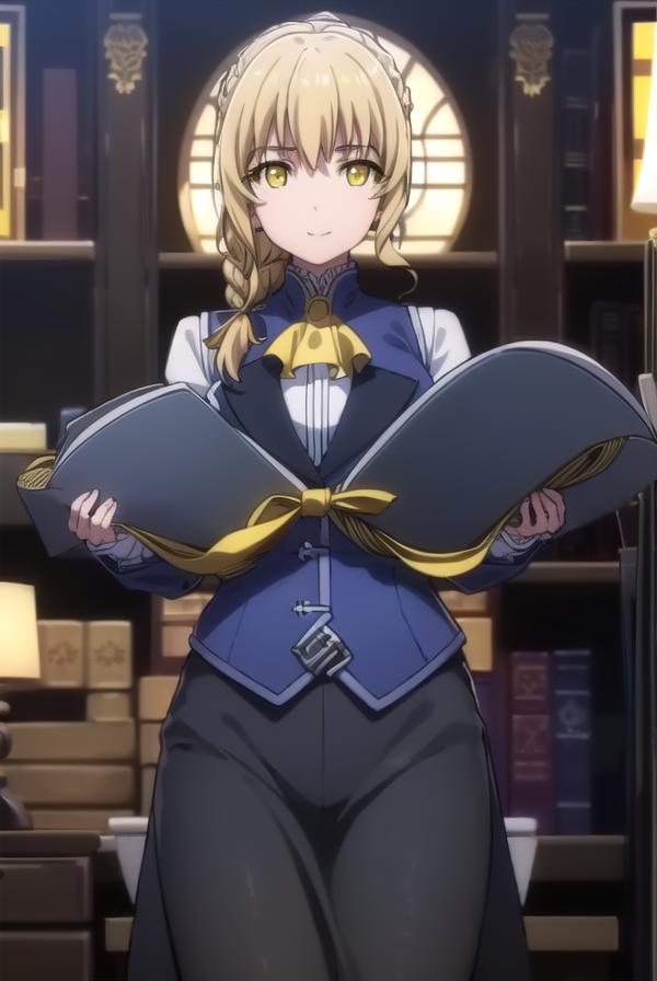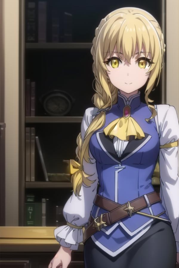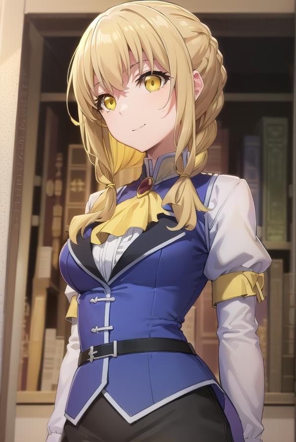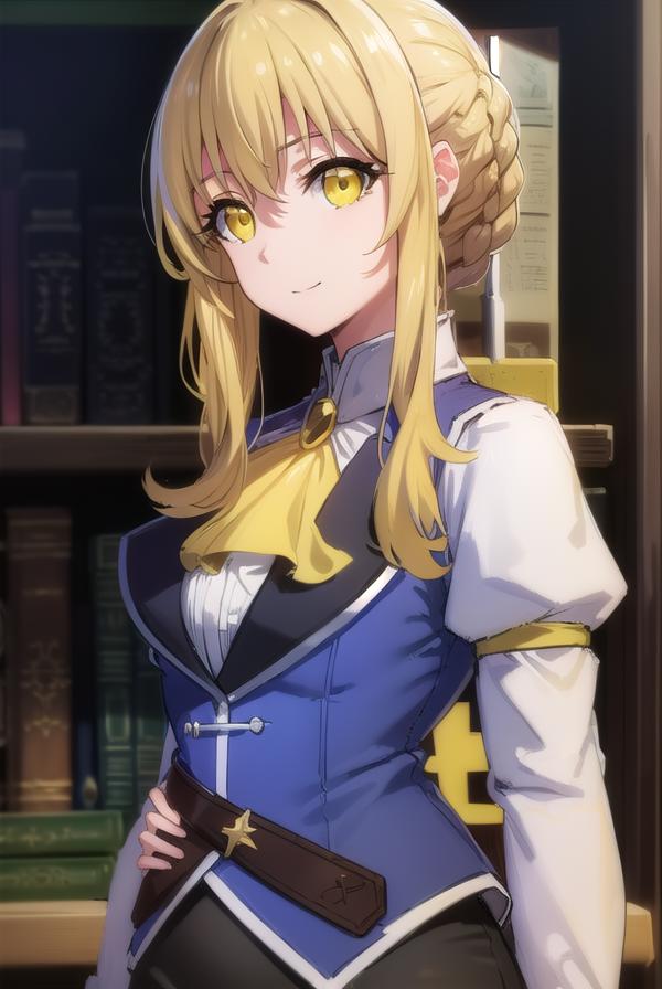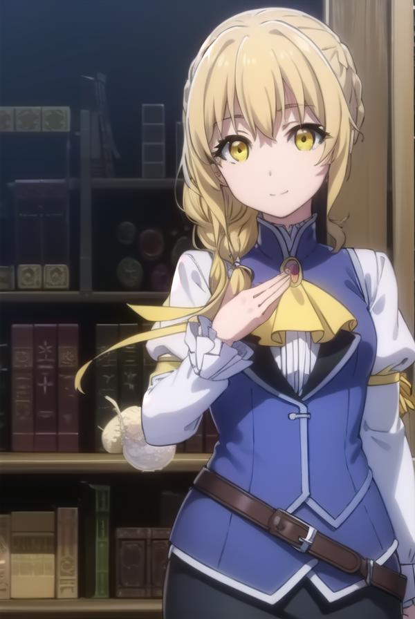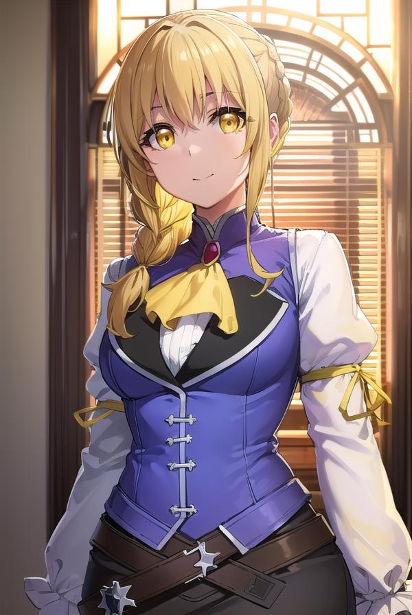 guild girl, long hair, blonde hair, (yellow eyes:1.5), braid, single braid,