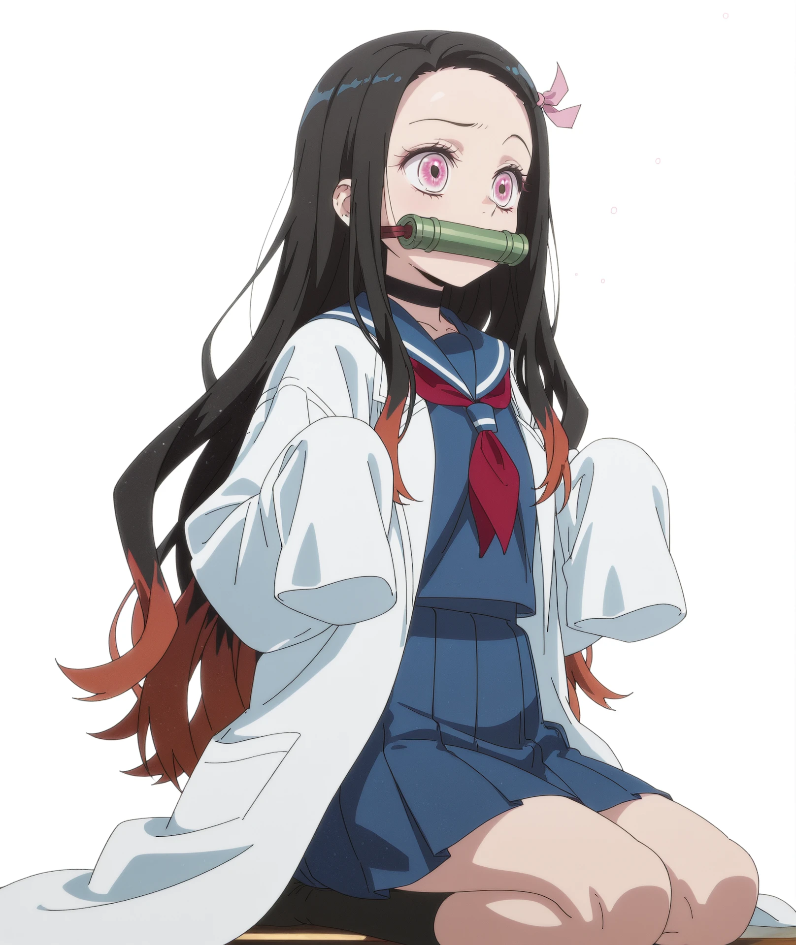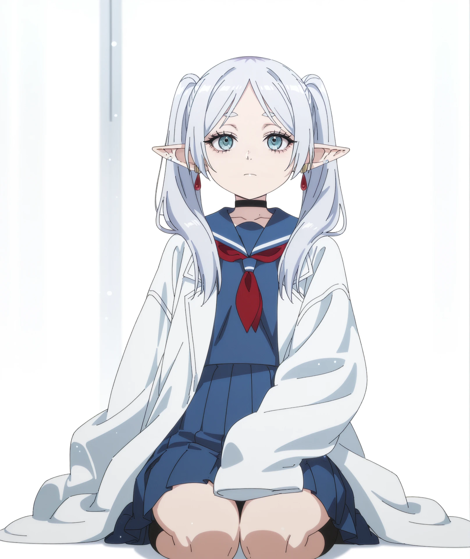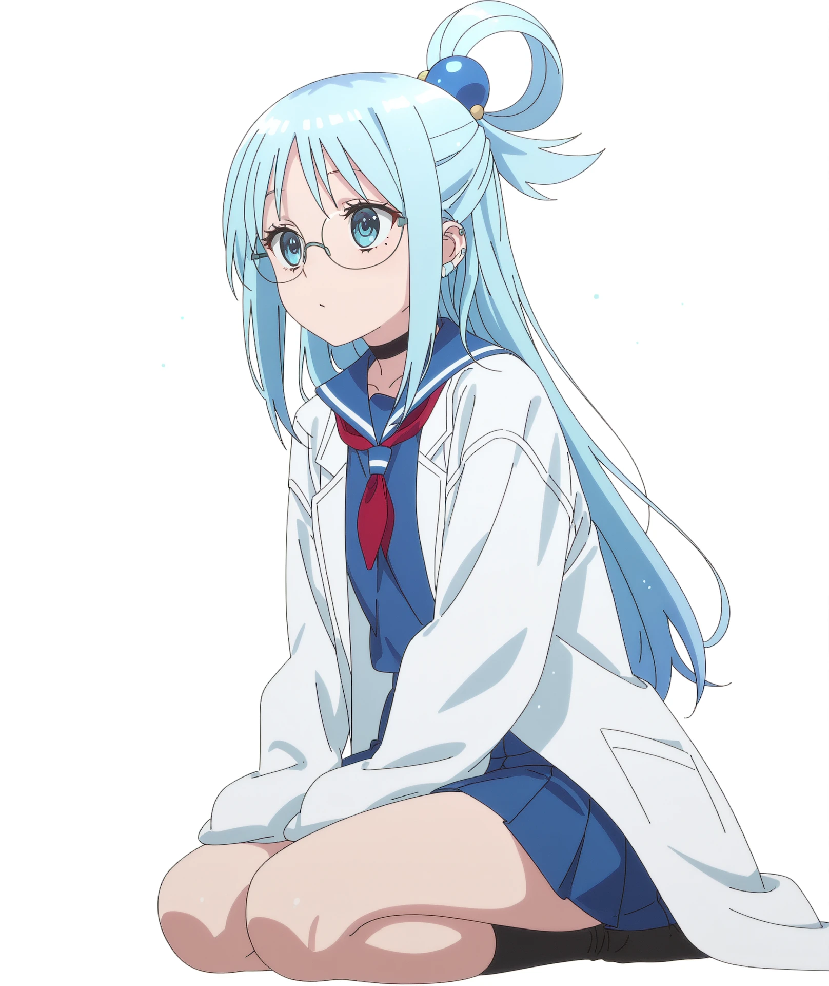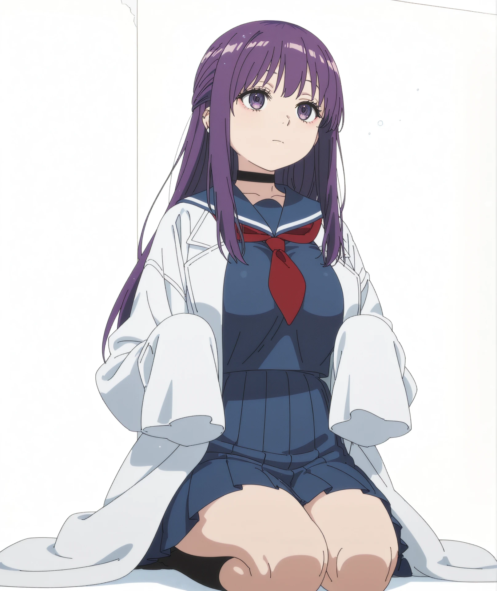 skirt, long sleeves, dress, school uniform, pleated skirt, choker, socks, serafuku, sailor collar, coat, blue skirt, lab coat, sleeves past fingers, long sleeves, choker, neckerchief, sleeves past wrists, black choker, blue sailor collar, red neckerchief,