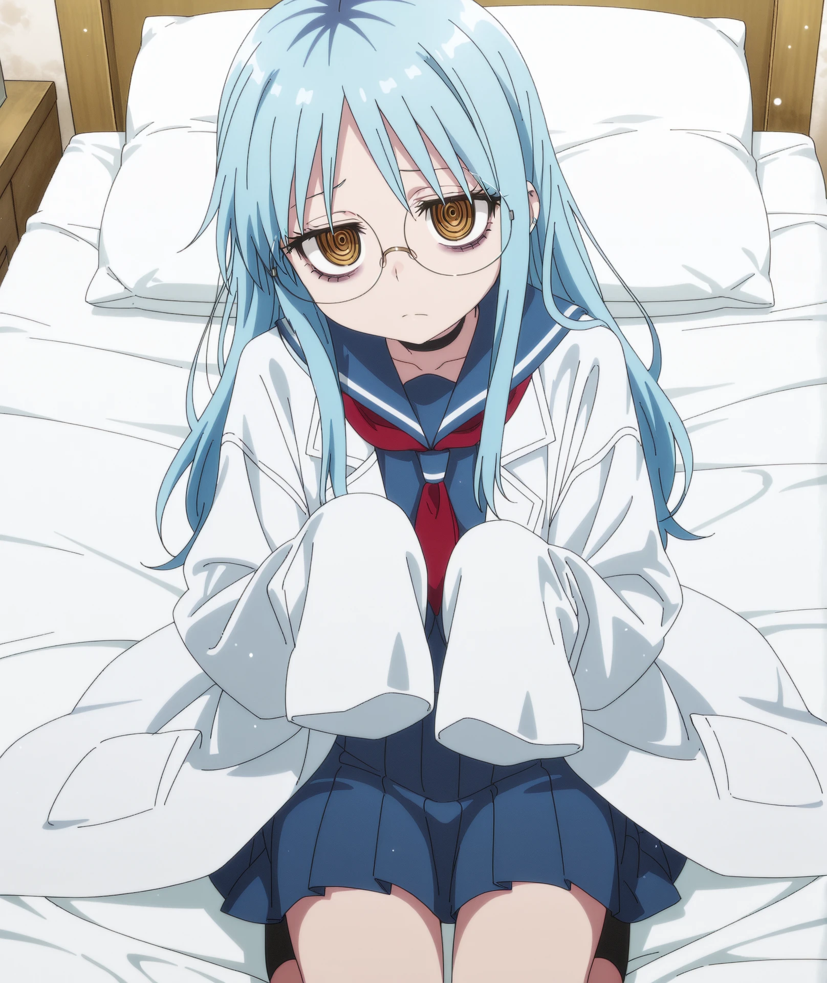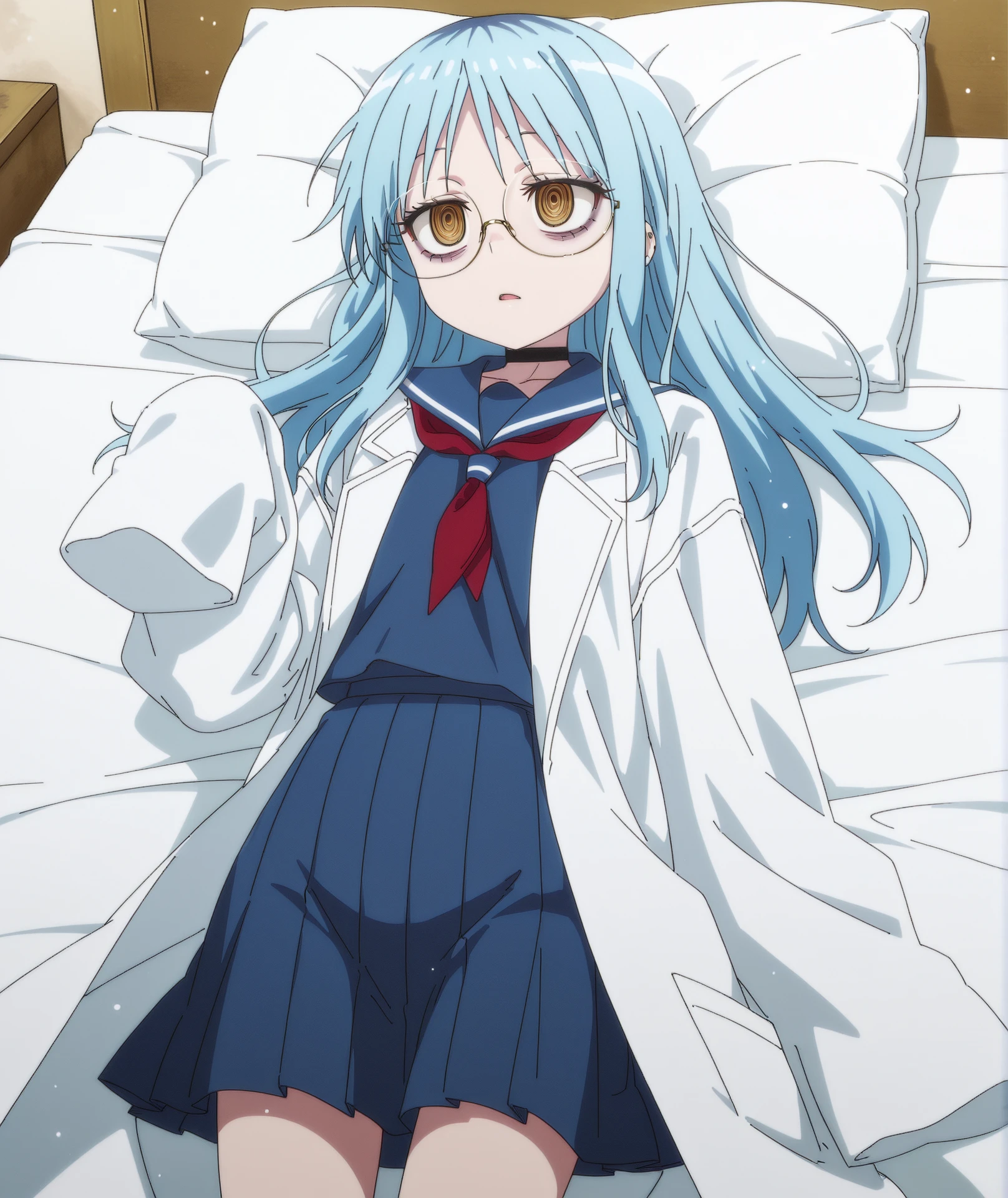eyelashes, nose, round eyewear, empty eyes, @_@, bags under eyes, ringed eyes, rimless eyewear, glasses, sidelocks, yellow eyes, brown eyes, blue hair, long hair,
