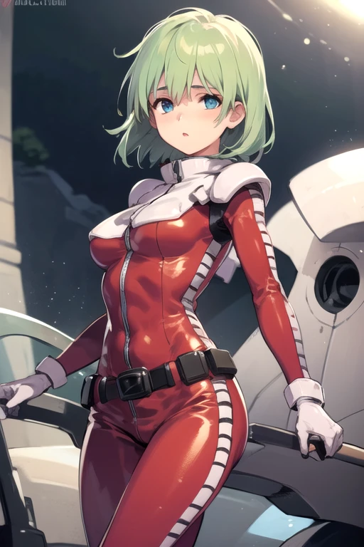 AinaSahalin, 1girl, solo, short hair, blue eyes, medium breasts, green eyes, green hair, belt, bodysuit, pilot suit, red bodysuit