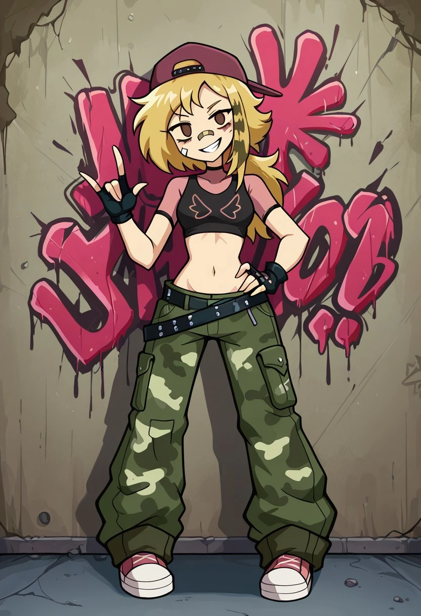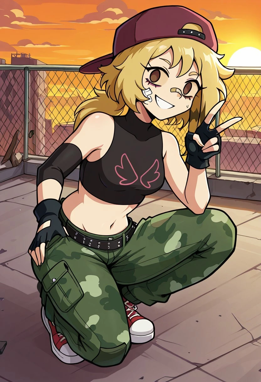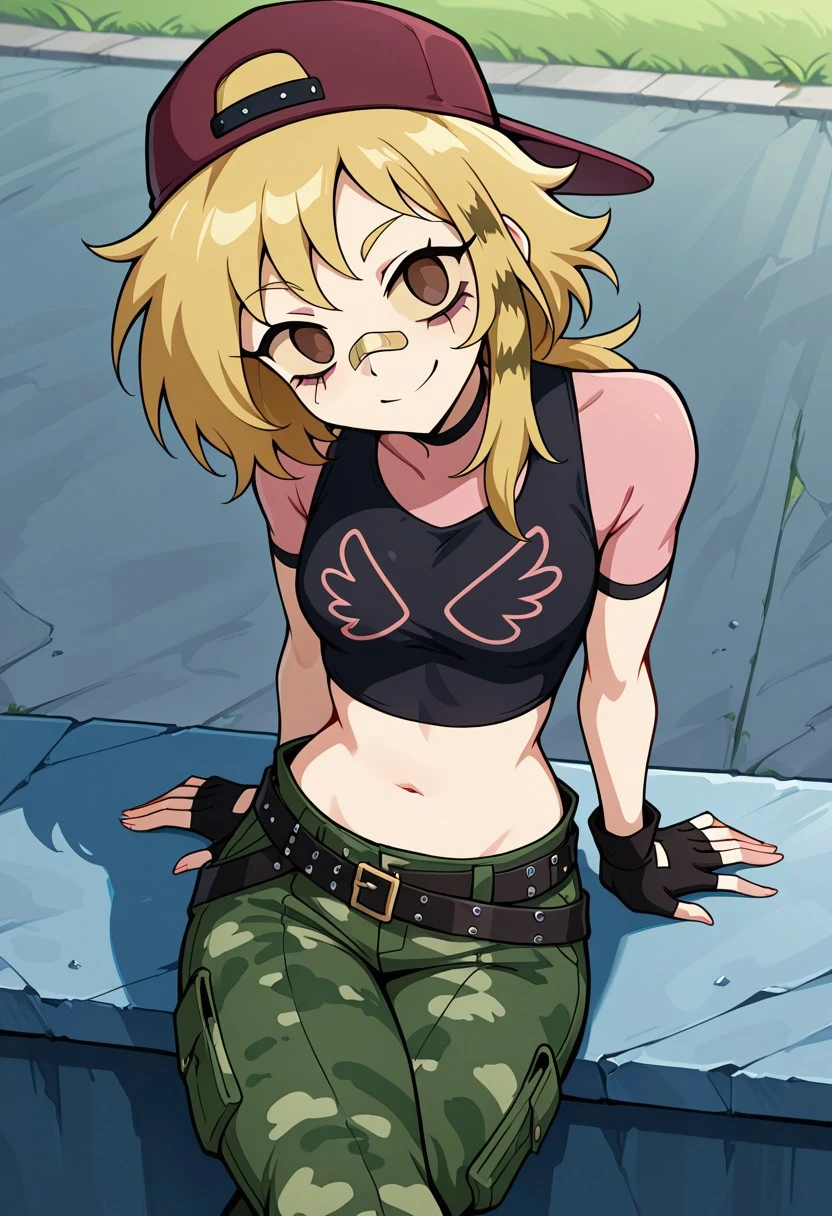jayoutfit, baseball cap, backwards hat, crop top, black gloves, fingerless gloves, belt, camouflage pants, shoes