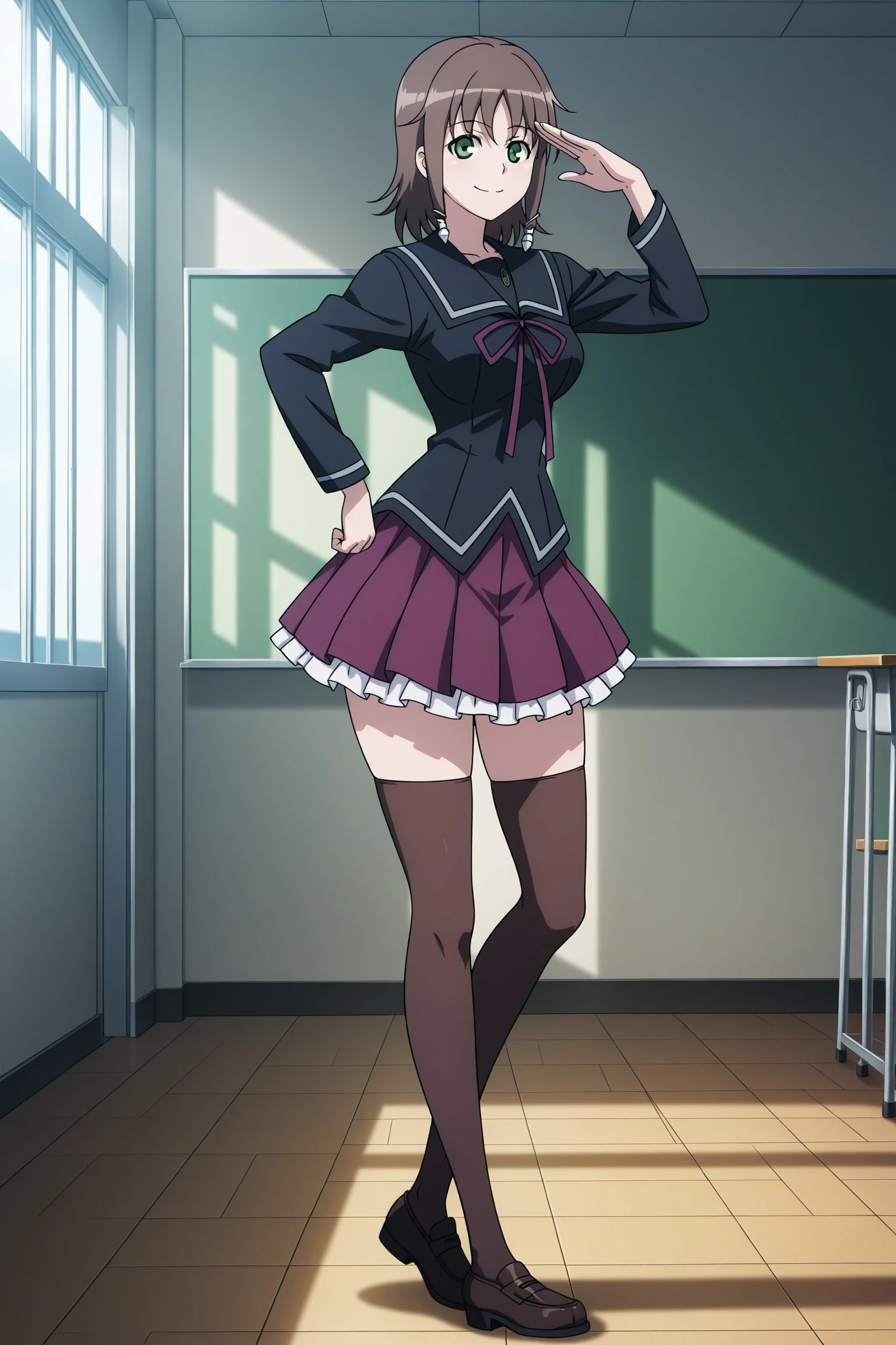 yukizome kukuri, short hair, brown hair, wispy bangs, sidelocks, hair ornament, green eyes, long sleeves, black shirt, untucked shirt, black sailor collar, purple neck ribbon, purple skirt, pleated skirt, layered skirt, frilled skirt, brown thighhighs, loafersDescription