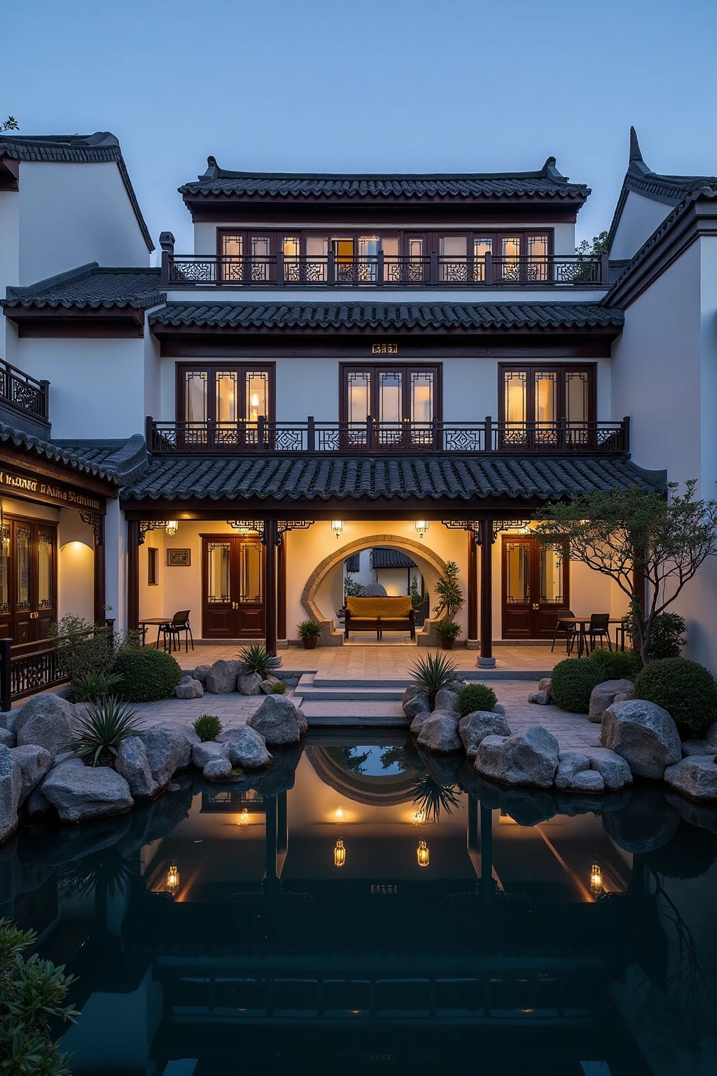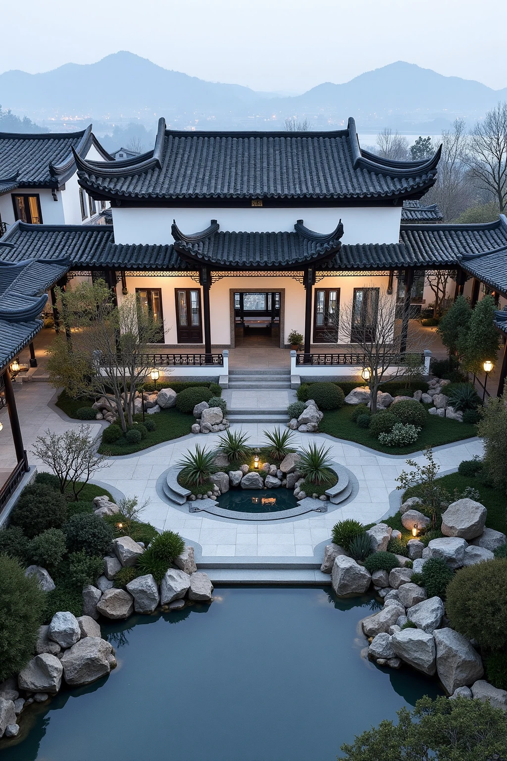 Traditional Chinese architectural style, combining modern and ancient, with new - built old - style houses, open - air terraces, and water - front landscapes.