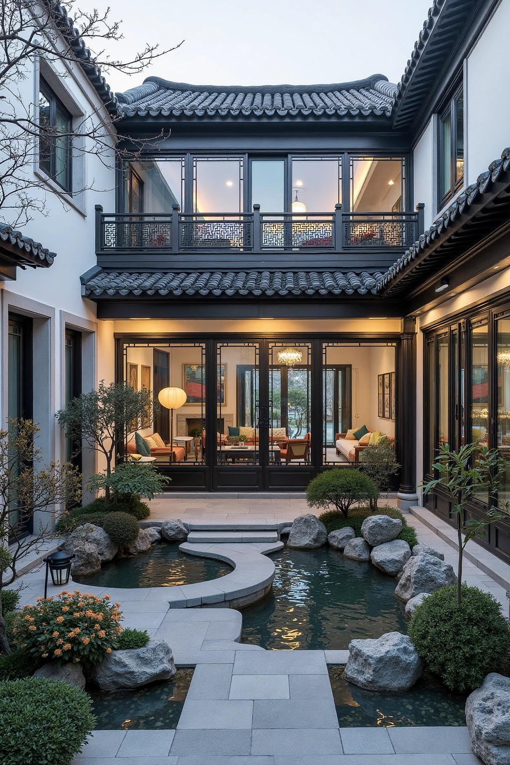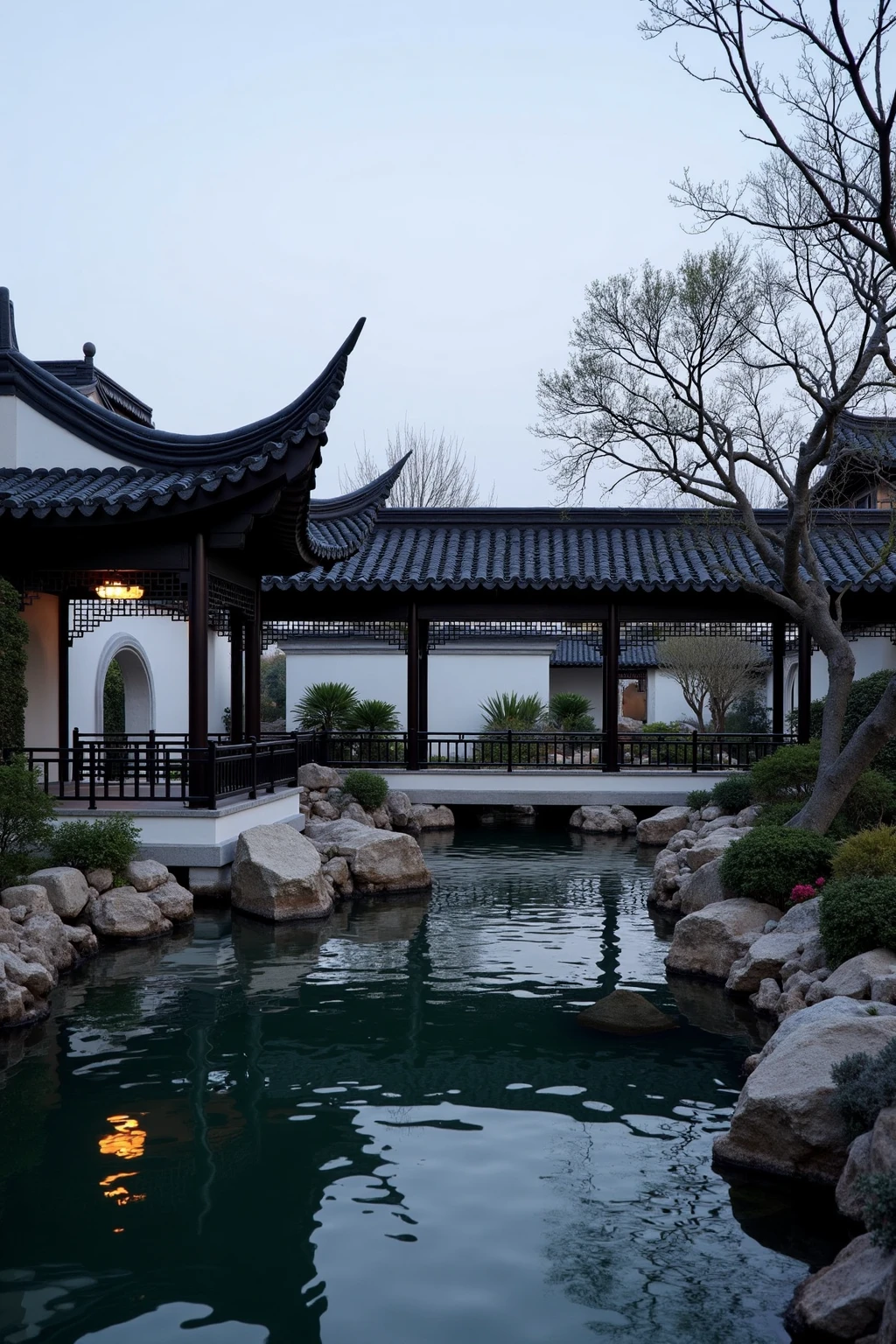 Traditional Chinese architectural style, featuring ancient - style villas, sloped roofs, wooden railings, and serene pond - side views.