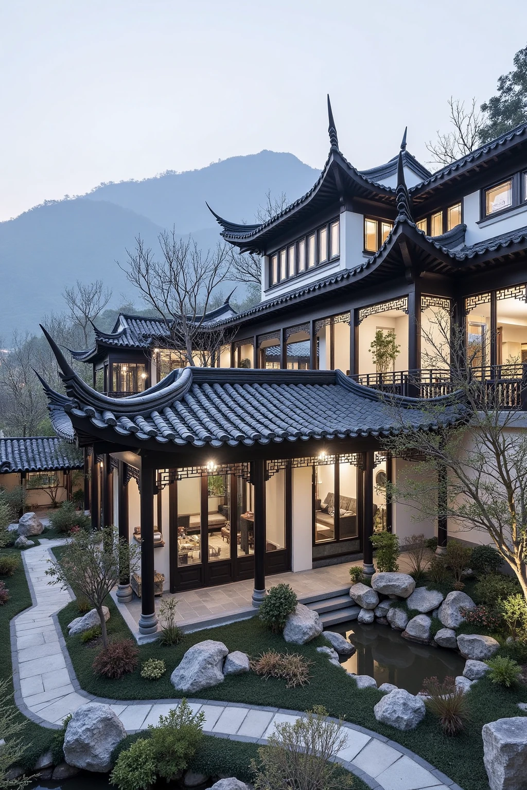 Traditional Chinese architectural style, highlighting mountain - side villas, simple - styled houses, stone - made decorations, and natural - view integration.