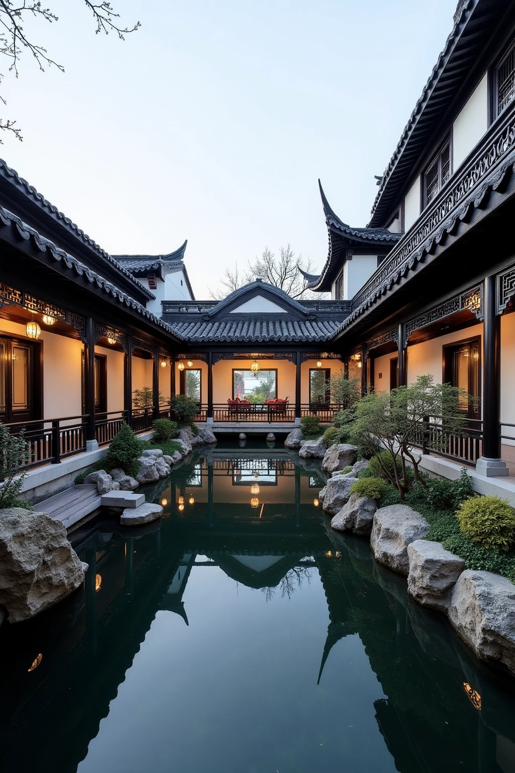 Traditional Chinese architectural style, highlighting classical pavilions, upturned eaves, stone bridges over streams, and reflected scenery.
