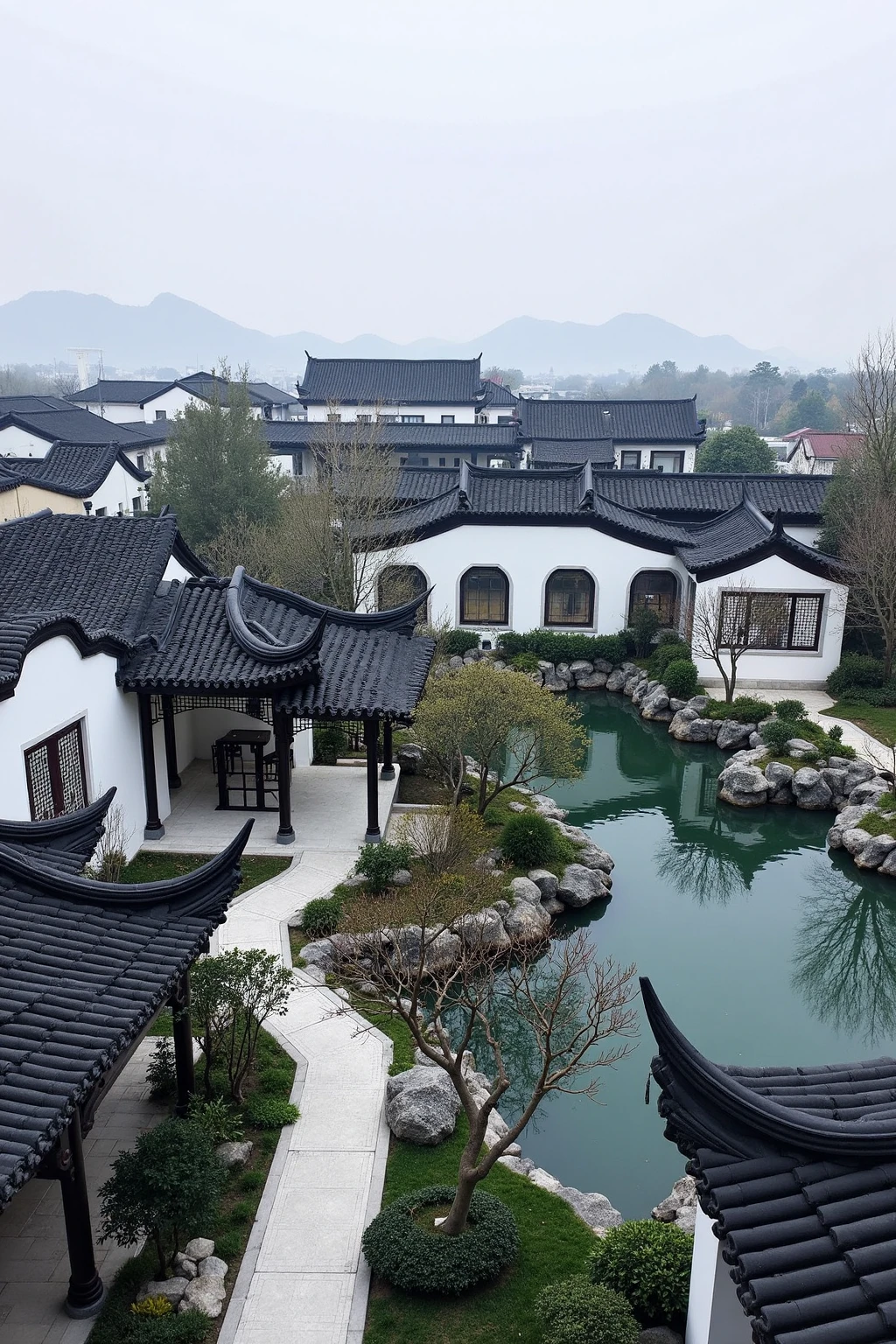 Traditional Chinese architectural style, integrating Jiangnan garden elements, with black - tiled white - walled houses, pavilions by the water, and winding paths.