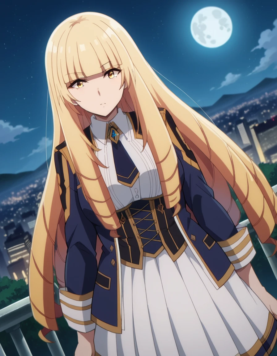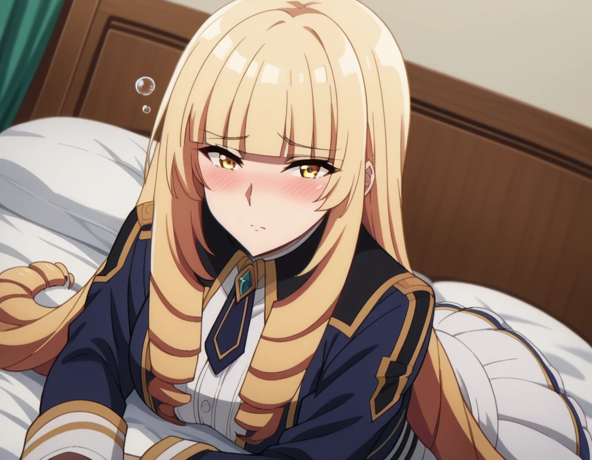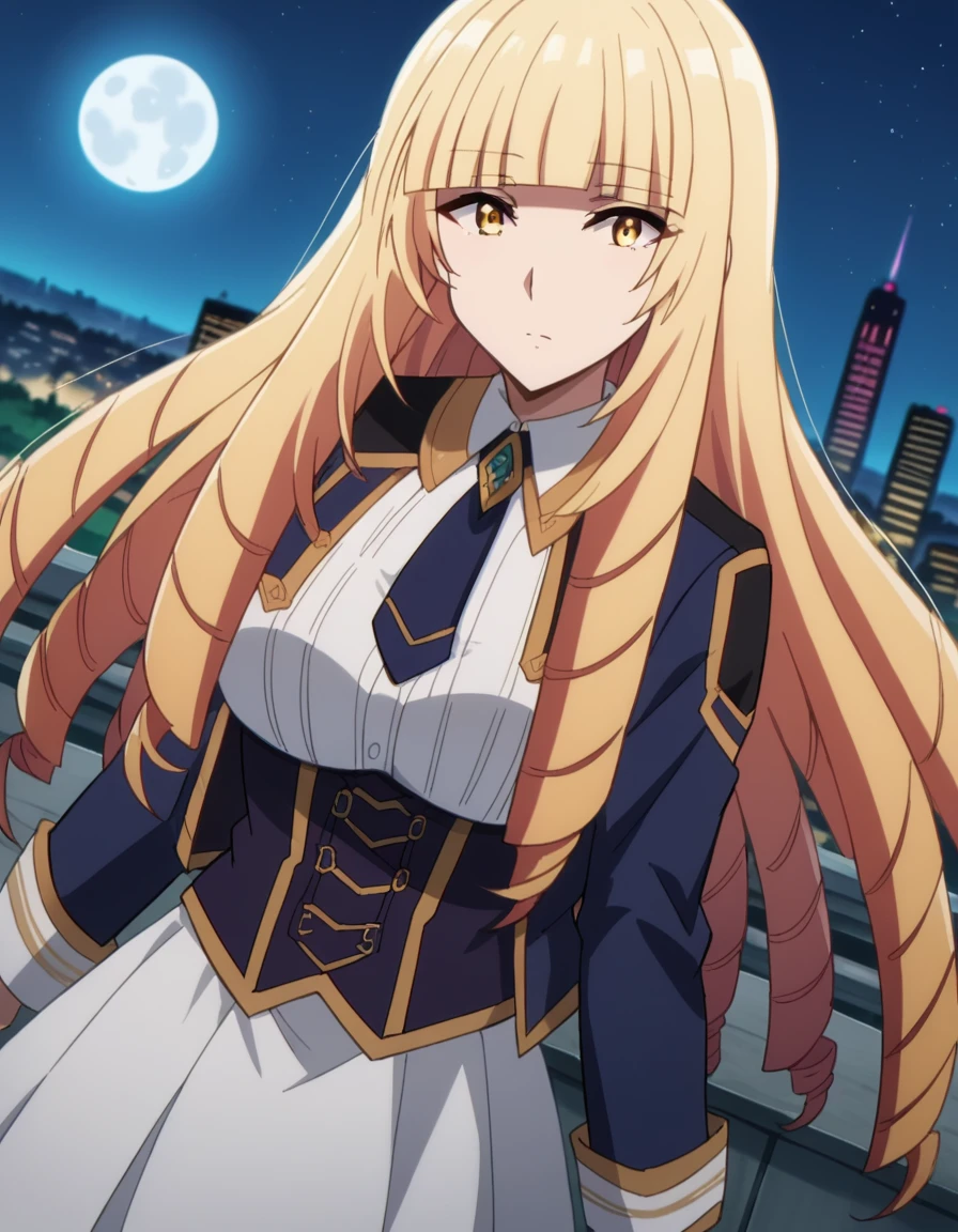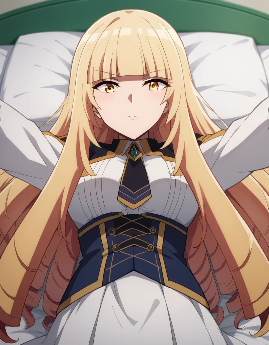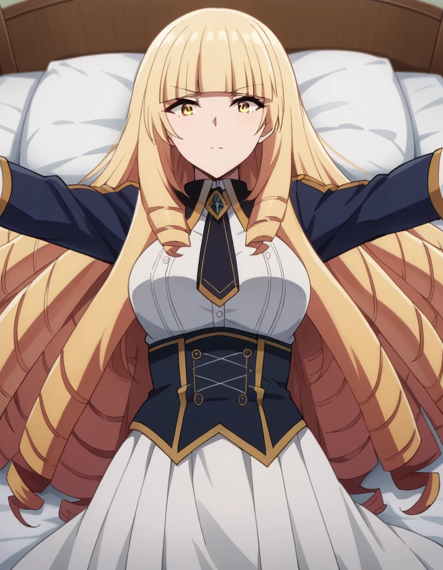 oriana rose, long hair, blonde hair, yellow eyes, drill hair, bangs, blunt bangs,