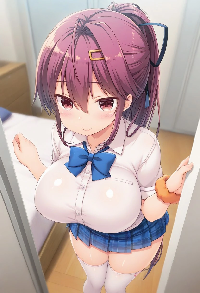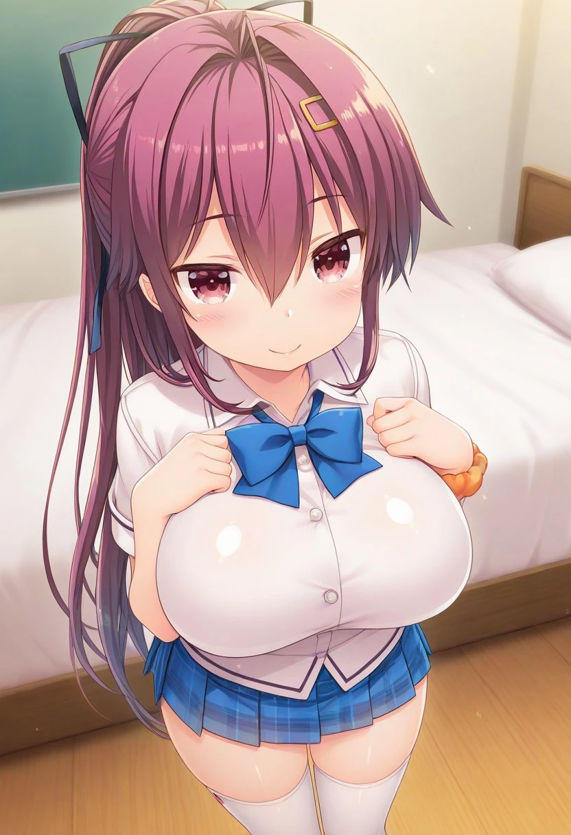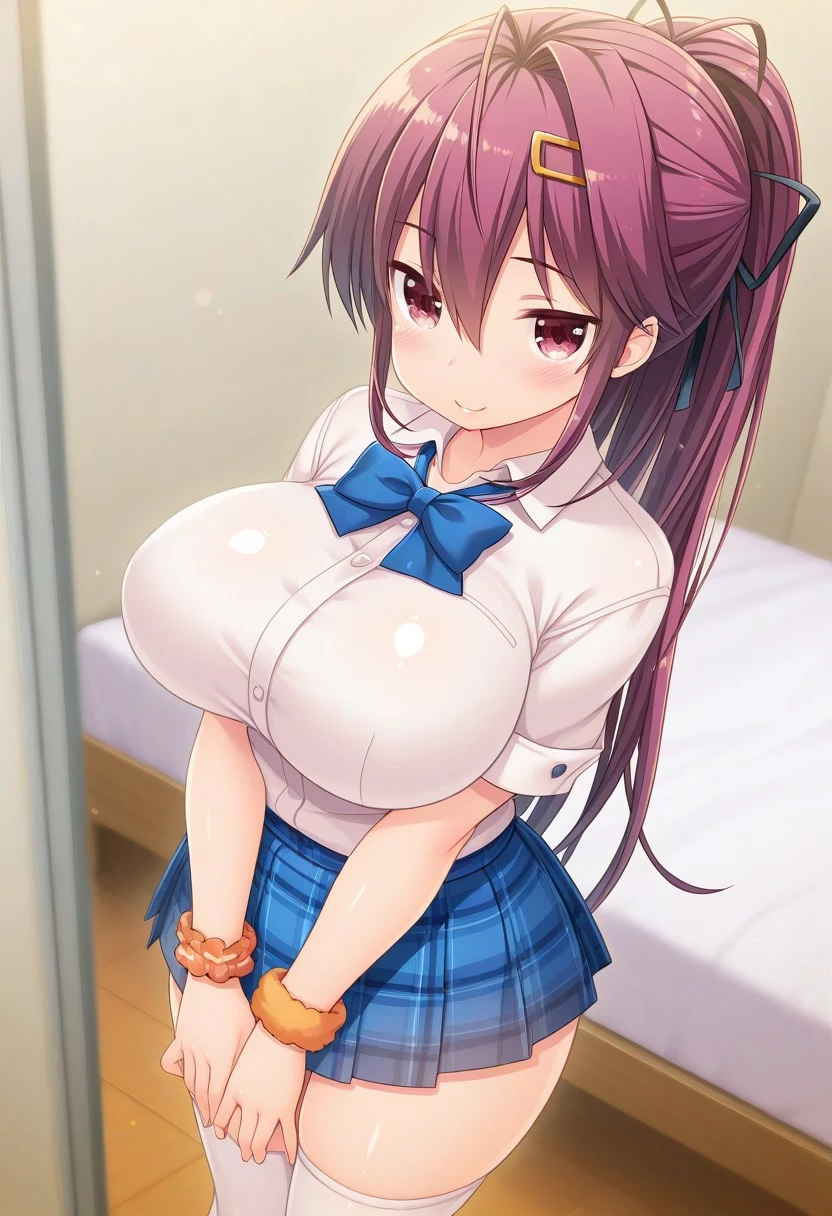 Recommend Prompt:Hikaru Takanashi, purple eyes, purple hair, long hair, long ponytail, hair ribbon, hairclips,