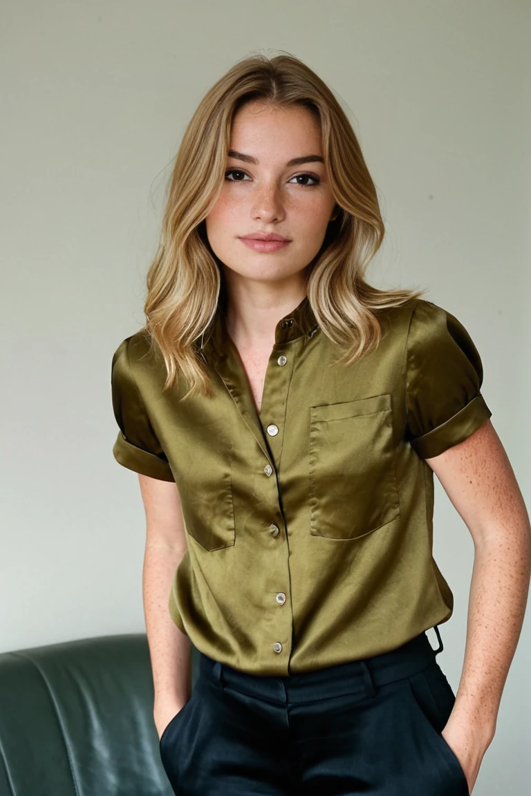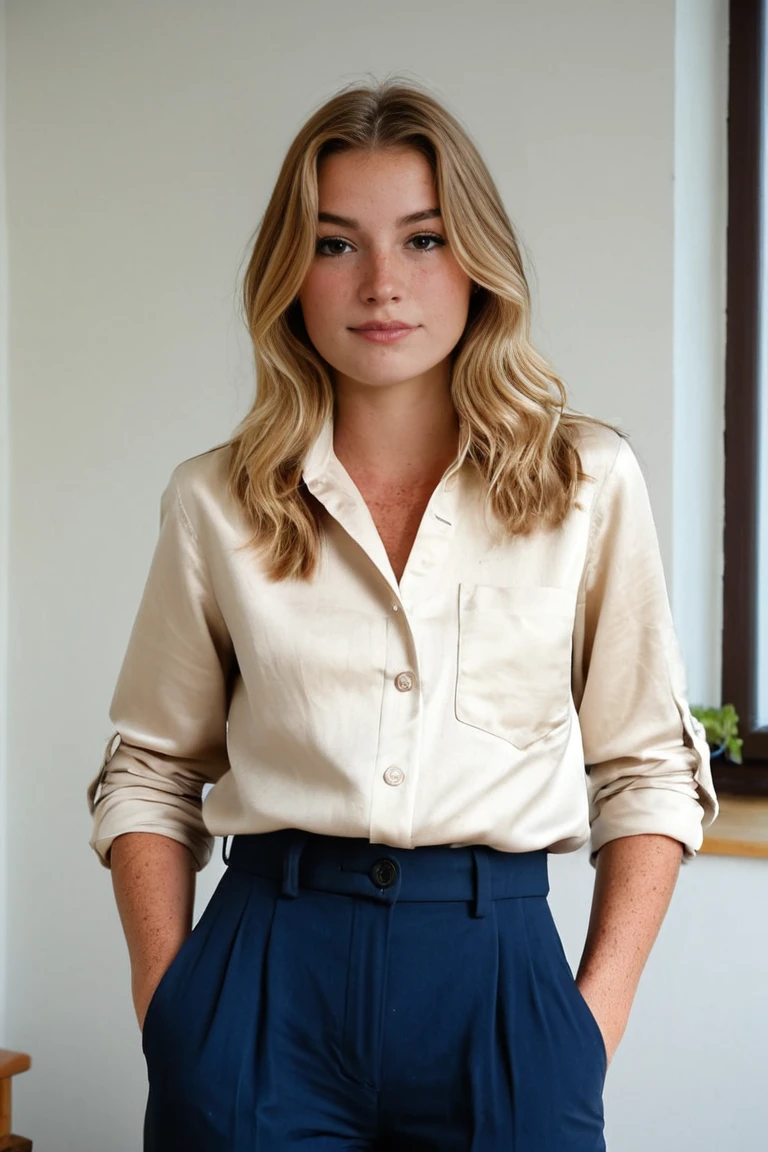"A 25-year-old French woman, light beige skin with natural freckles, thick jet blonde layered hair with soft waves framing her oval face, brown eyes, graceful posture, and a petite frame."