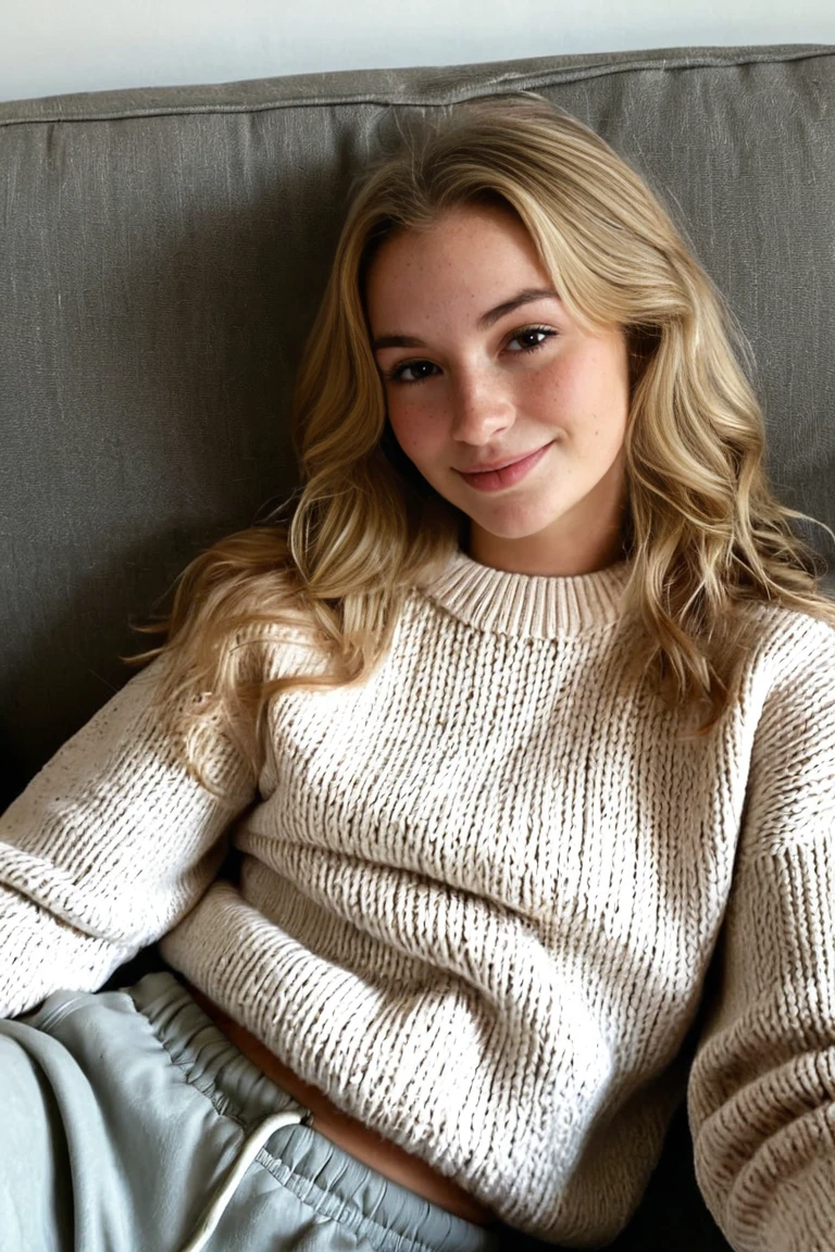 She often appears in natural light, wearing soft fabrics like knitted sweaters, surrounded by warm indoor tones. The gallery images were prompted accordingly.