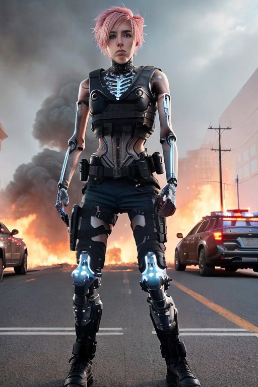 Trained on a whole bunch of terminator and cyborg images both human, partially human, fully machine and so on. it will create robots of a more mechanical style than most hard sci-fi models will do and is fantastic at inpainting human characters to give them cybernetic features like arms.