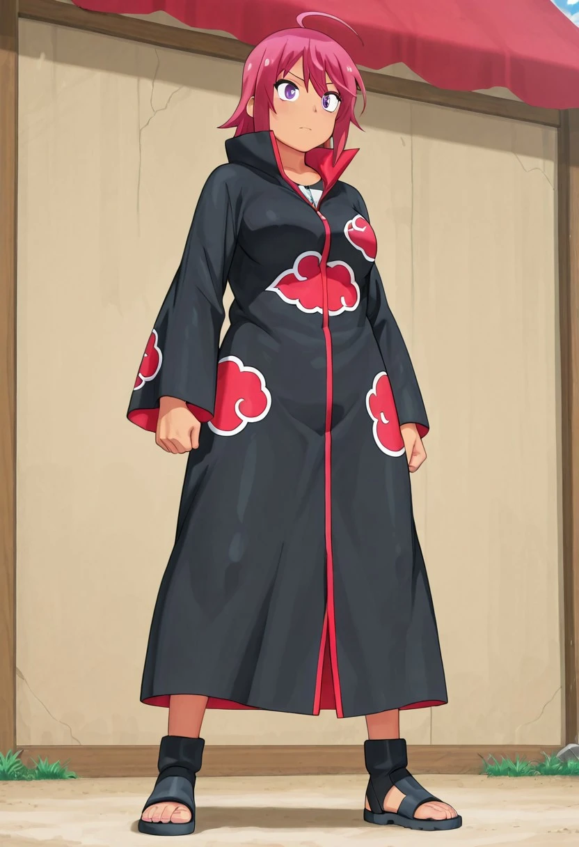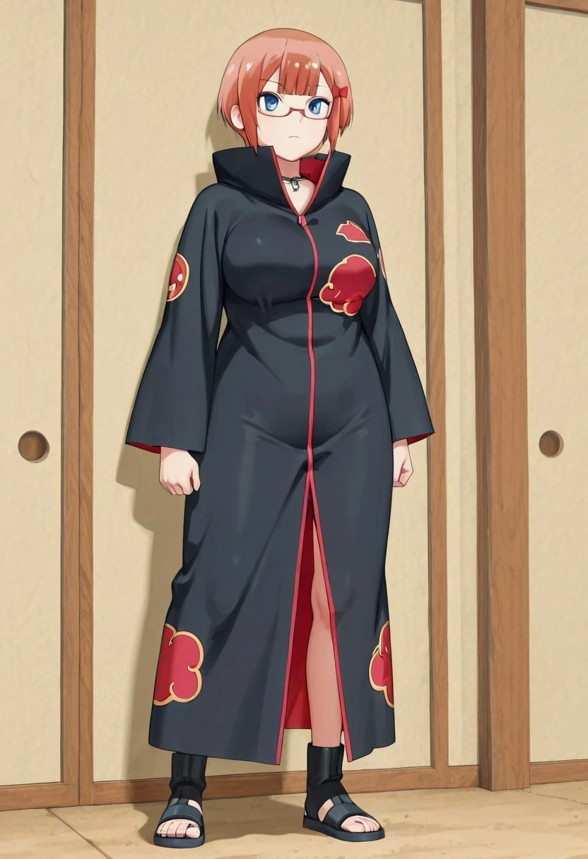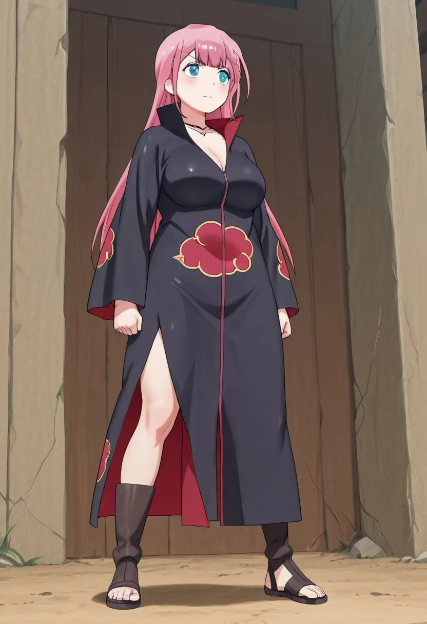<lora:akatsuki-V1>,Akatsuki cloak, long cloak, black cloak, decorated with red clouds with white edges, ((tight clothing:1.1)),shinobi sandals,black sandals