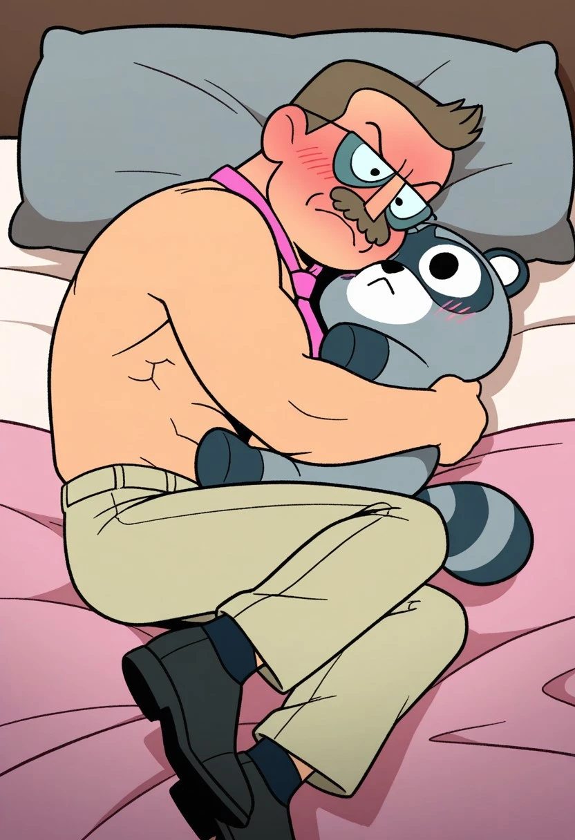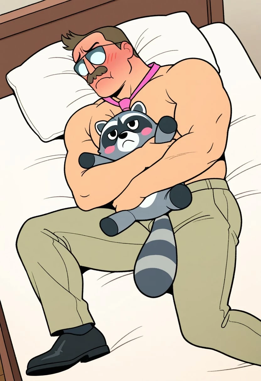 1man,solo,male focus,Mr.Gar,receding hairline,brown hair,mustache,muscular,shirtless,aviator glasses,pink necktie,khaki pants,black shoes,