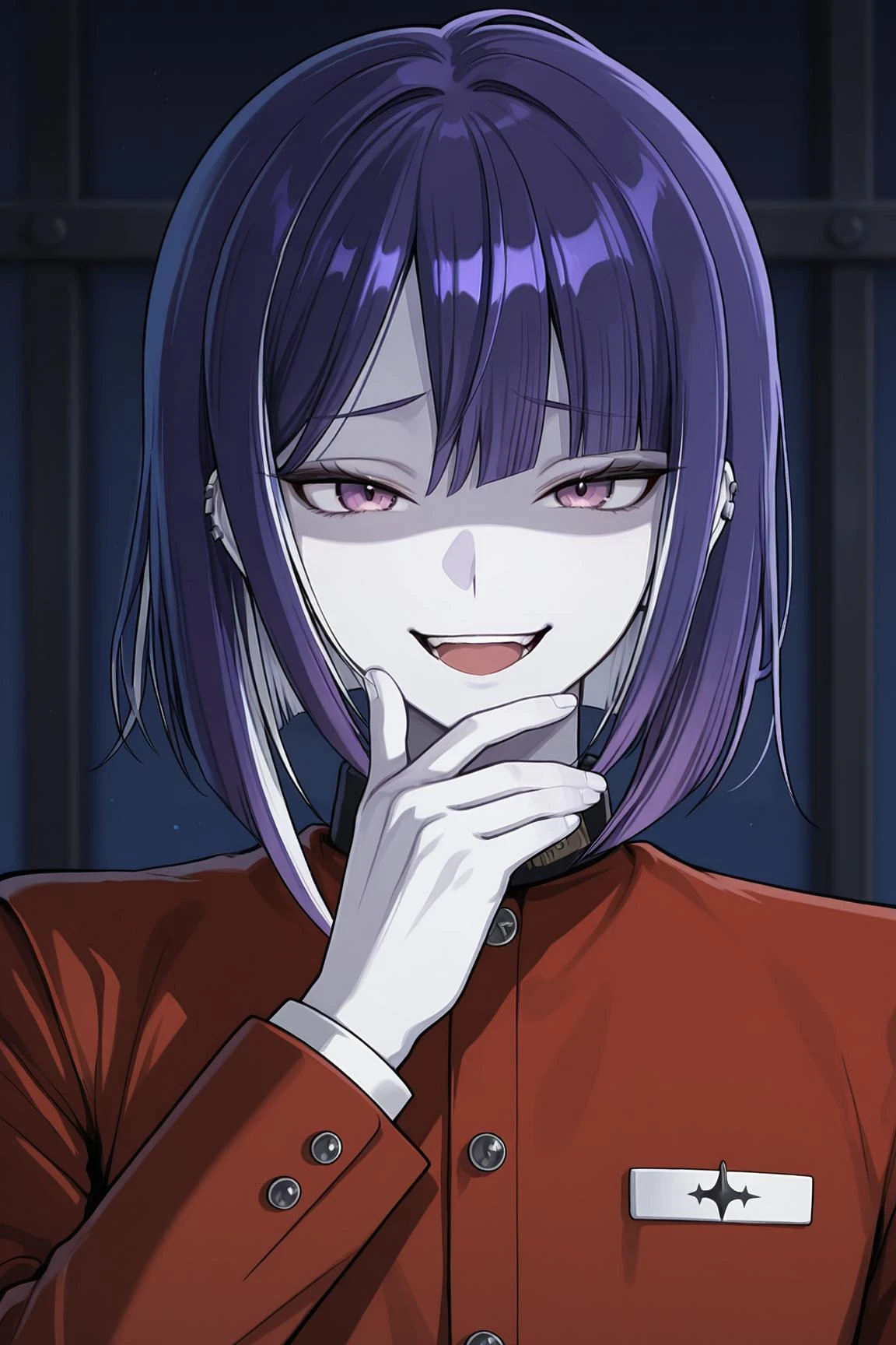 Ima, tsukumo ima, purple hair, streaked hair, white hair, purple eyes, blunt bangs, medium hair, ear piercing, pale skinClothes: