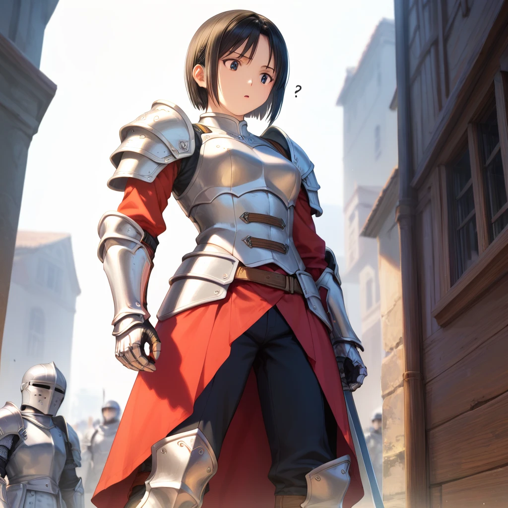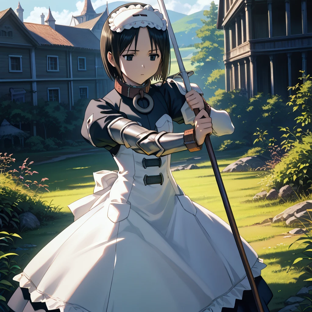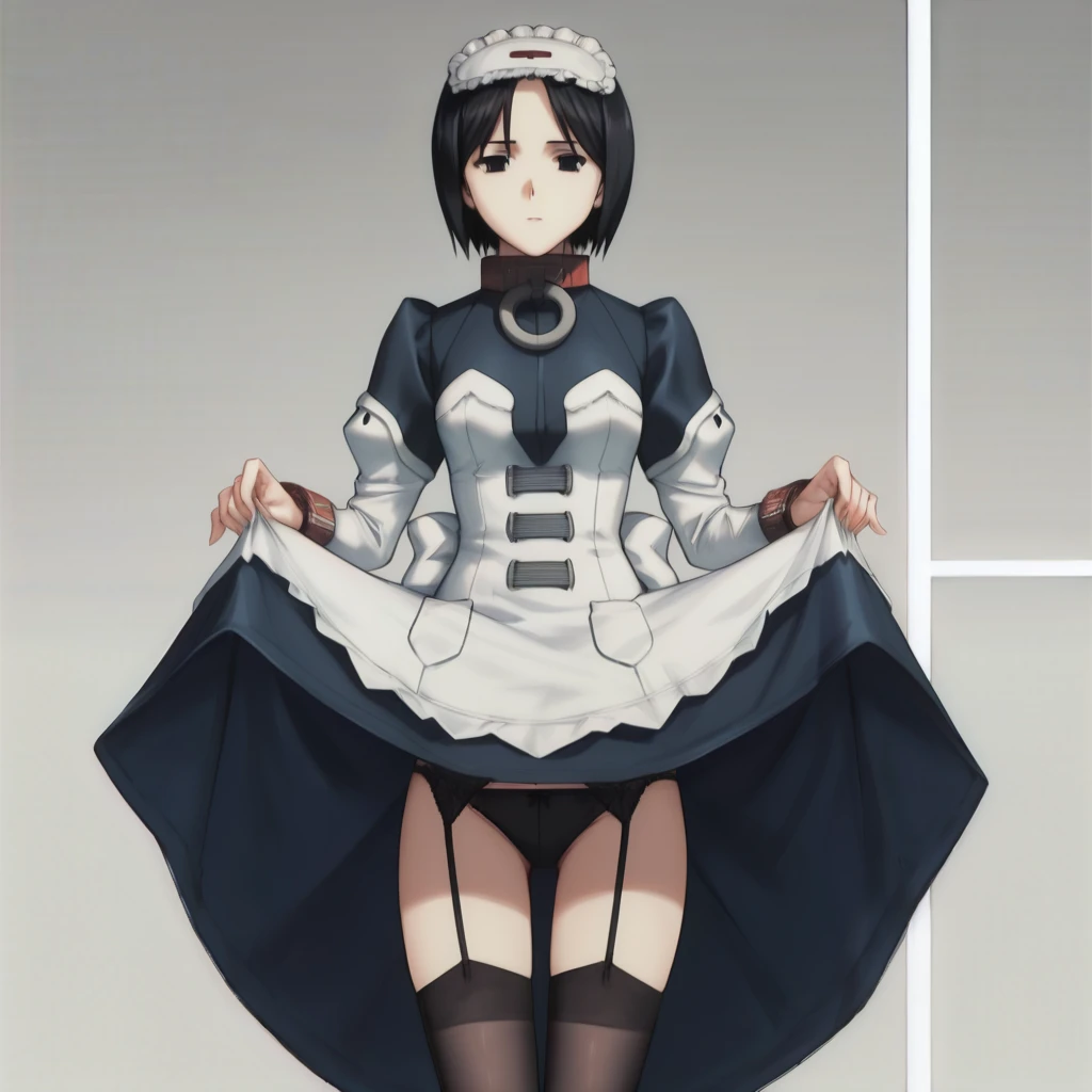 In combat she has a single gauntlet and a polearm, but I don't think it draws the weapon that well. The collar rung and gauntlet tend to be gold instead of silver like it should be. In almost all of the data images she is wearing her maid uniform so it's hard to remove all of its elements even if you put them in your negative tokens. You may need to add puffy sleeves and juliet sleeves to negatives to avoid some freaky gens if her arms are bare