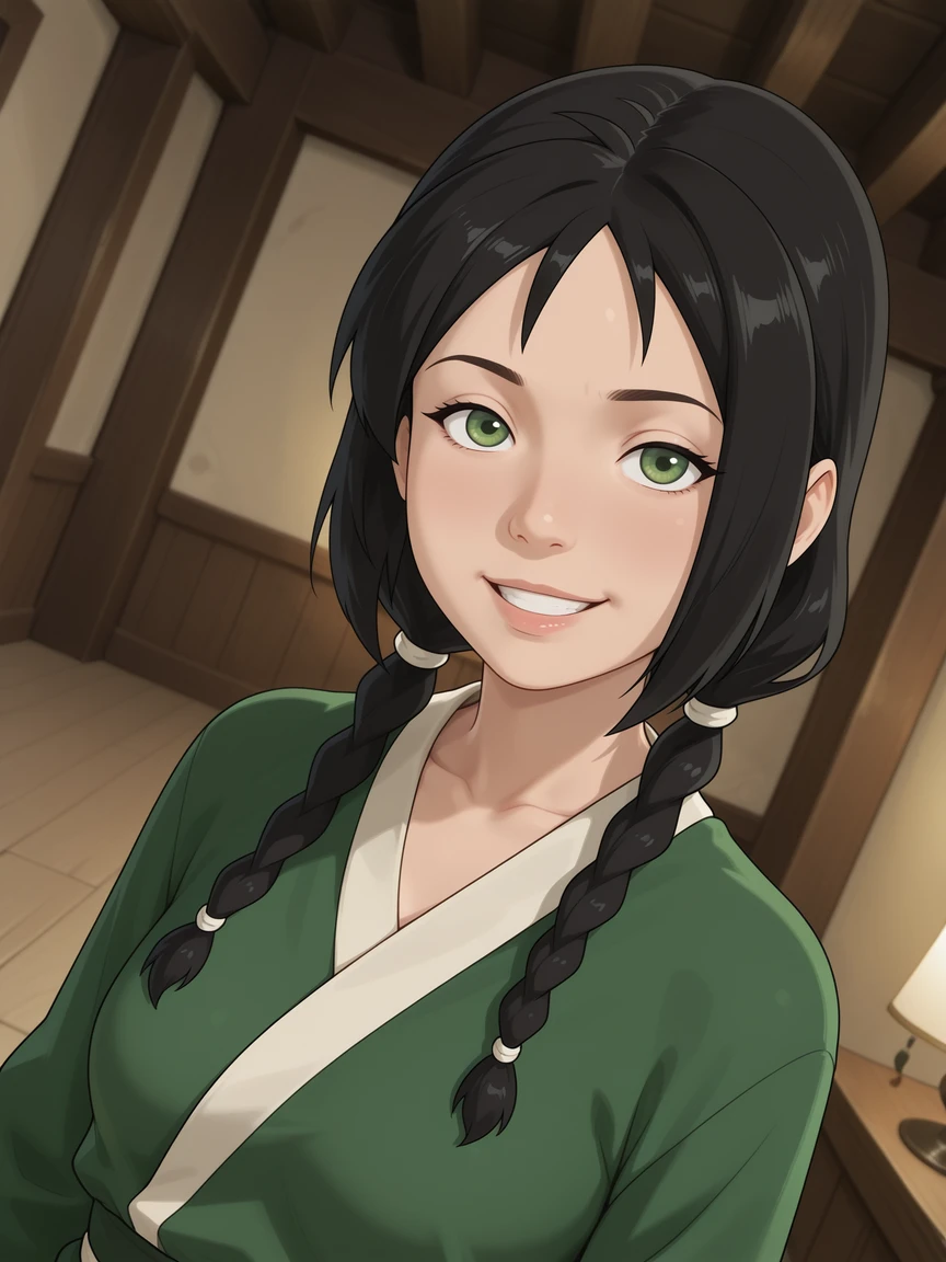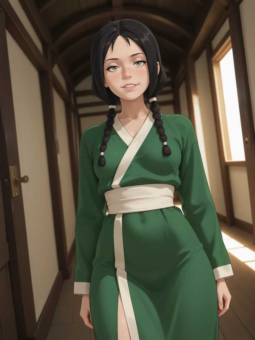 jin_atla, 1girl, green eyes, solo, looking at viewer, black hair, twin braids, long hair, hair over shoulder, green dress, green kimono, Japanese dress,