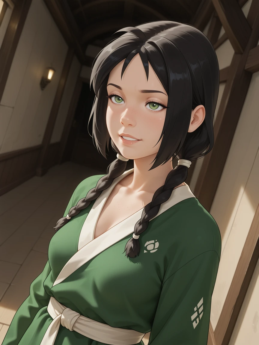 Trigger tags: jin_atla, 1girl, green eyes, solo, looking at viewer, black hair, twin braids, long hair, hair over shoulder,