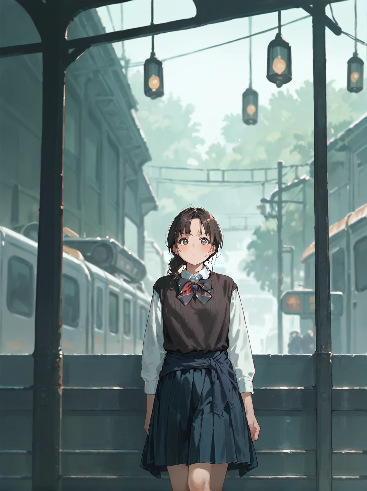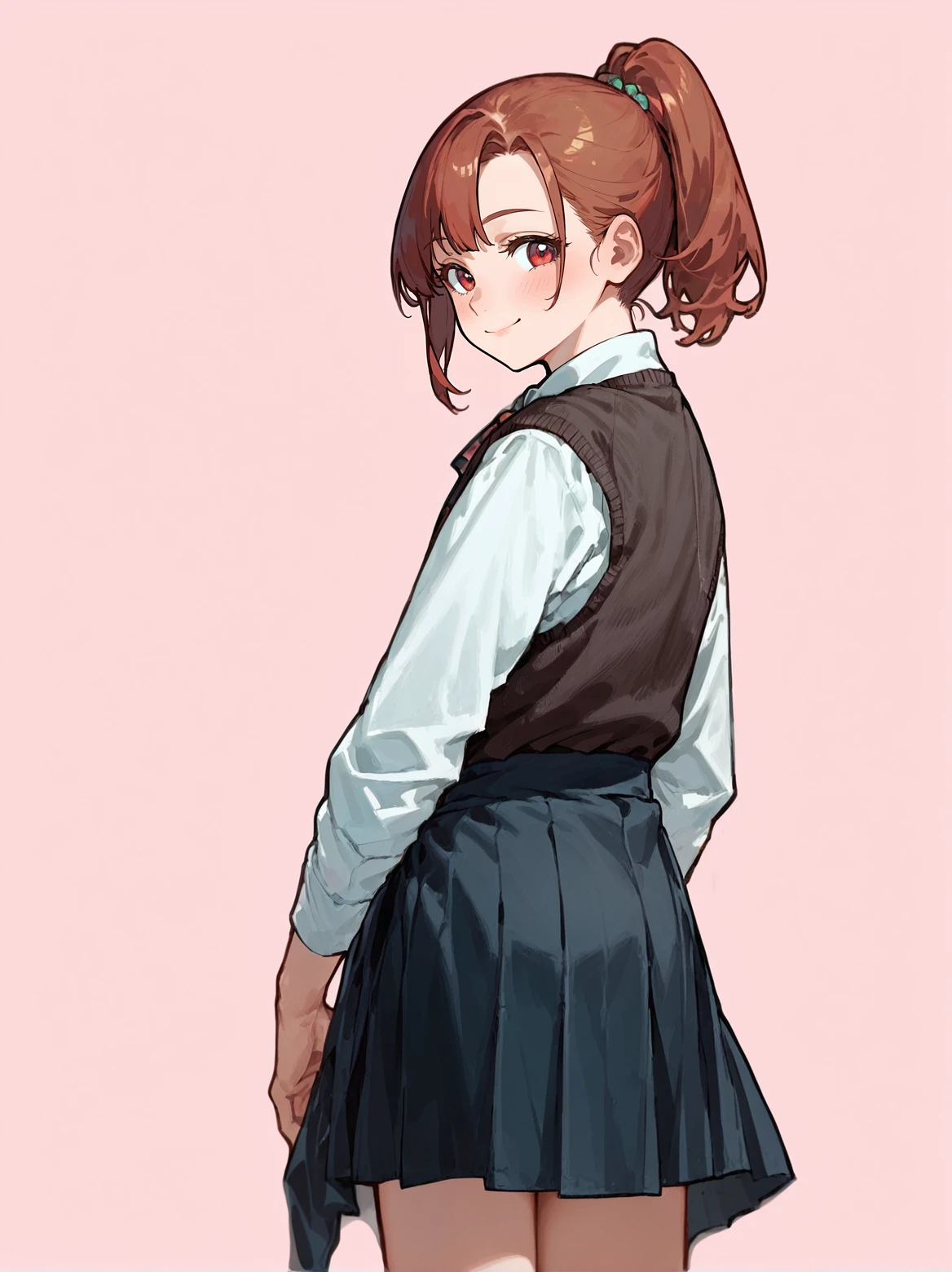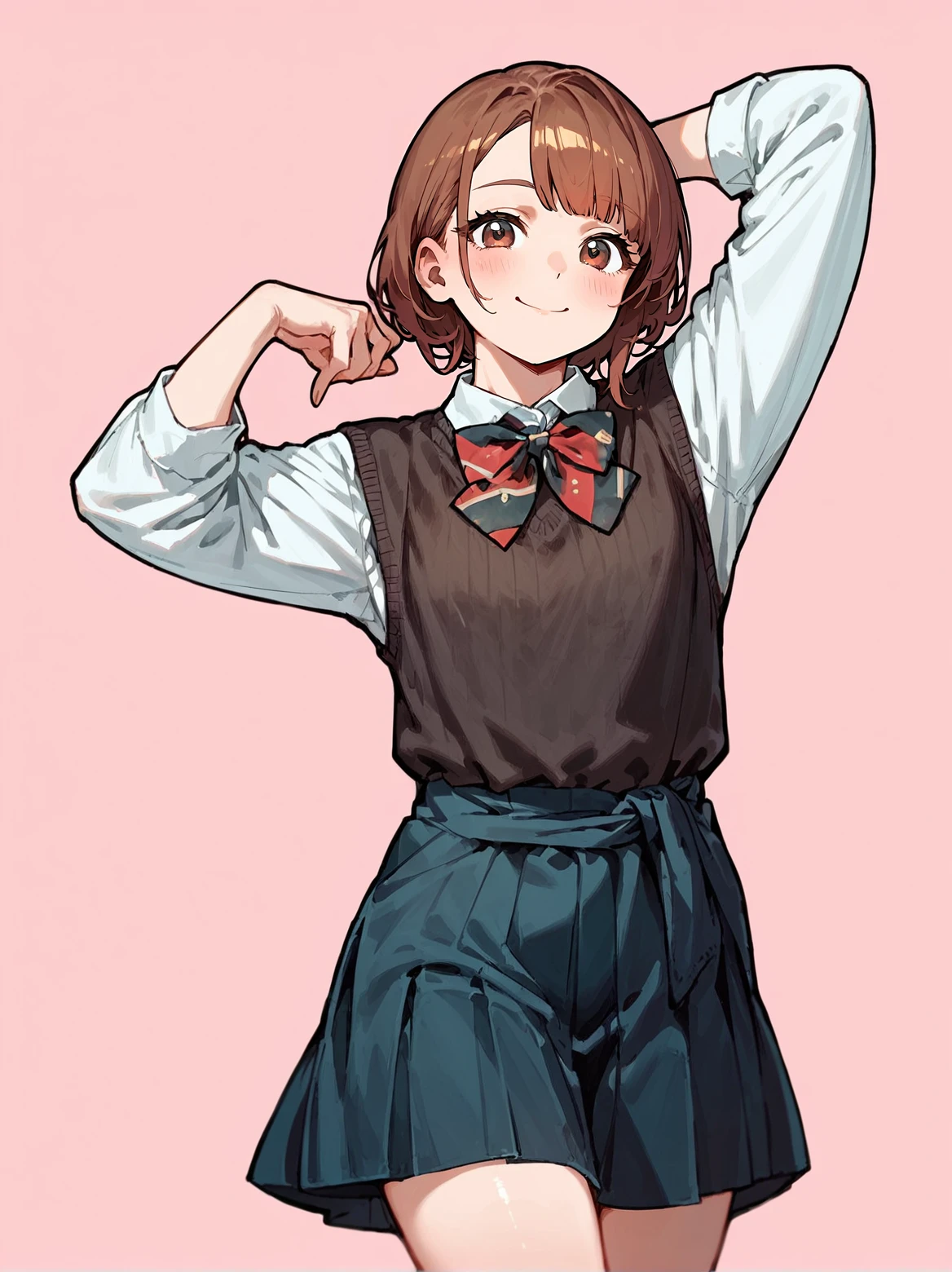 TAGS: white shirt, brown sweater vest, sweater around waist, long sleeves, bowtie, pleated skirt