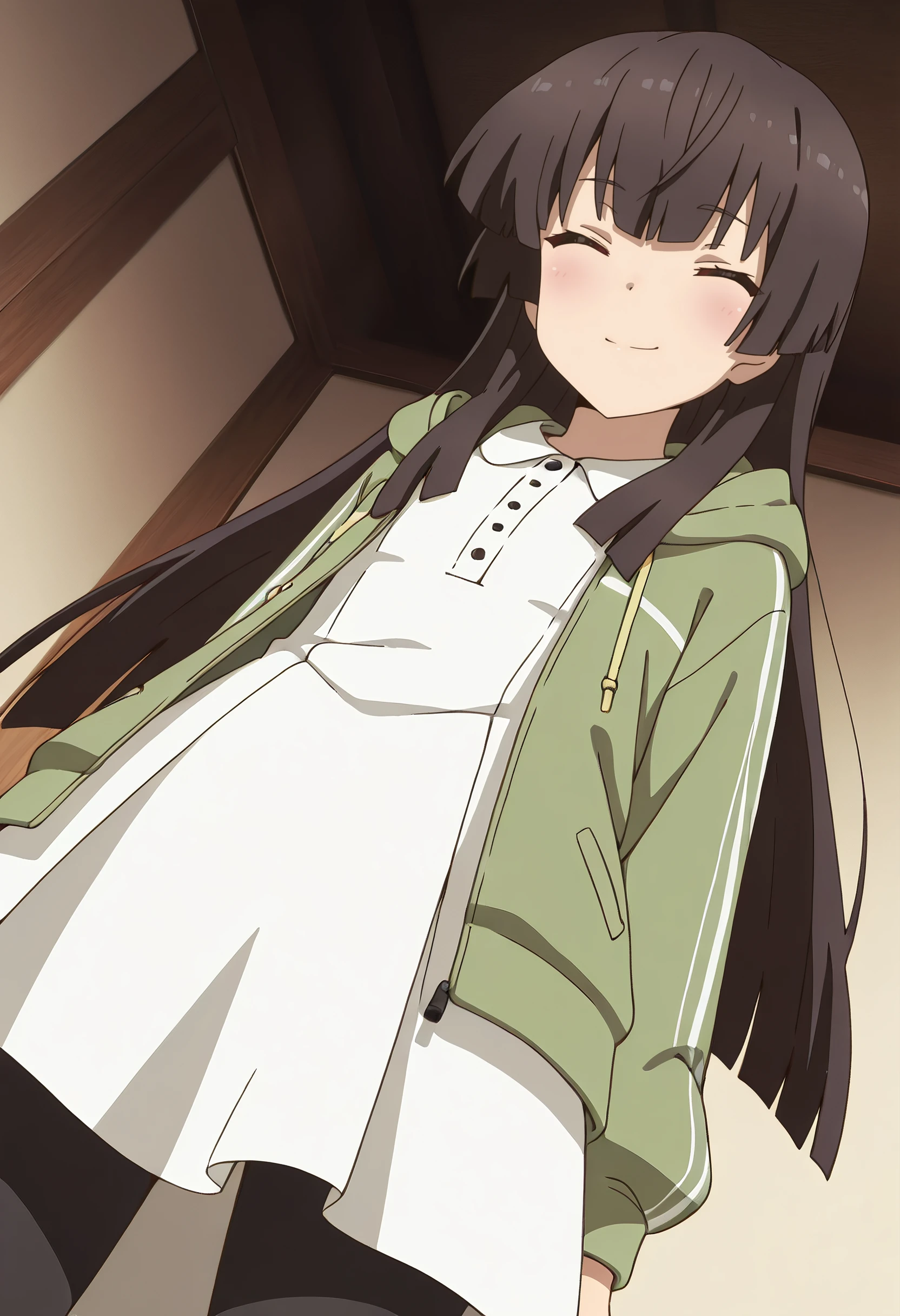 HiyoriJacket, hood, green jacket, jacket, brown hair, open clothes, hime cut, brown eyes, dress, hooded jacket, casual, open jacket, long sleeves, hood down, white dress, drawstring, pantyhose, black pantyhose, collared dress,