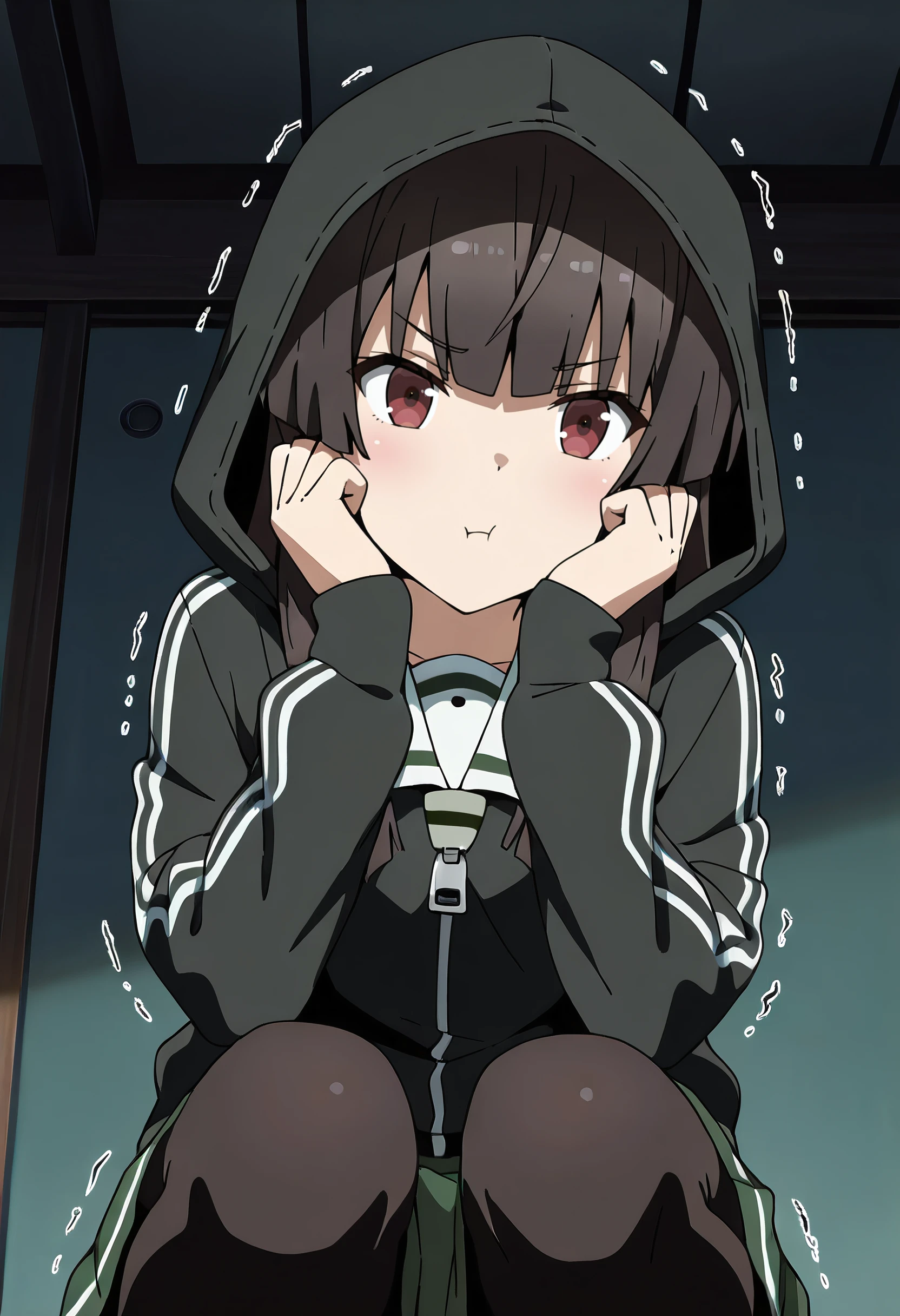 HiyoriHoodieA, hood, black hoodie, hoodie, hood up, school uniform, jacket, hooded jacket, black jacket, long sleeves, sailor collar, skirt, pleated skirt, serafuku, green skirt, white sailor collar, hime cut, pantyhose, hooded sweater, zipper,