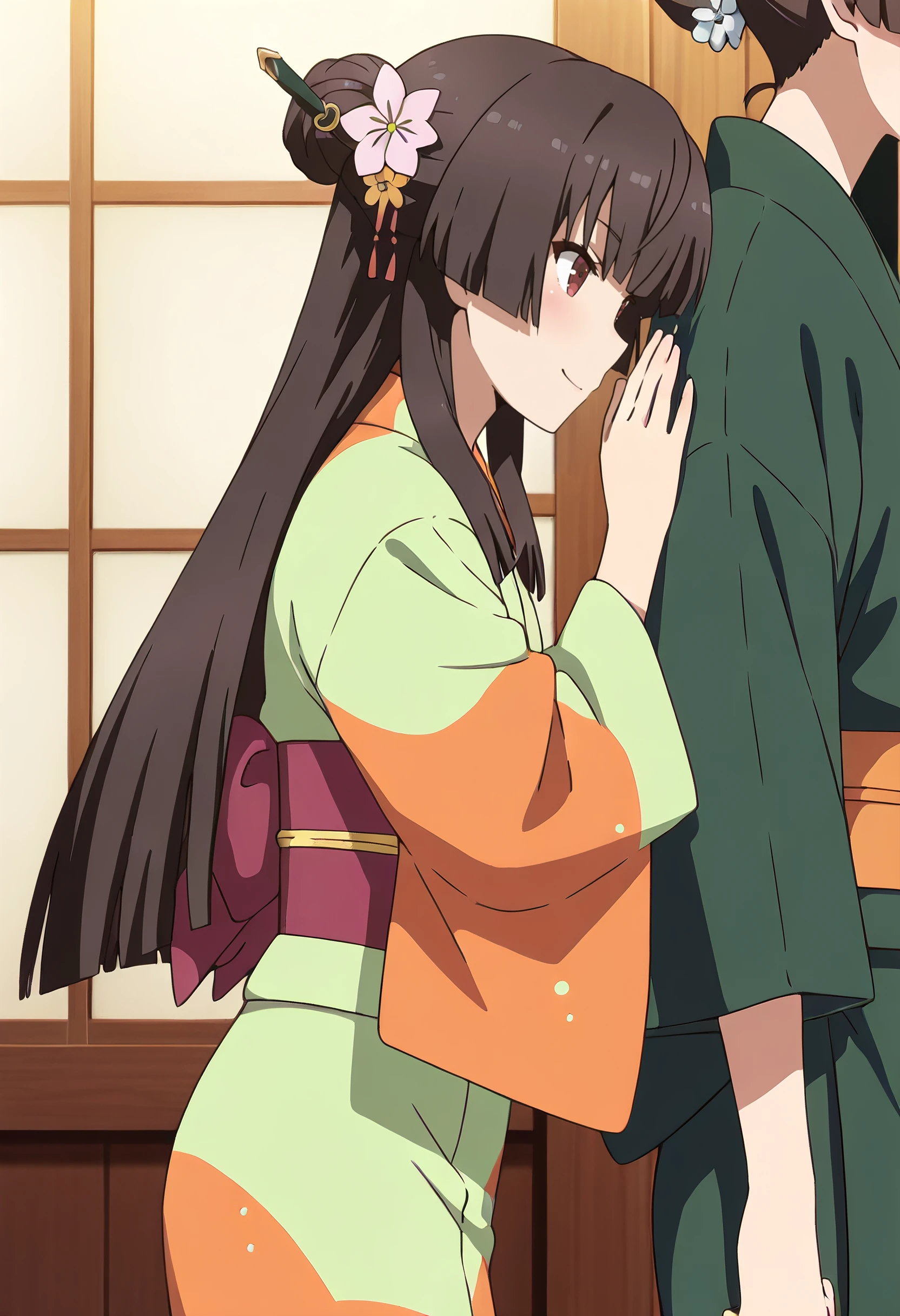 HiyoriKimono, kimono, japanese clothes, yukata, green kimono, hair ornament, obi, sash, hair bun, single hair bun, print kimono, sidelocks, hair flower, hime cut, sandals, wide sleeves, hair up, flower, multicolored kimono, orange kimono,