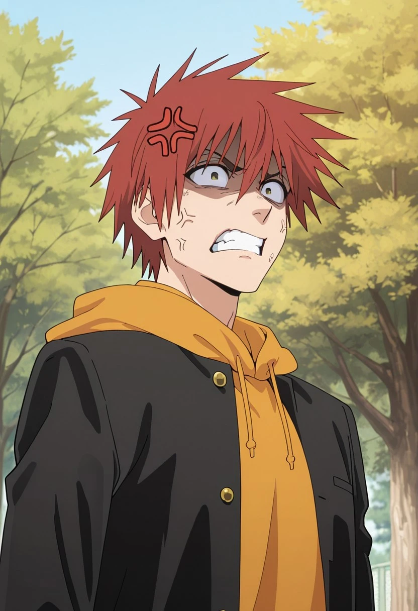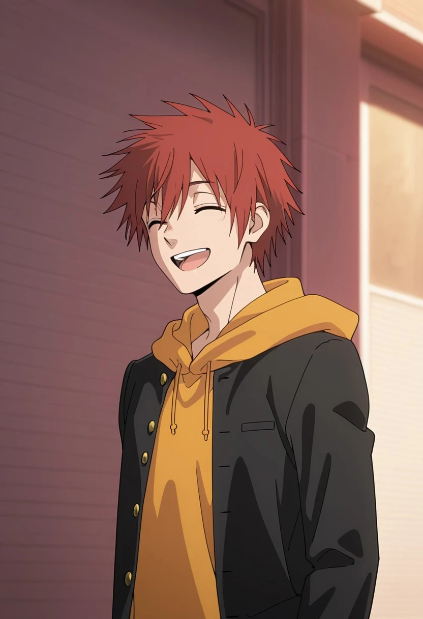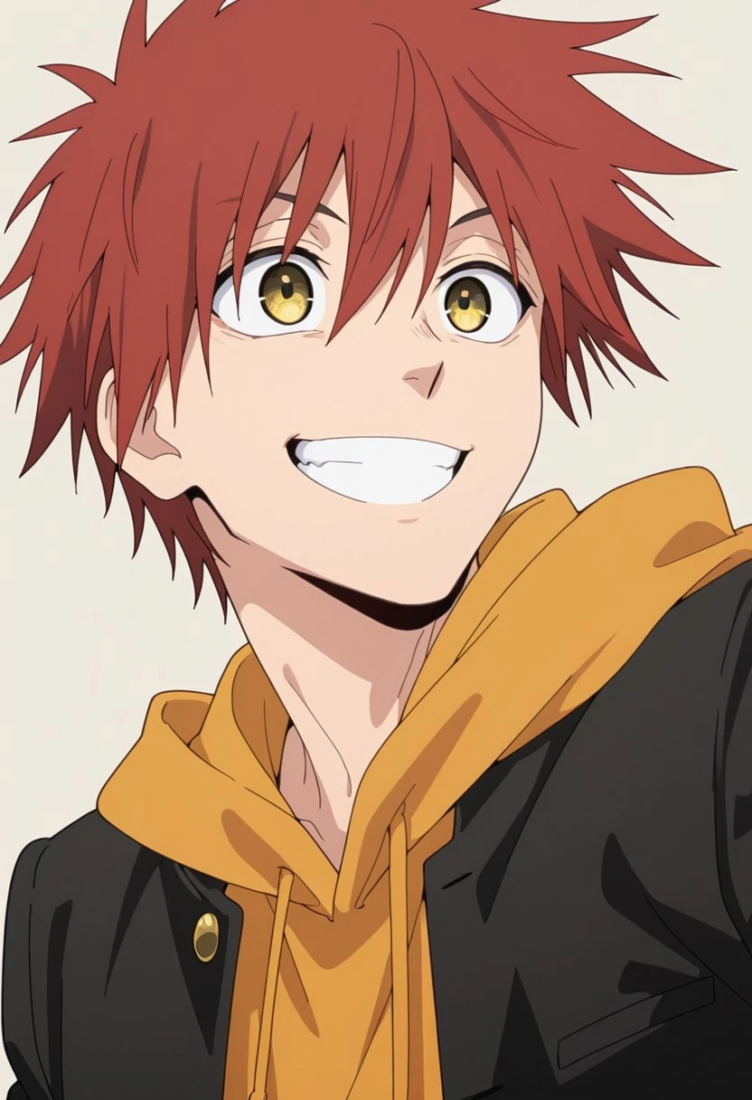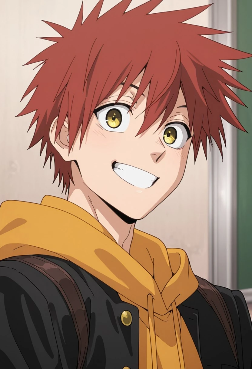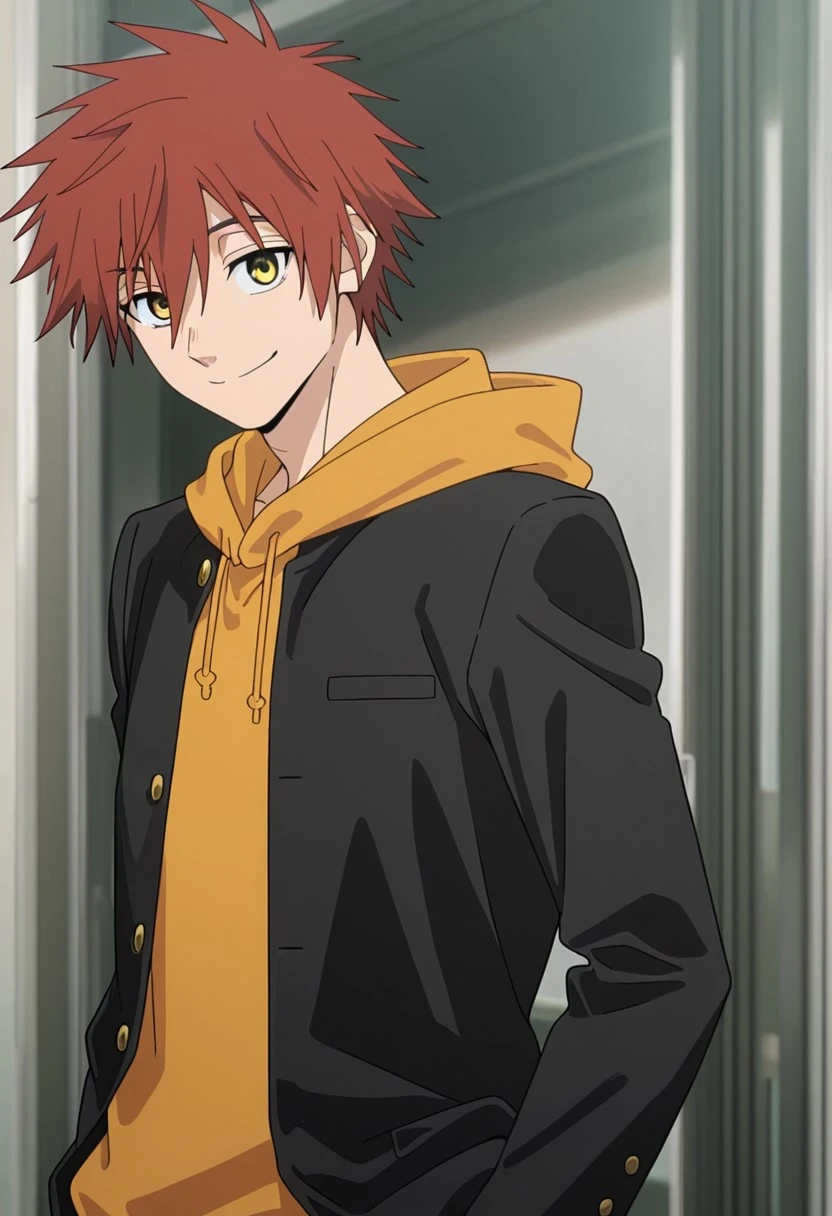 ShohUsam, 1boy, male focus, solo, yellow eyes, red hair, school uniform, orange hoodie, hood, gakuran, black jacket, open jacket, black pants, sneakers, red footwear,