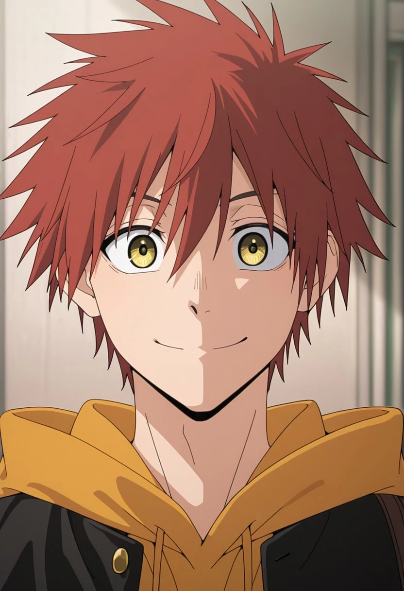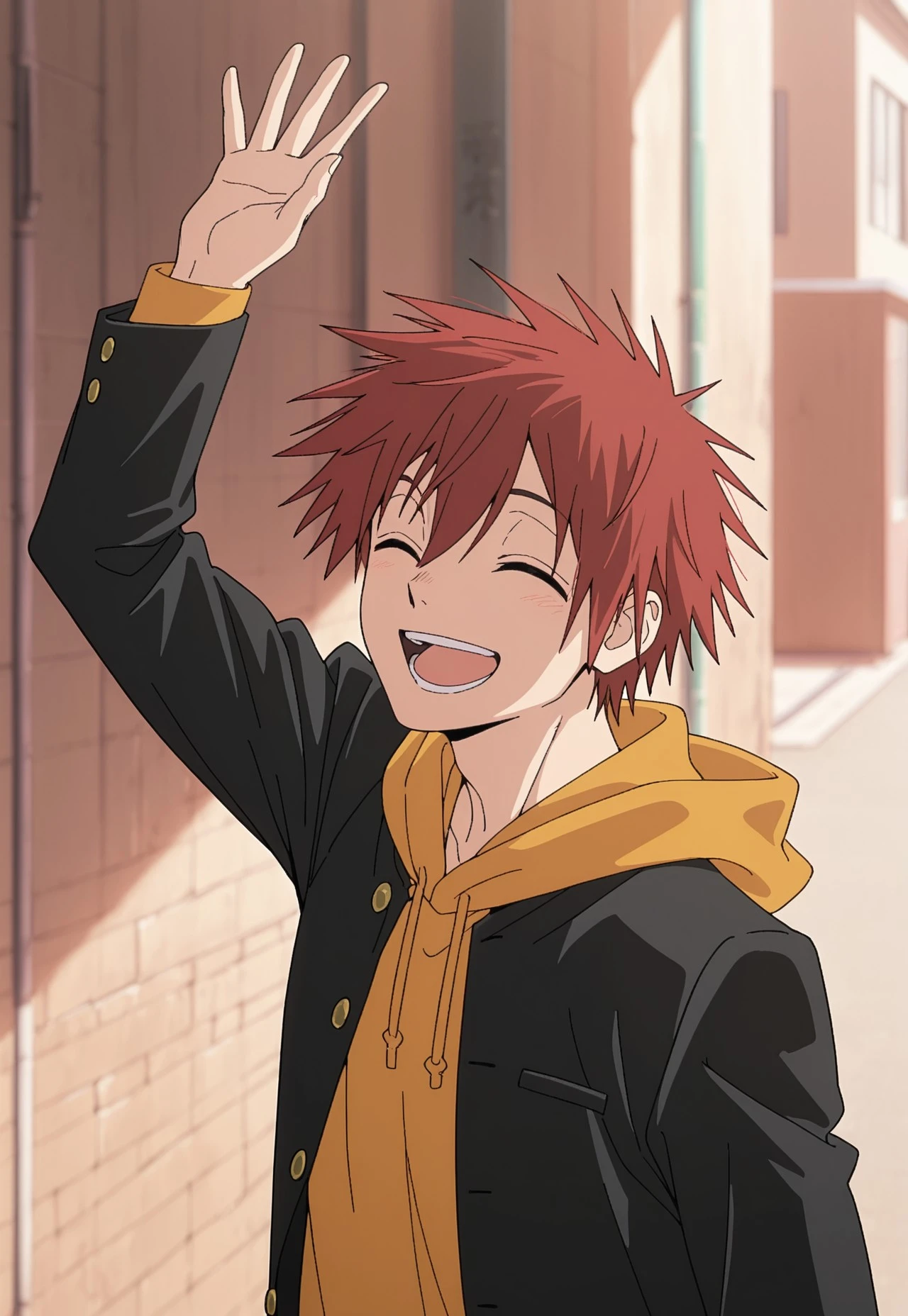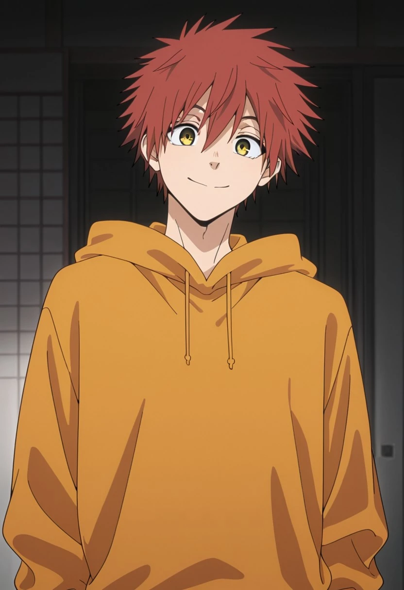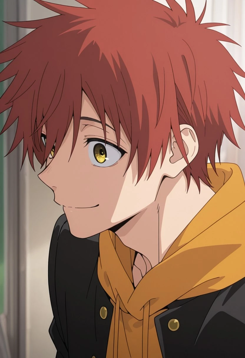 ShohUsam, 1boy, male focus, solo, yellow eyes, red hair, school uniform, orange hoodie, hood, gakuran, black jacket, open jacket, black pants, sneakers, red footwear,
