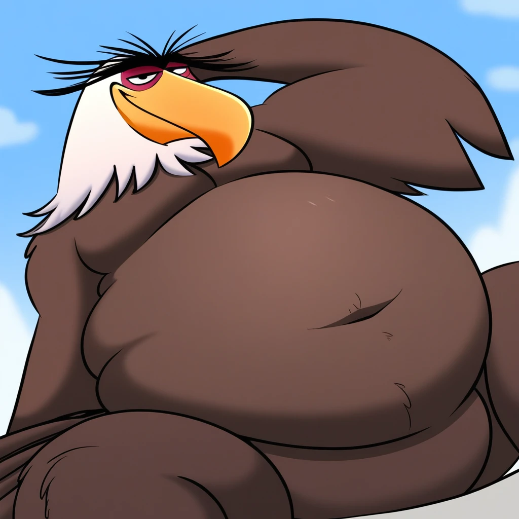 Tags: Mighty Eagle, brown feathers, feathers, bird, eagle, purple eyelids, feathered hands, big feathered hands, bird tail, winged arms, white head, white head feathers, feathered head, tired, eyebags, small pupils, white sclera, large eyebrows, large beak, long yellow beak, short legs, large feet, talons, obese, big belly