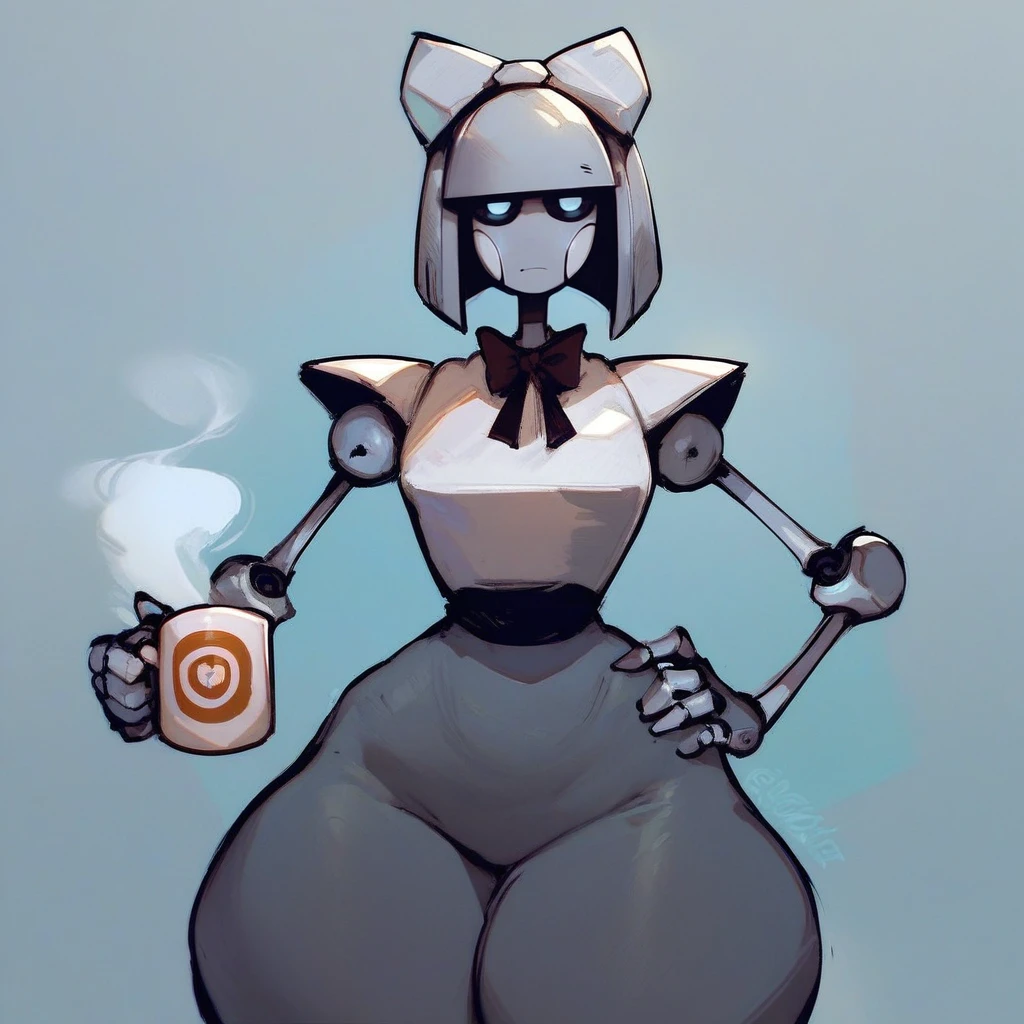 receptionik, grey body, bow on head, bob cut, robot girl, wide hips, black eyes