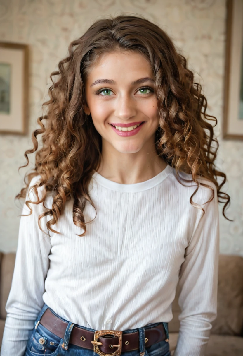 "prompt": "score_9, score_8_up, score_7_up, photo realistic, true to life, highly detailed. solo. 1girl, rebellynn, brown hair, long hair, curly hair. green eyes, very skinny, thin waist, face focus, smile, lips parted, looking away from viewer, headshot, wearing a long sleeve shirt, jeans, belt, jewlery, in a living room",