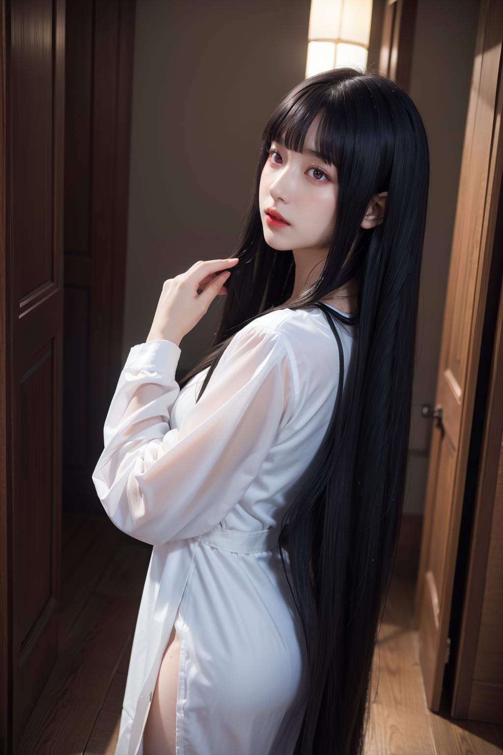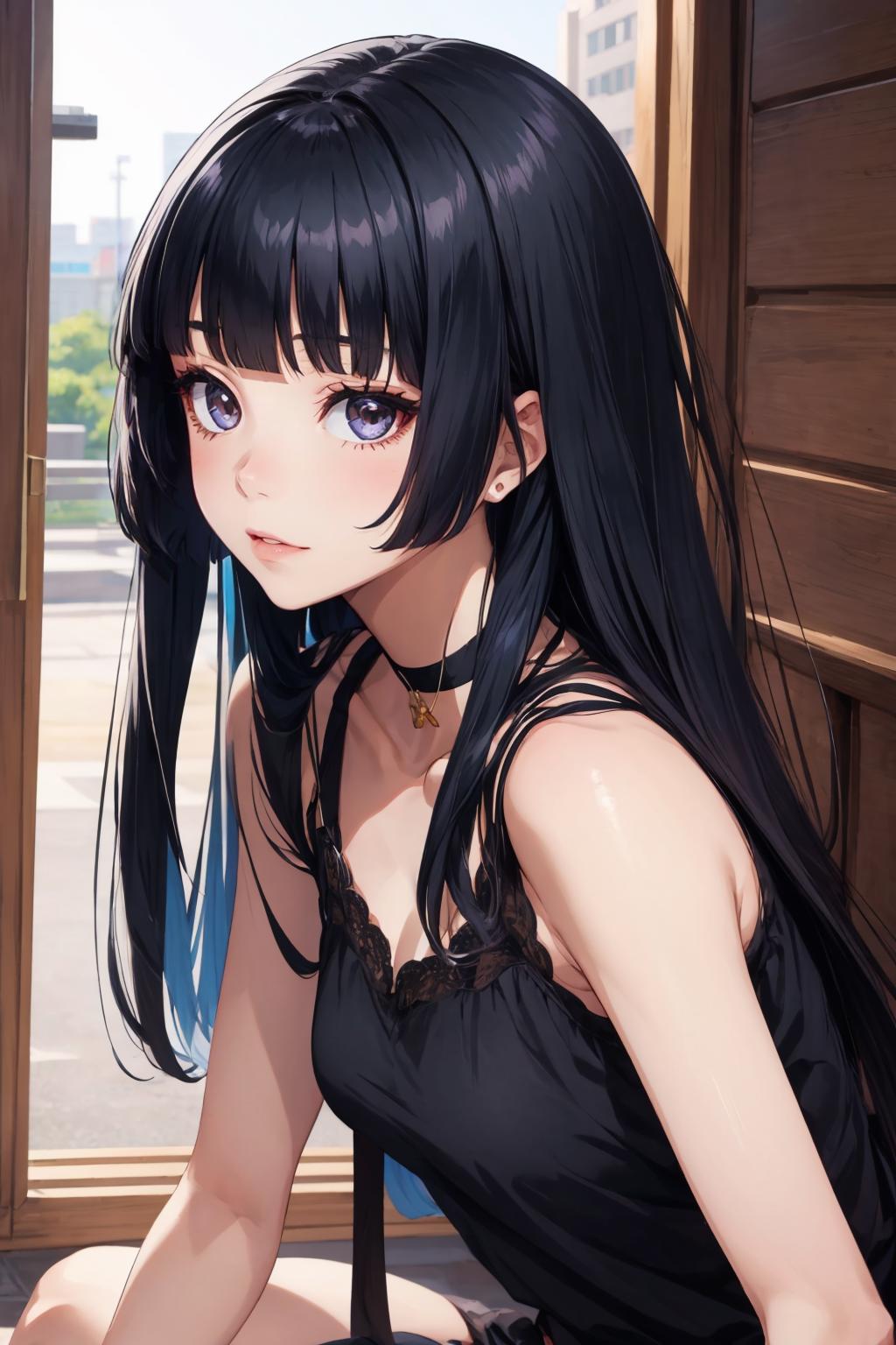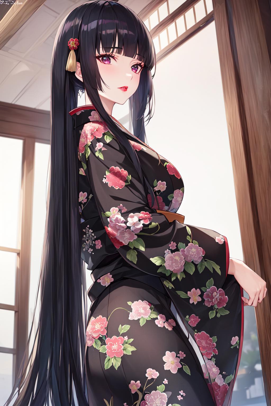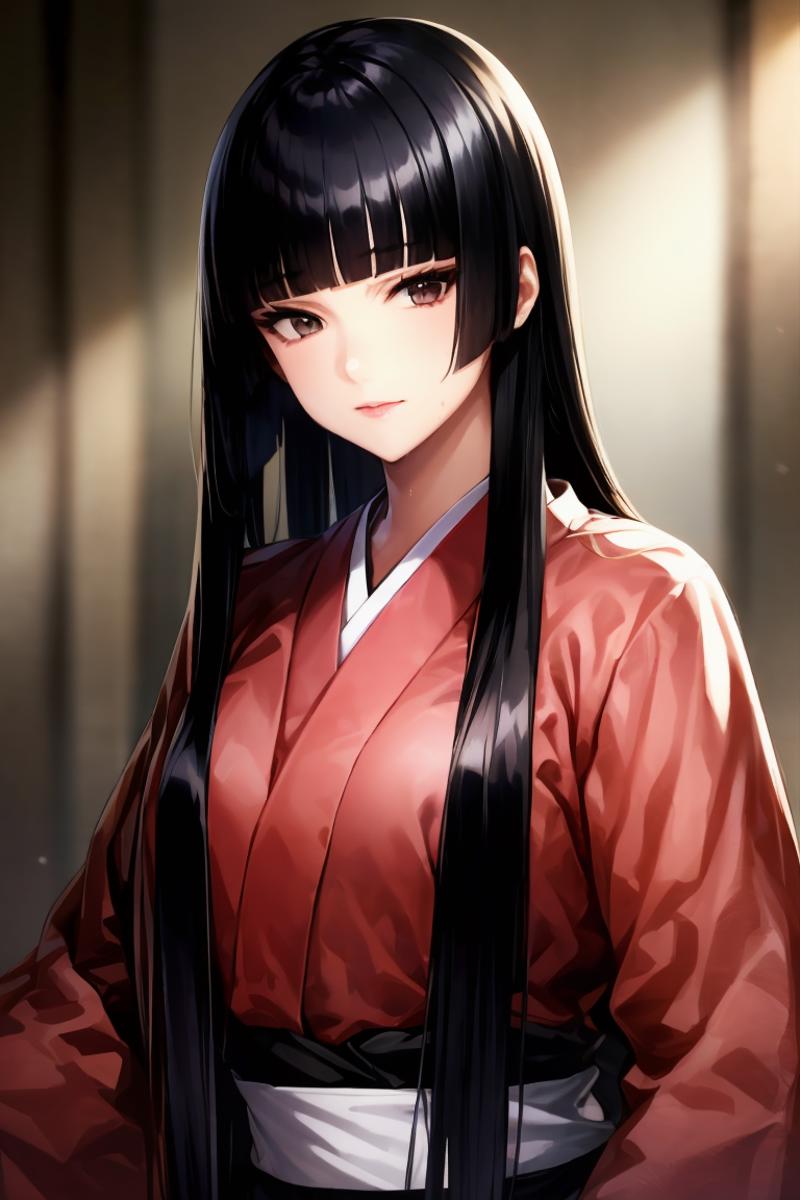 Very long, straight hair with blunted bangs and a hime cut at the front. Often found cascading over the shoulders or body, or gathering into silky pools on the floor.