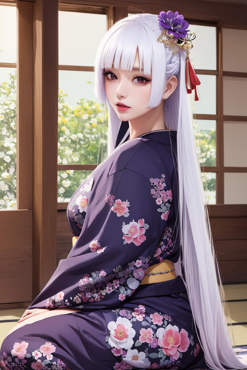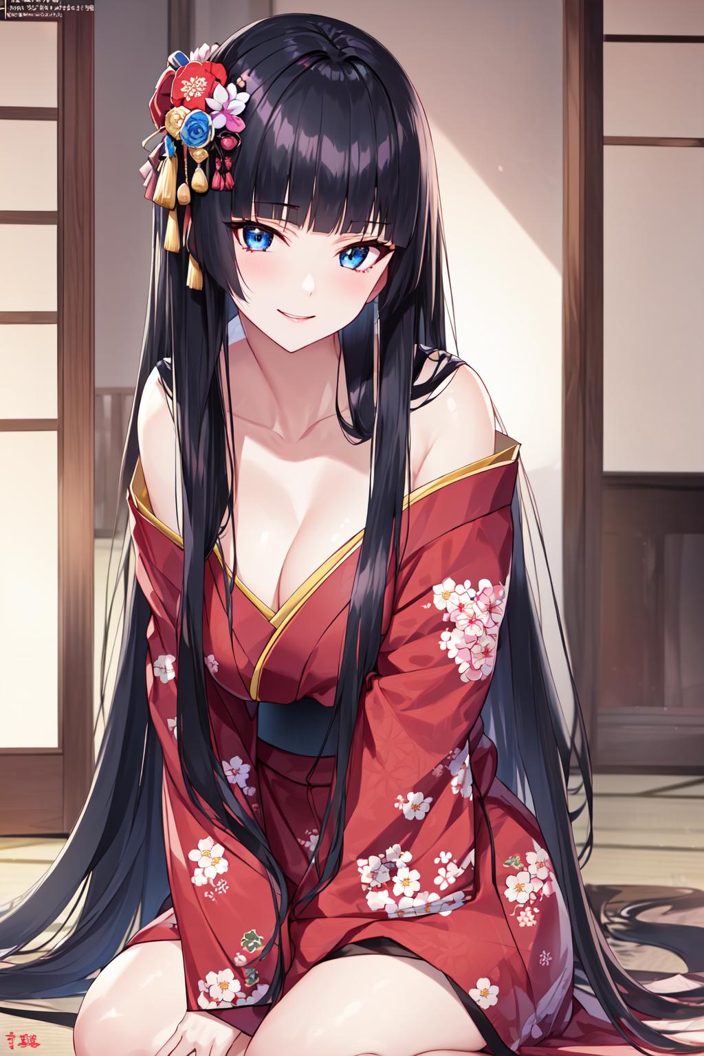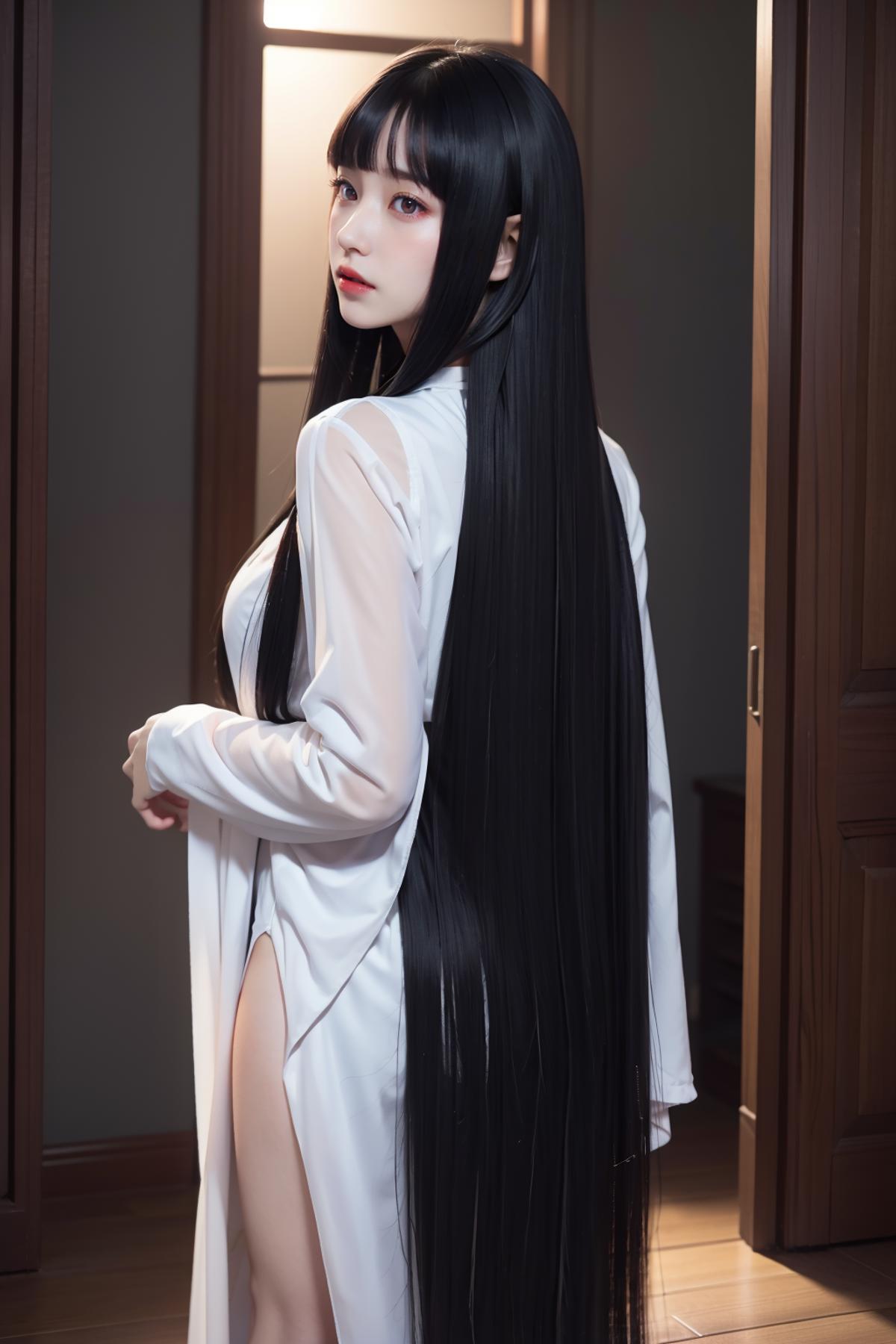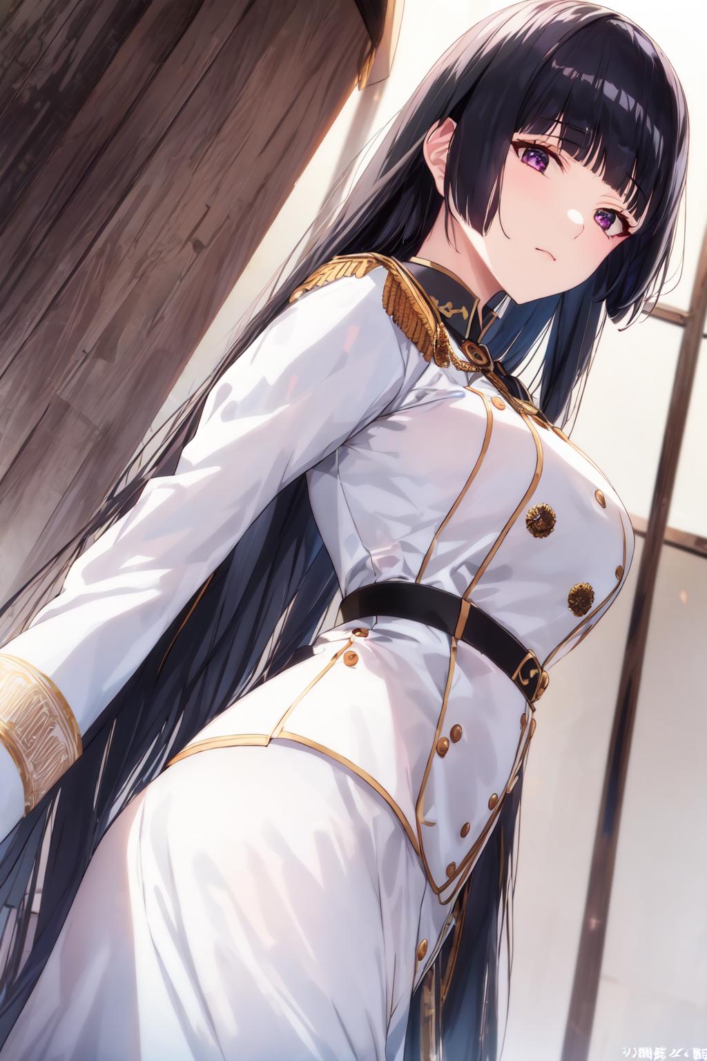 Very long, straight hair with blunted bangs and a hime cut at the front. Often found cascading over the shoulders or body, or gathering into silky pools on the floor.