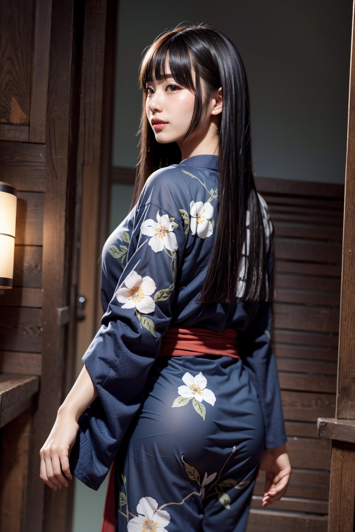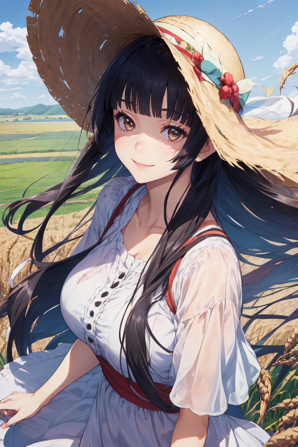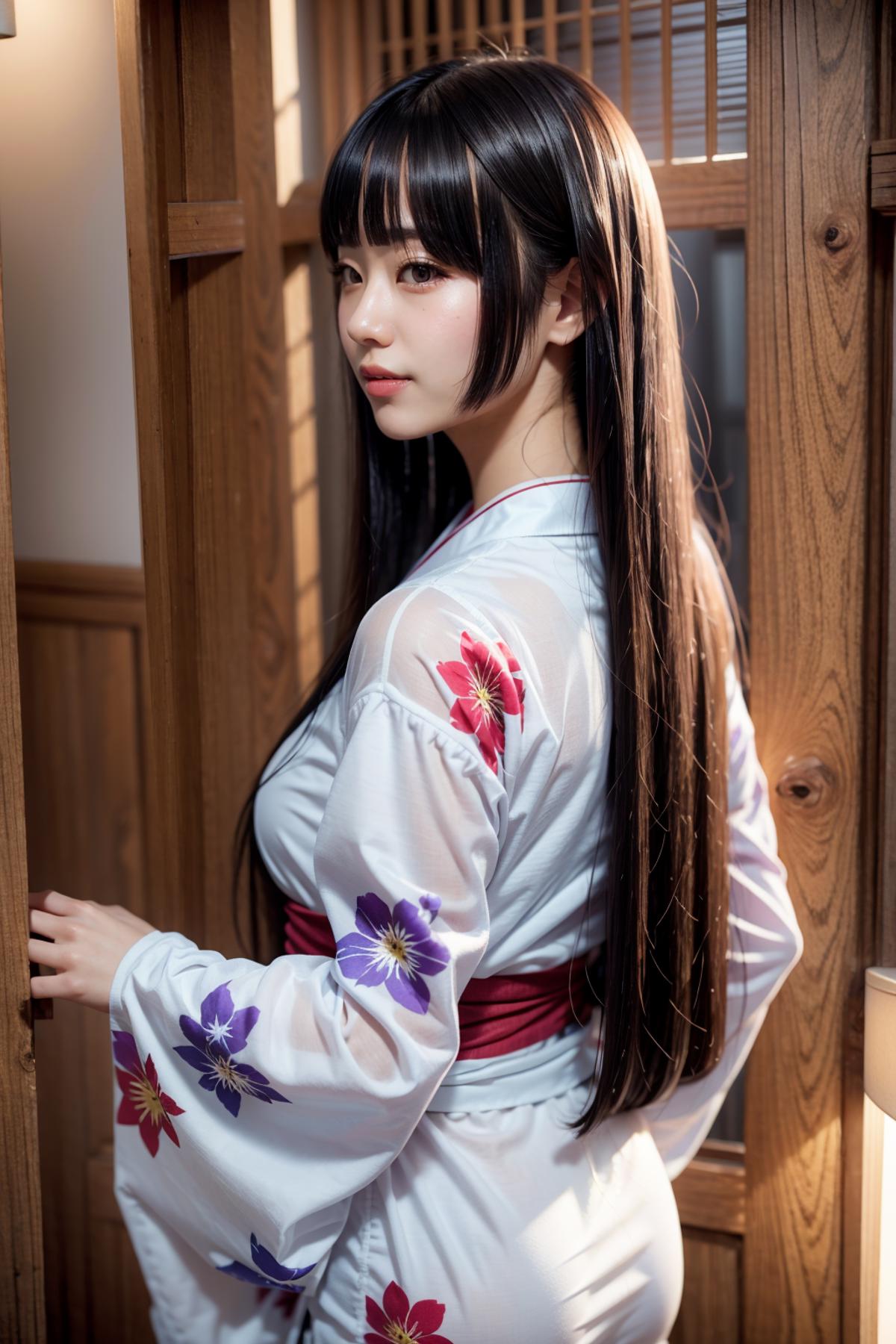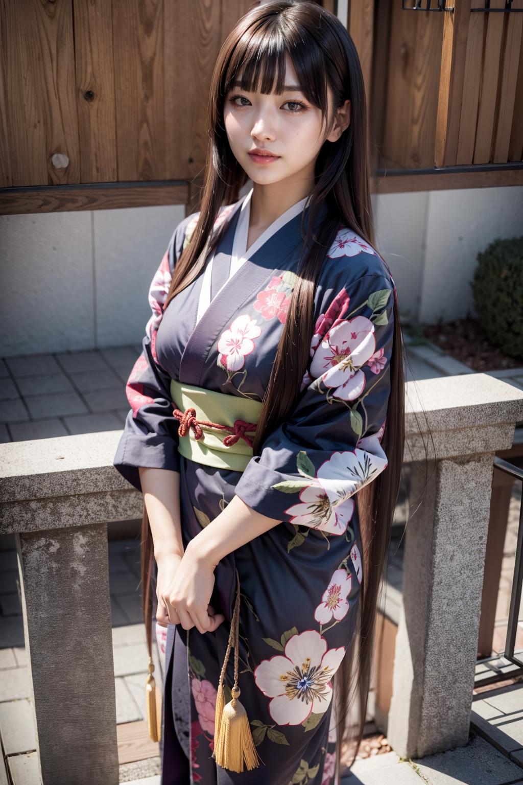 Very long, straight hair with blunted bangs and a hime cut at the front. Often found cascading over the shoulders or body, or gathering into silky pools on the floor.