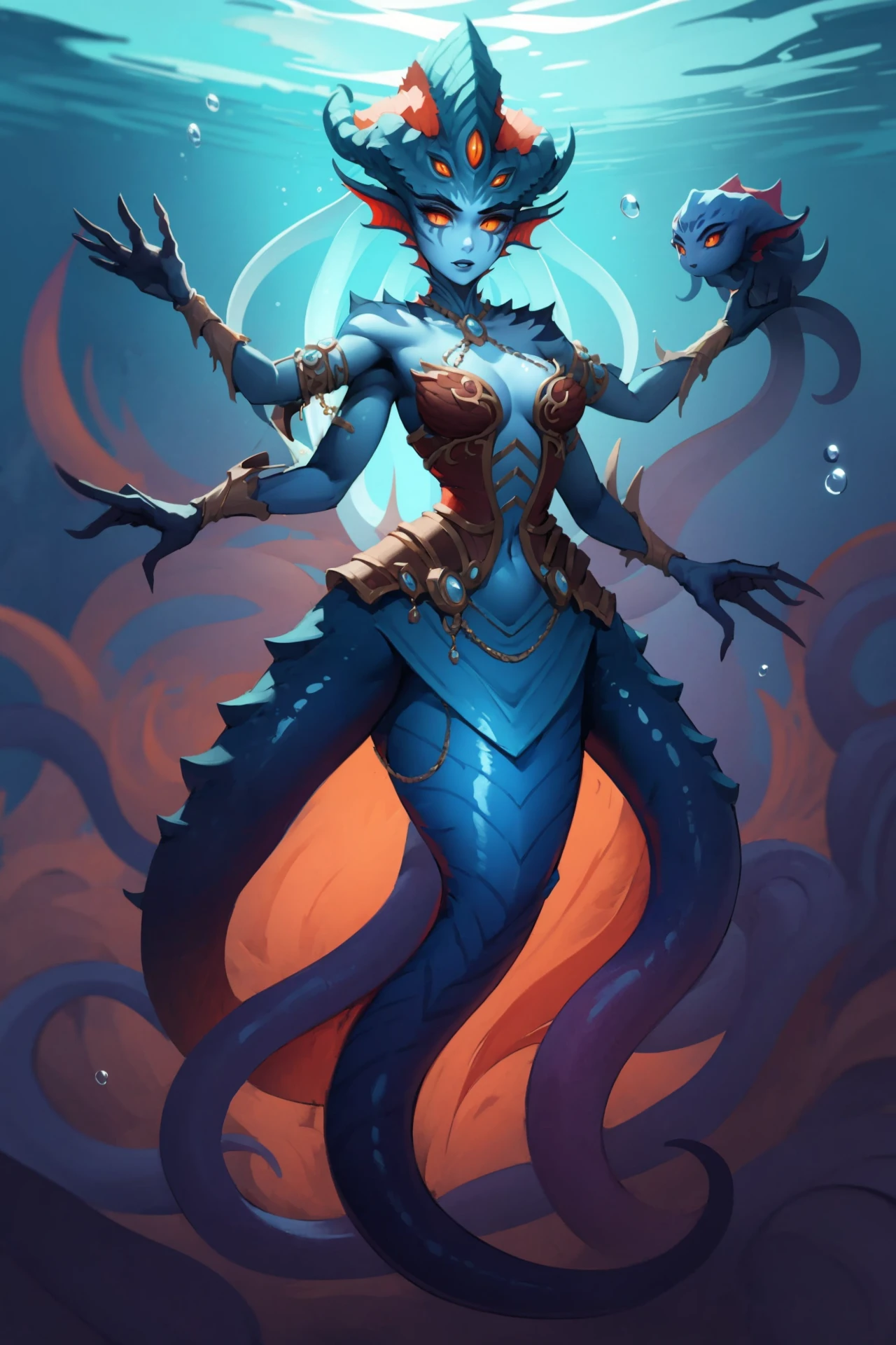 > Recommended additions: colored skin, grey skin, multiple eyes, orange eyes, tentacle hair, jewelry, corset, dark background, full body, octopus lower body, tentacles, multiple hands.