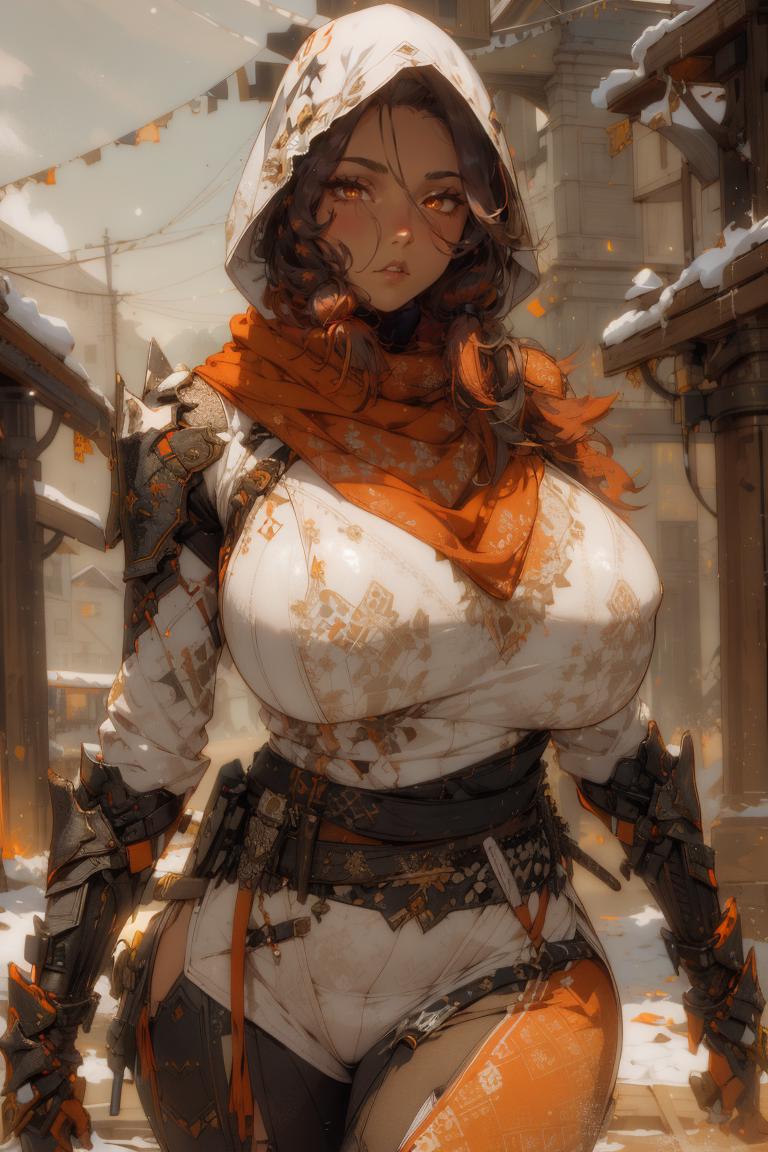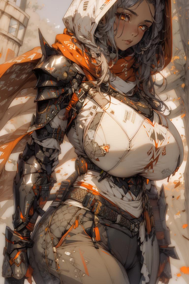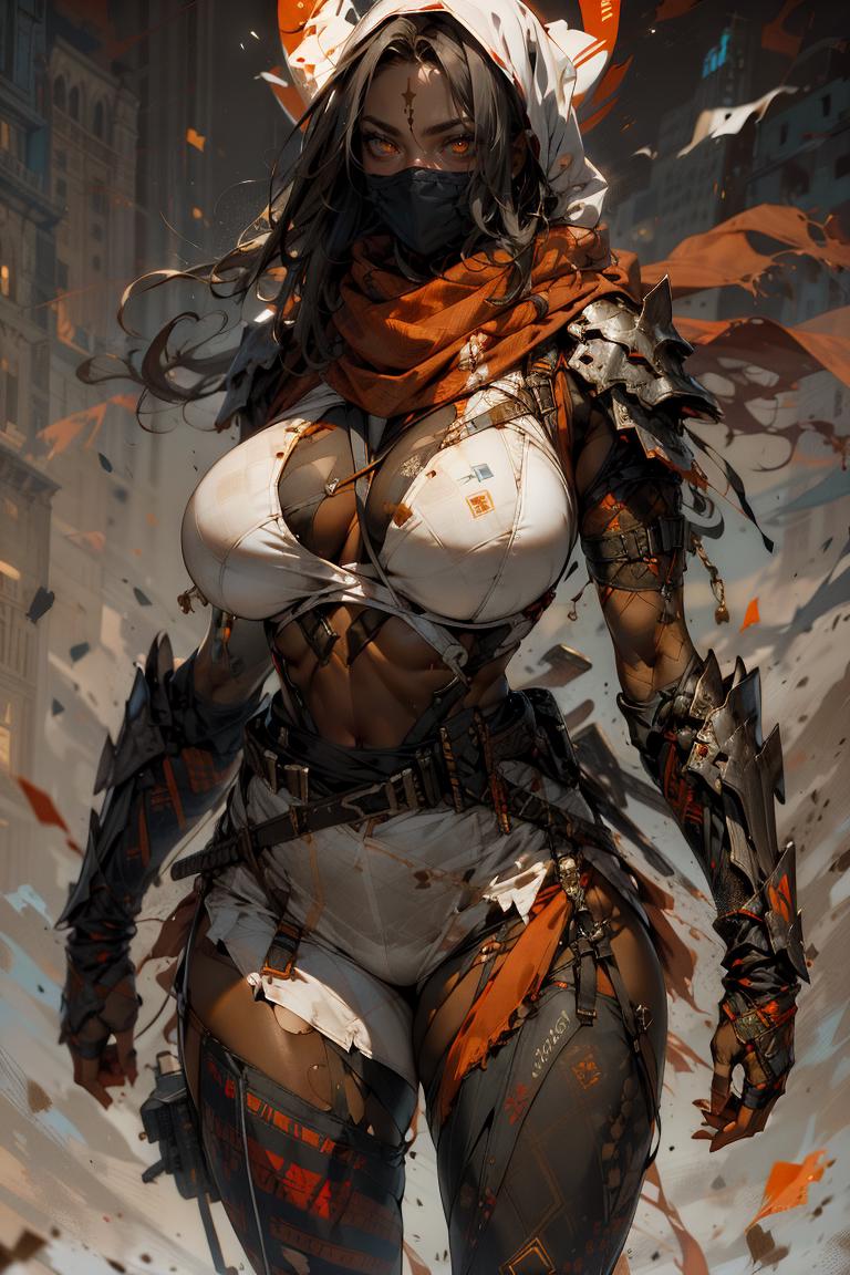 Default: landstyleshinobi, 1girl, hood, dark skin, belt, armor, shoulder armor, weapon, scarf, torn clothes, gauntlets, orange eyes