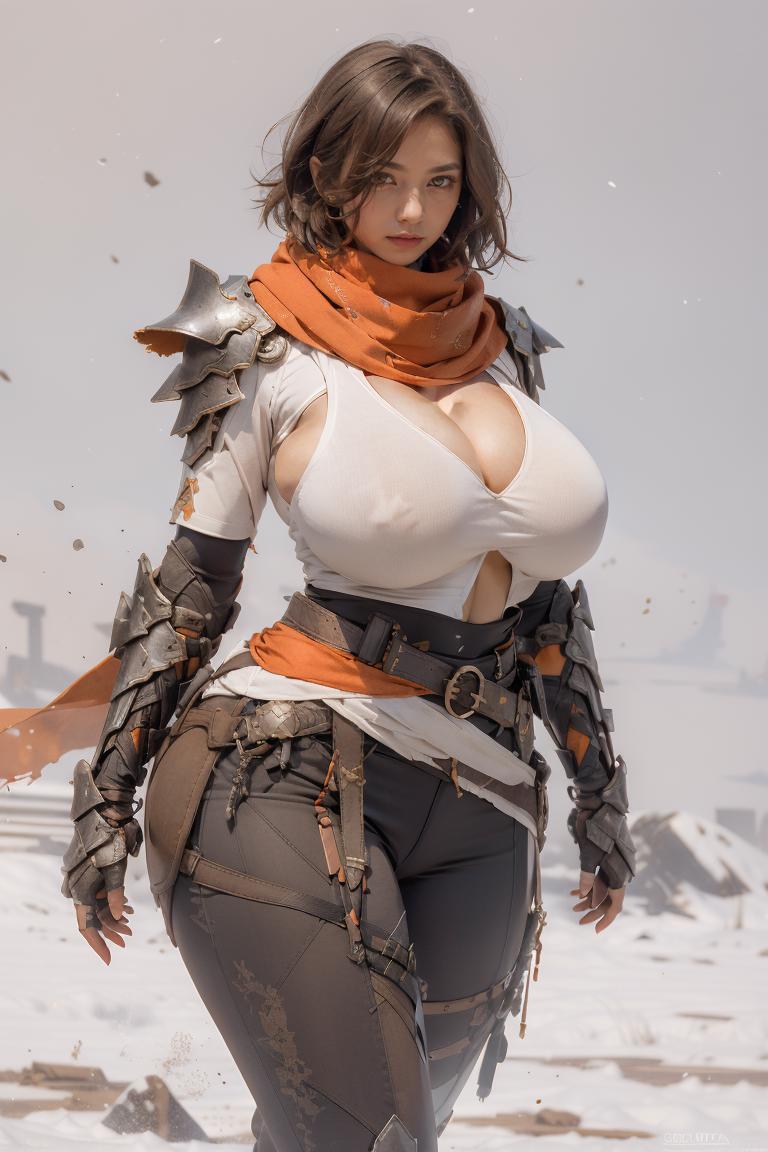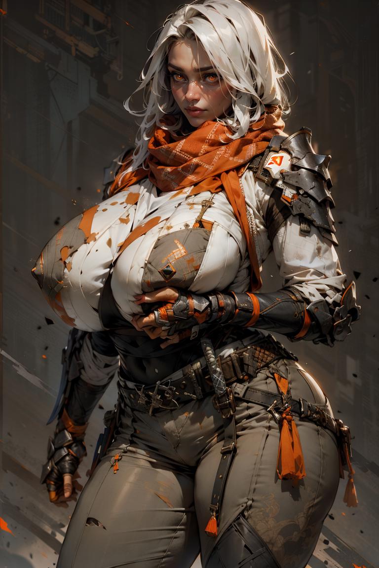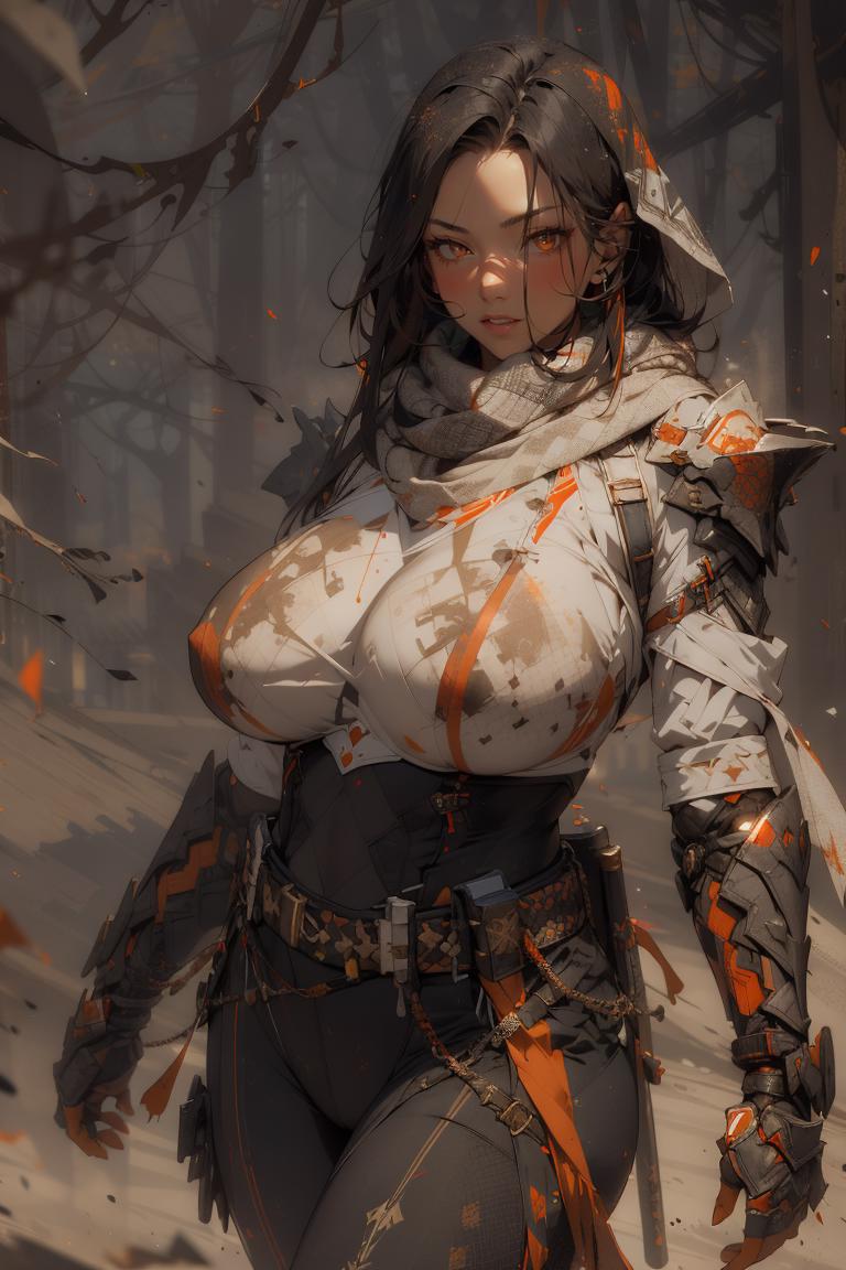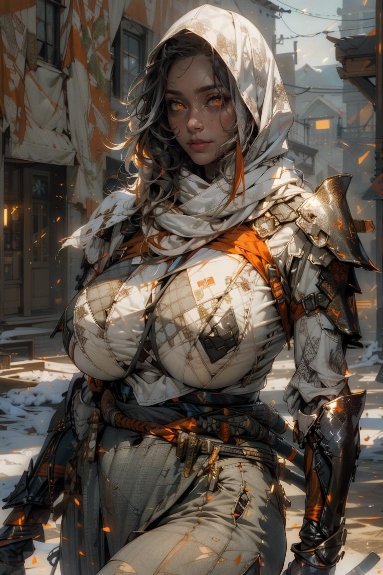 Default: landstyleshinobi, 1girl, hood, dark skin, belt, armor, shoulder armor, weapon, scarf, torn clothes, gauntlets, orange eyes