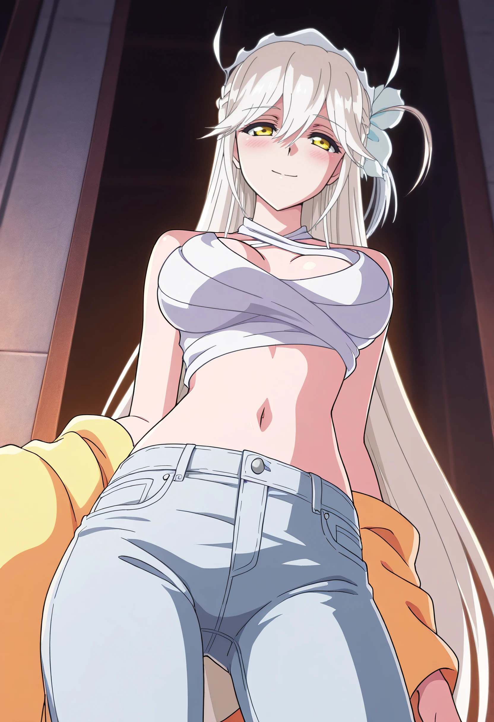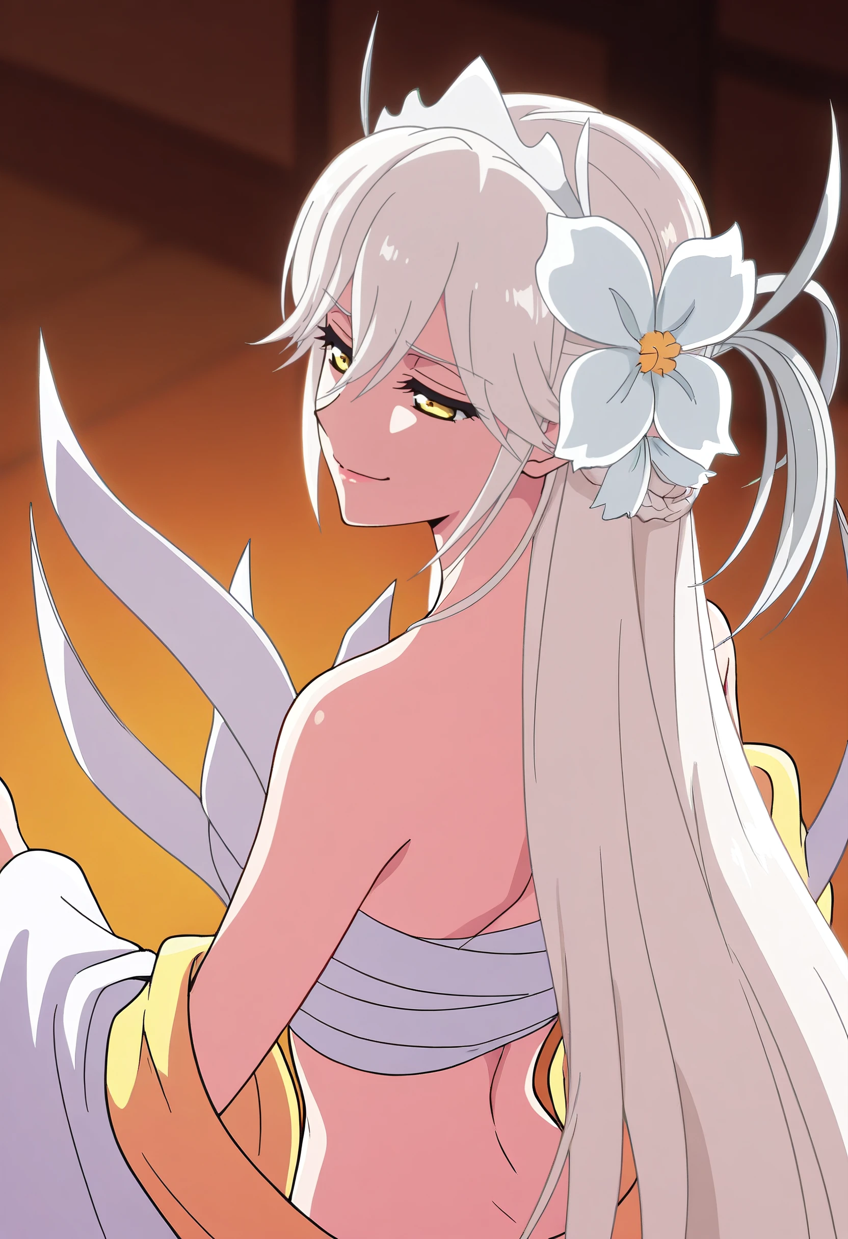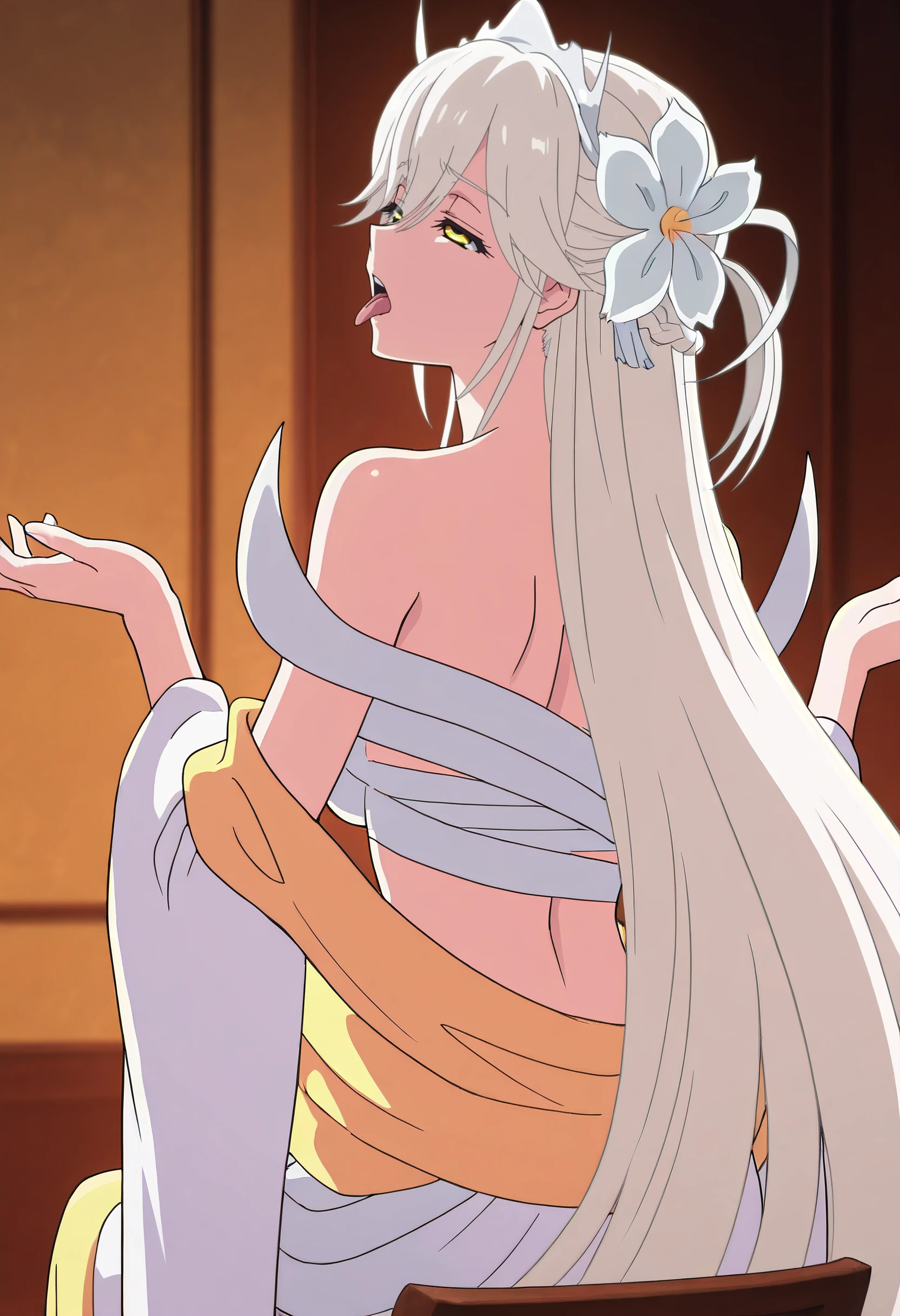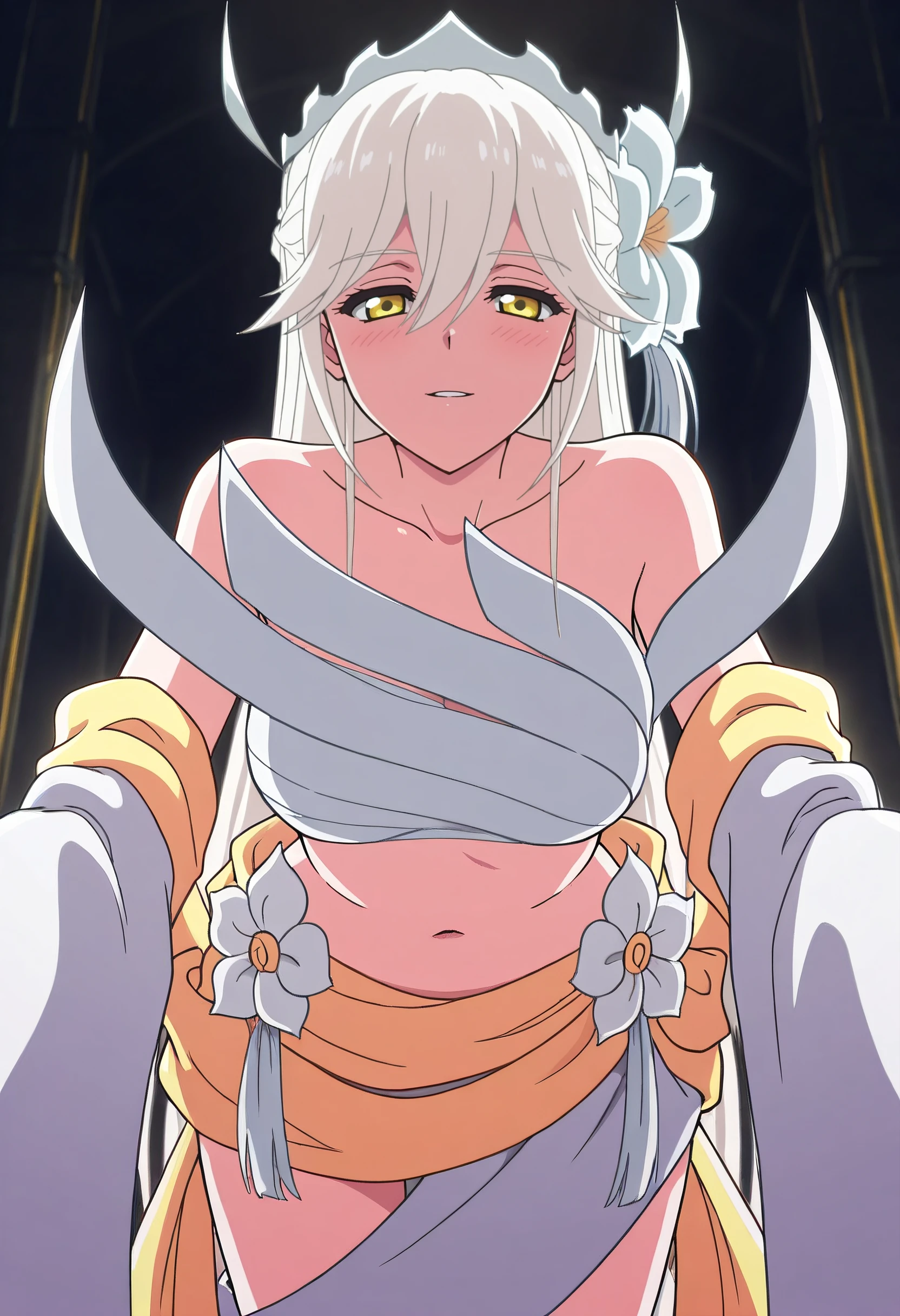 ViciusOutfit, bare shoulders, hair ornament, flower, hair flower, dress, japanese clothes, ribbon, off shoulder, navel, nude, wide sleeves, white dress, long sleeves, sarashi, detached sleeves, tiara, hair flaps, white flower, midriff,