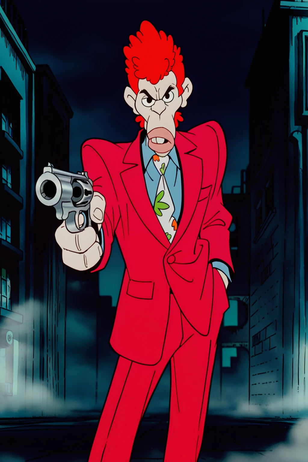 1boy, male focus, buck teeth, red hair, afro, curly hair, short hair, sideburns, ugly, tired, bags under eyes, long neck, pointy nose, long nose, red suit, loose clothes, red pants, shoes