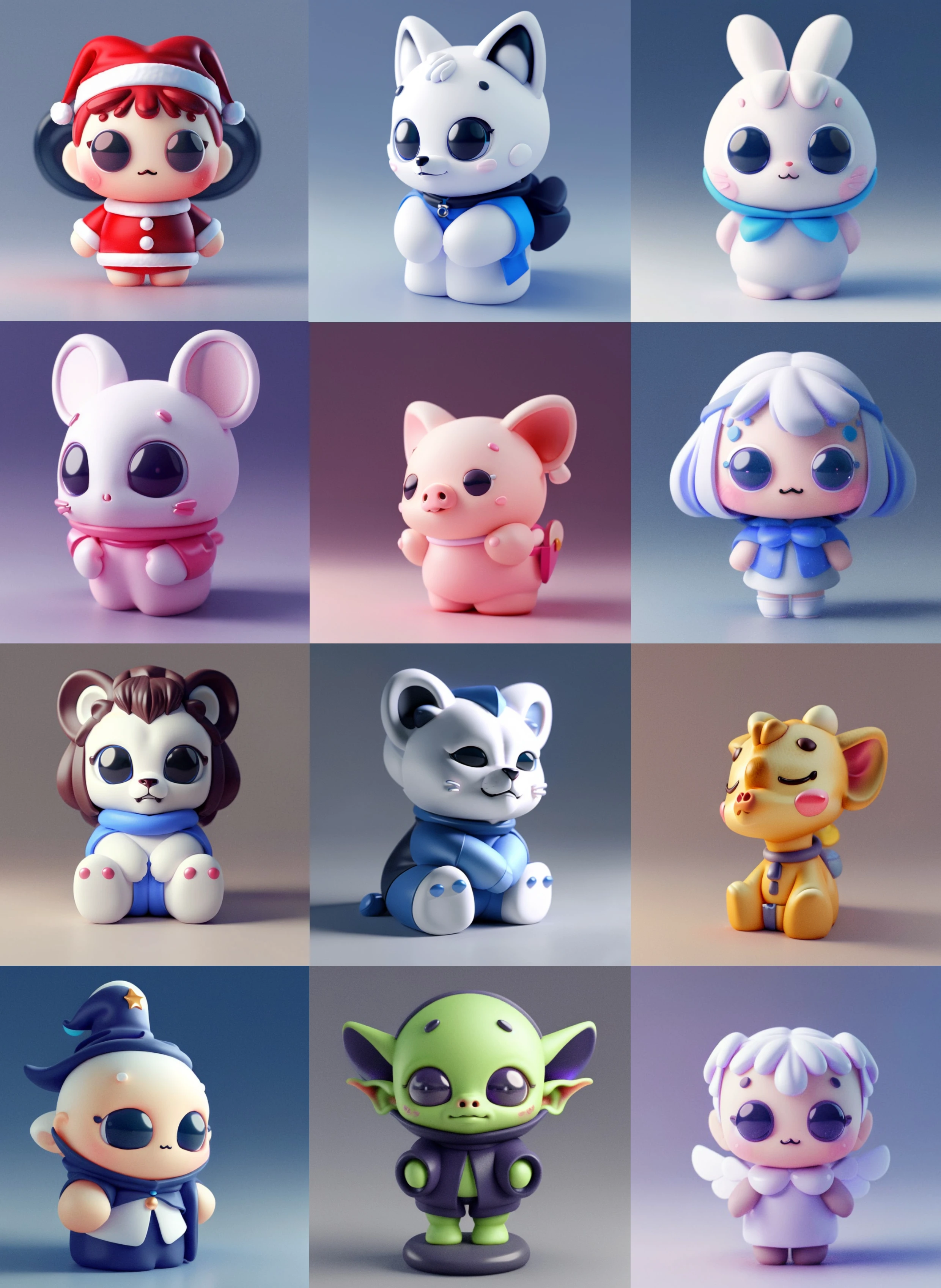这是一个可以生成各种大眼睛萌萌哒的卡通形象的lora模型,特别适合用于卡通IP形象和盲盒公仔设计;