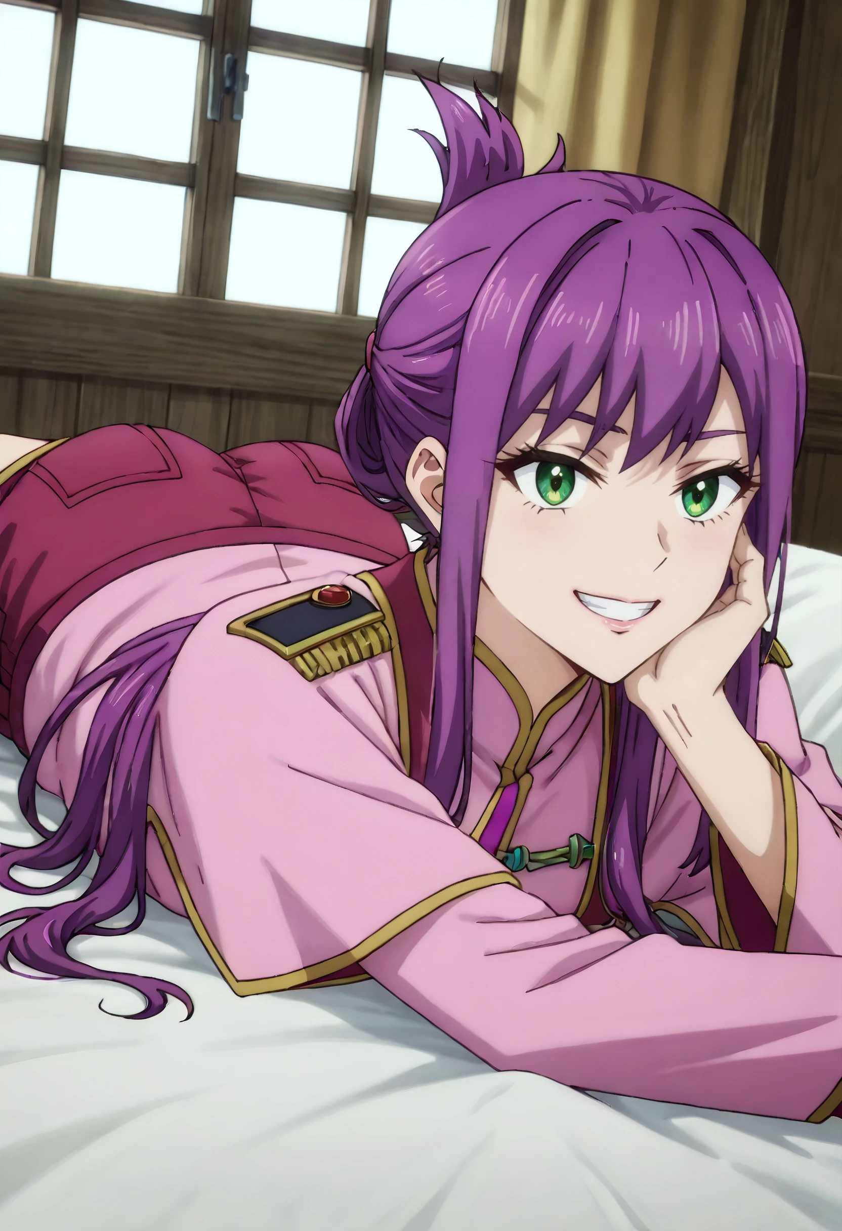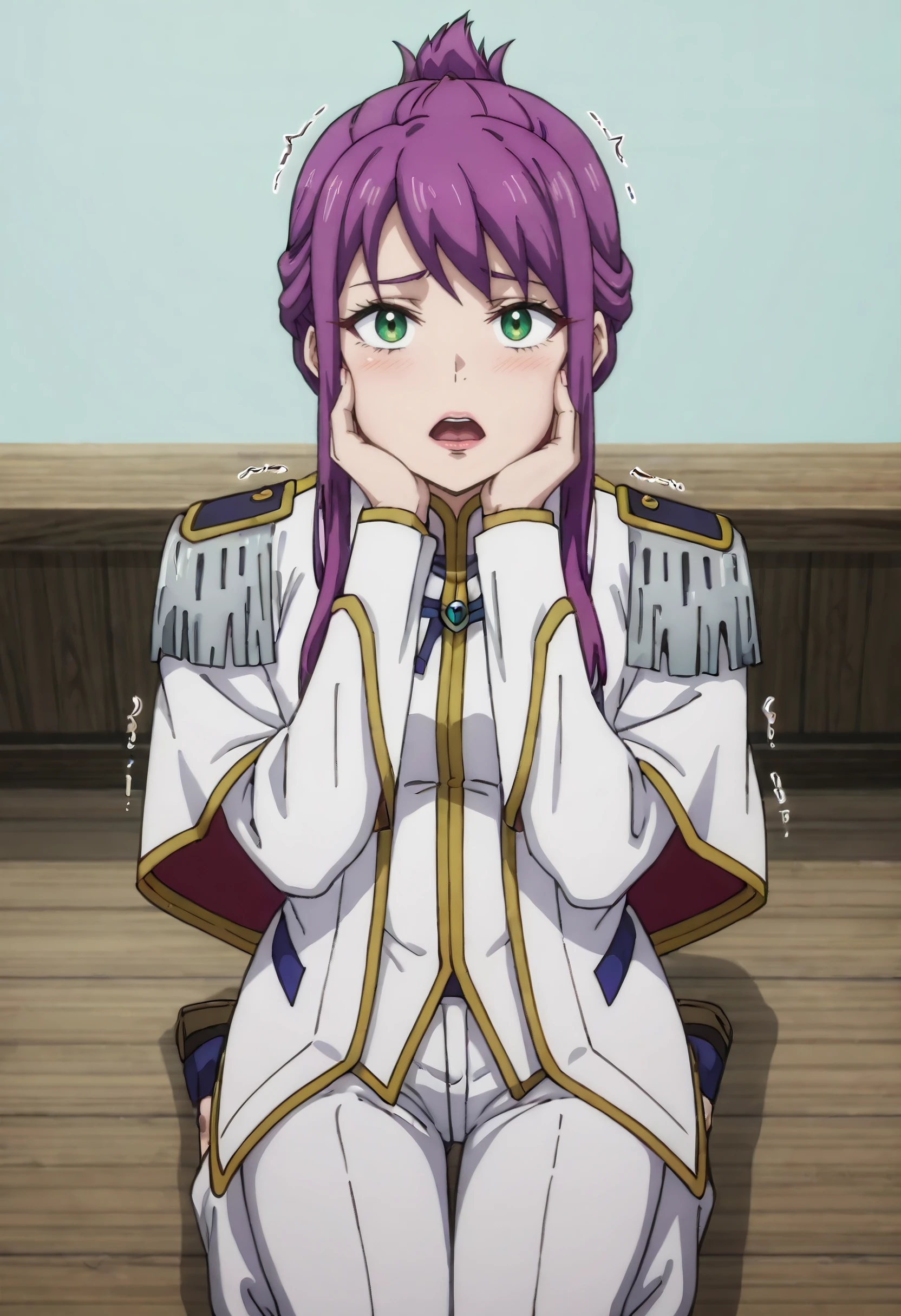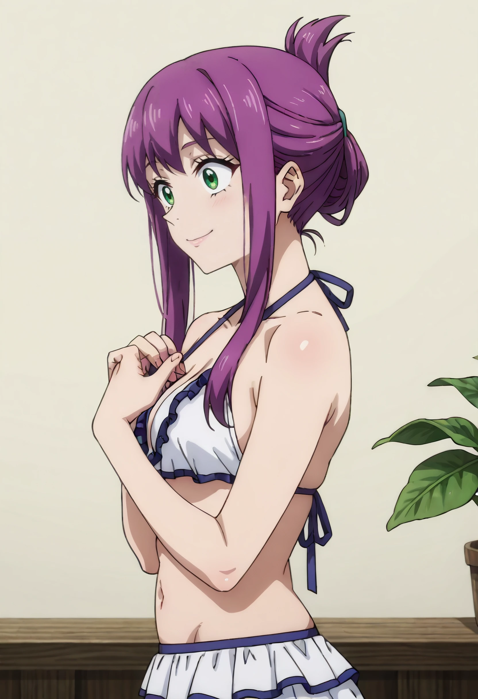 HNMFlore, purple hair, sidelocks, green eyes, long hair, short hair with long locks, folded ponytail, hair up, updo,